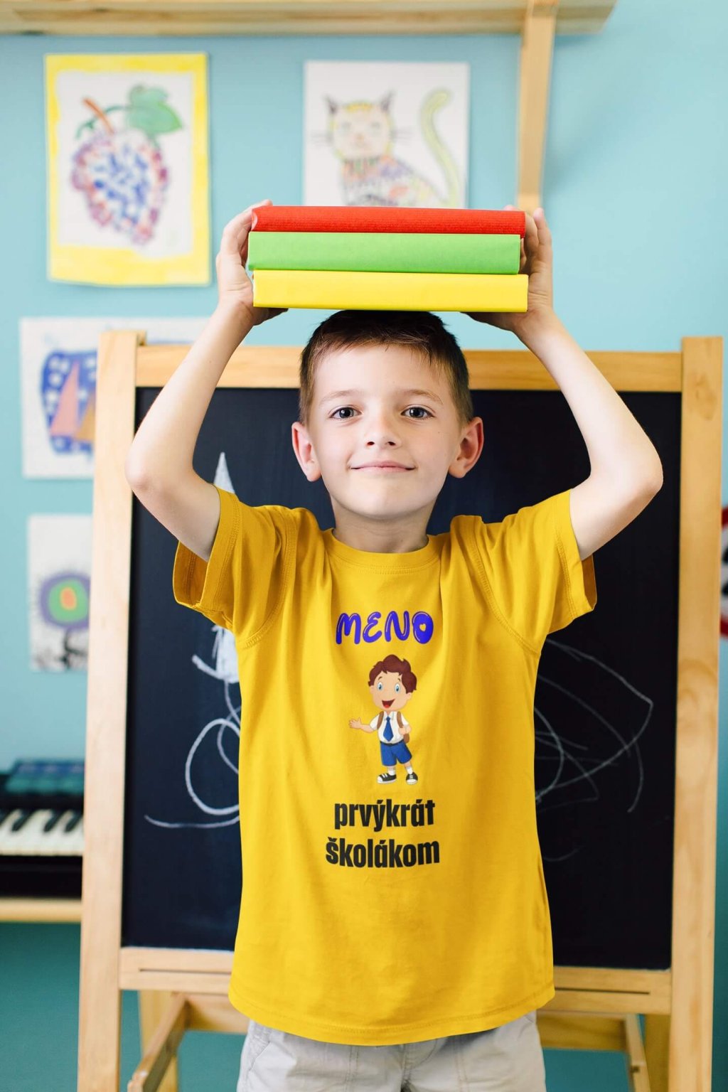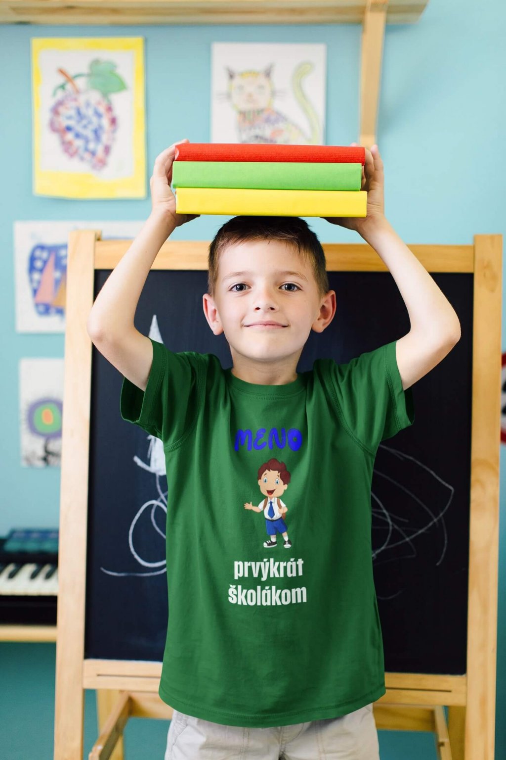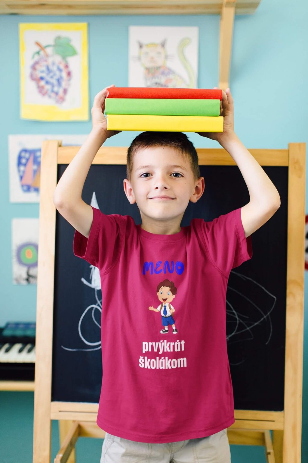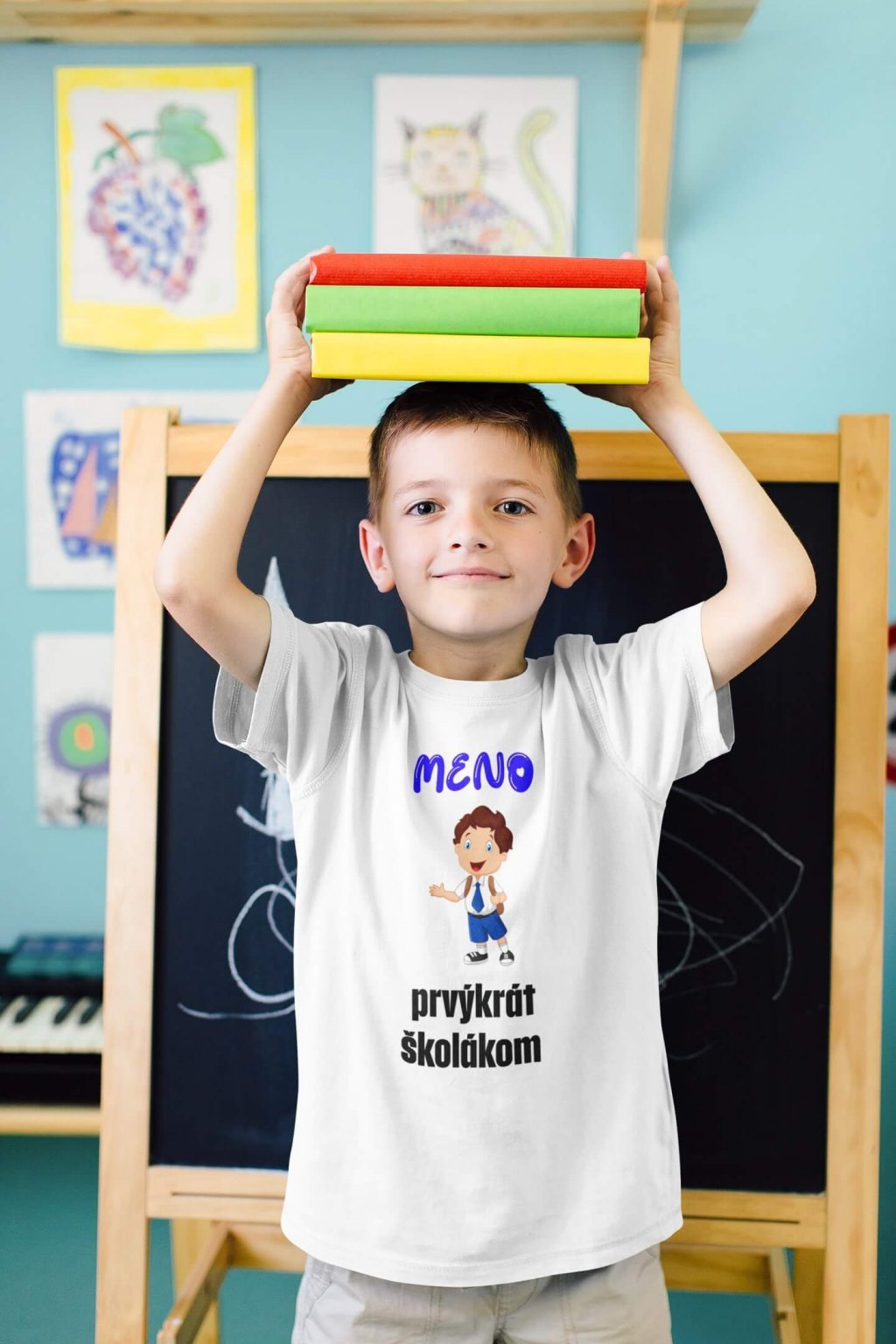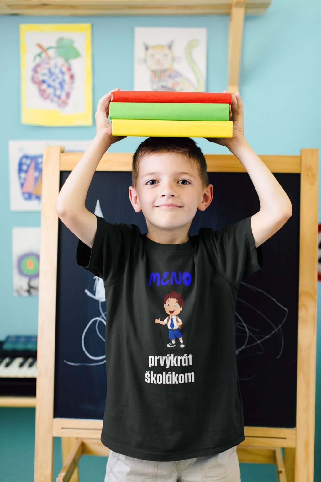 Chlapčenské bavlnené tričko s nápisom a obrázkom. Na tričku je napísané "prvý krát školákom", nad tento nápis je možné si vložiť vlastné meno, kt. treba zadať v poznámke.