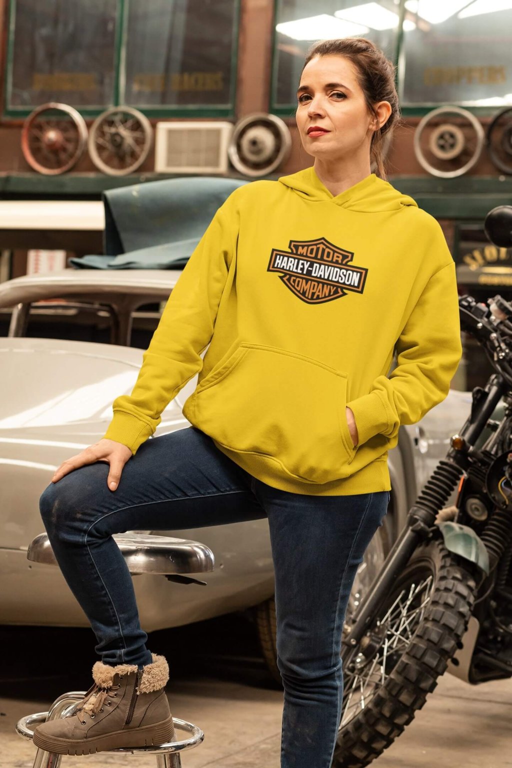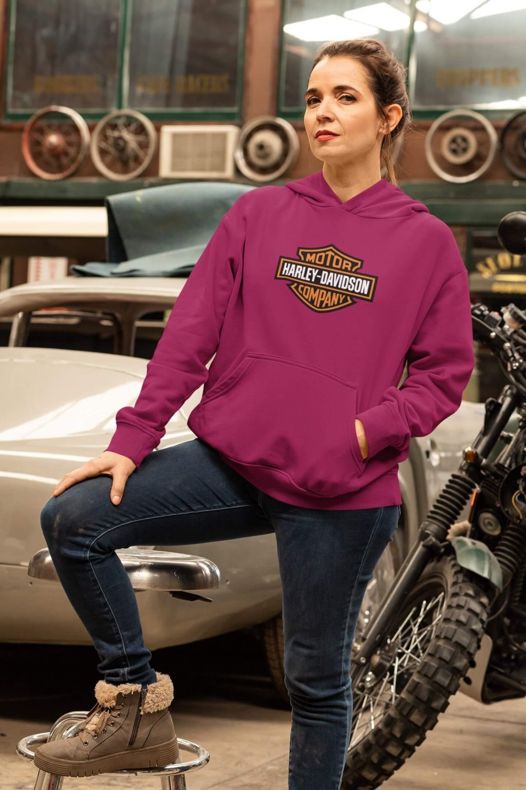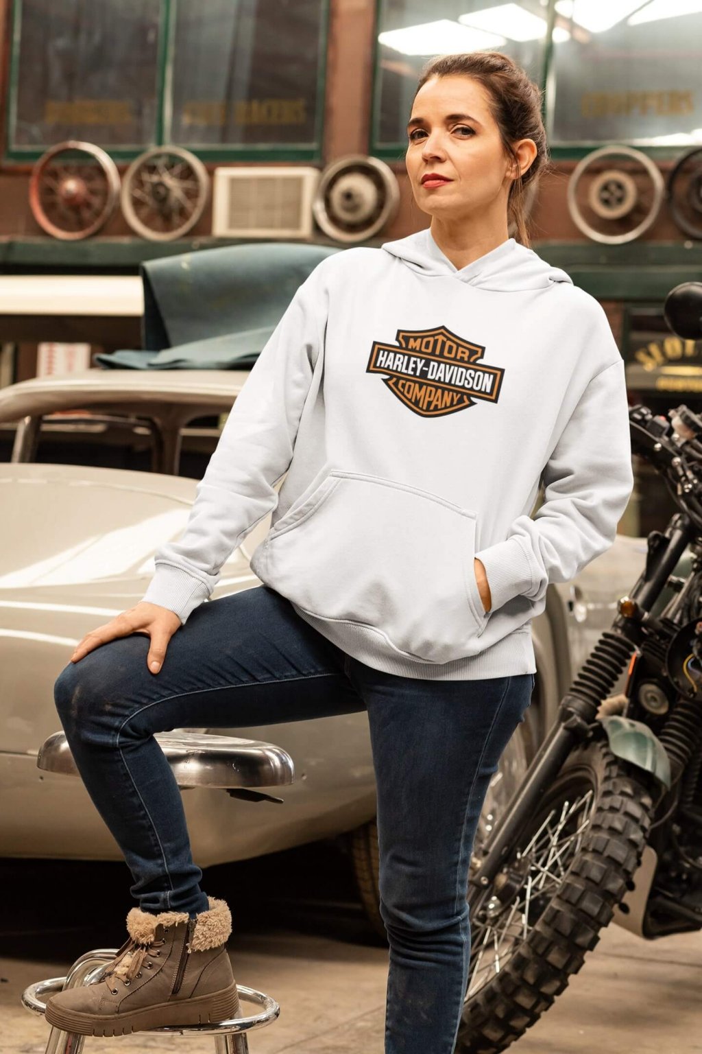 Dámska bavlnená mikina s kapucňou a motorkárskou potlačou. Na originálnej mikine je logo značky Harley Davidson.