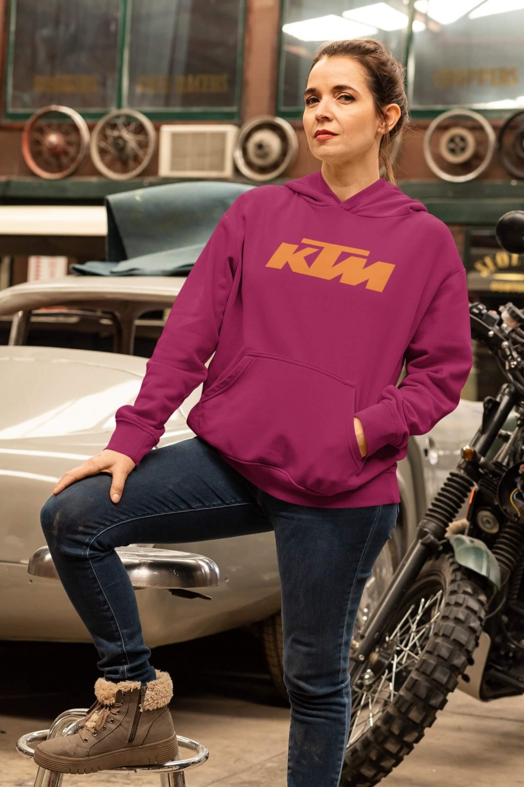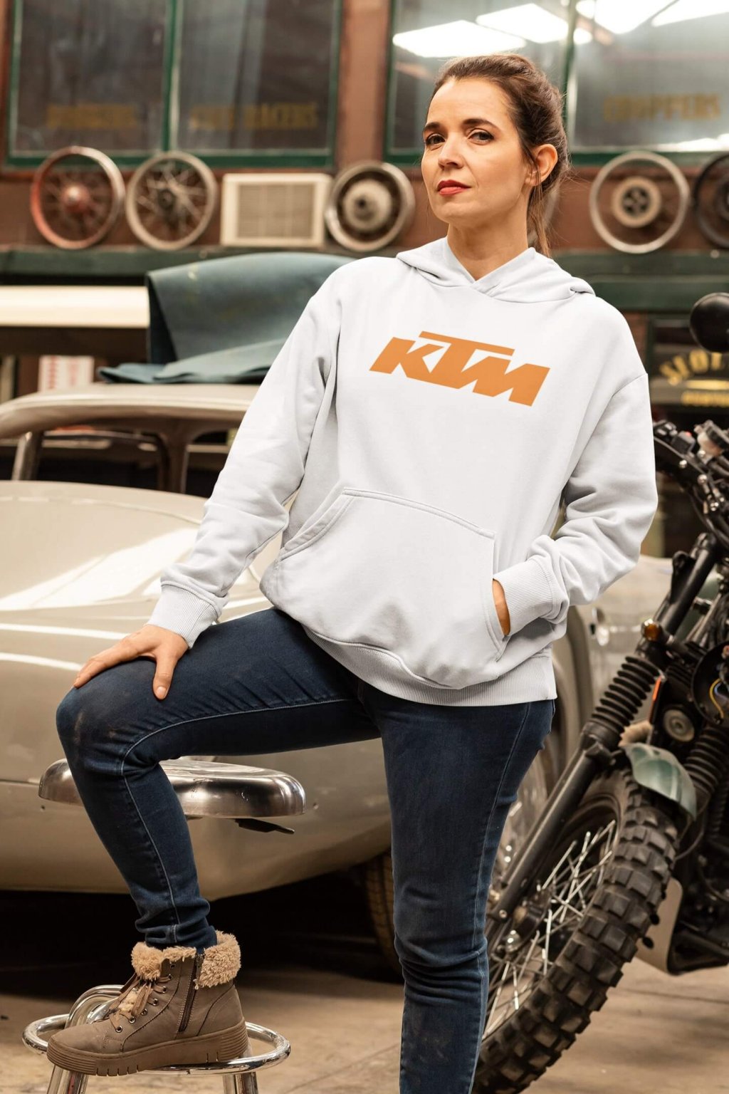 Dámska bavlnená mikina s kapucňou a motorkárskou potlačou. Na originálnej mikine je logo značky KTM.