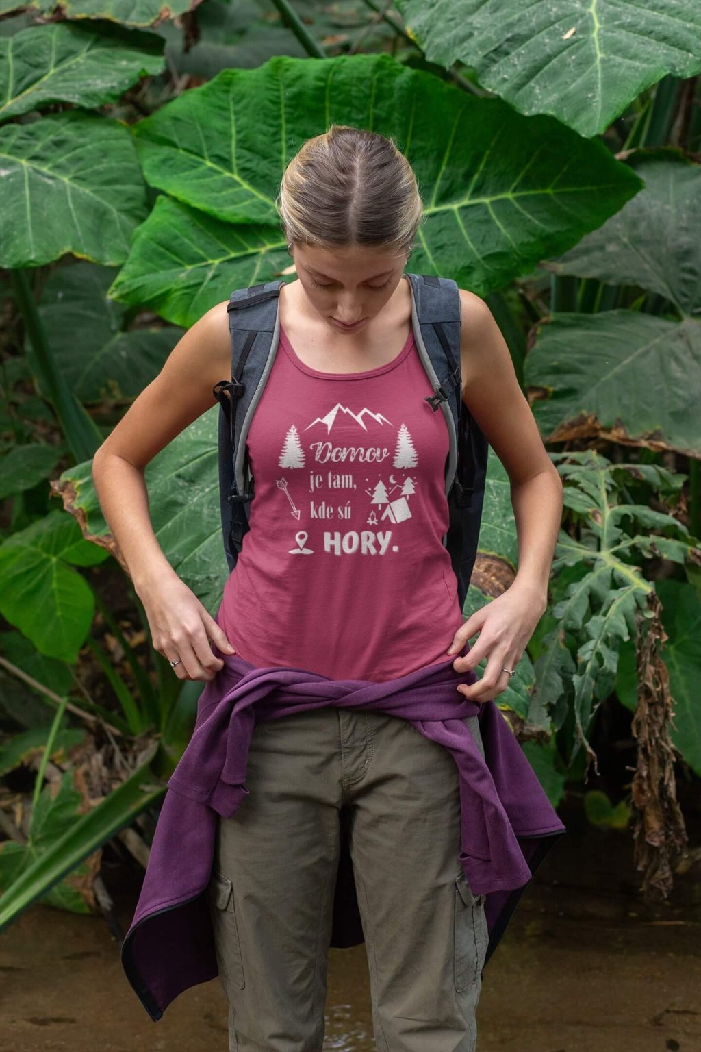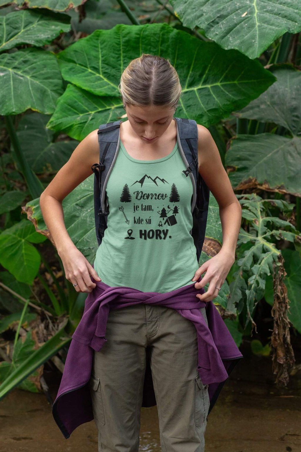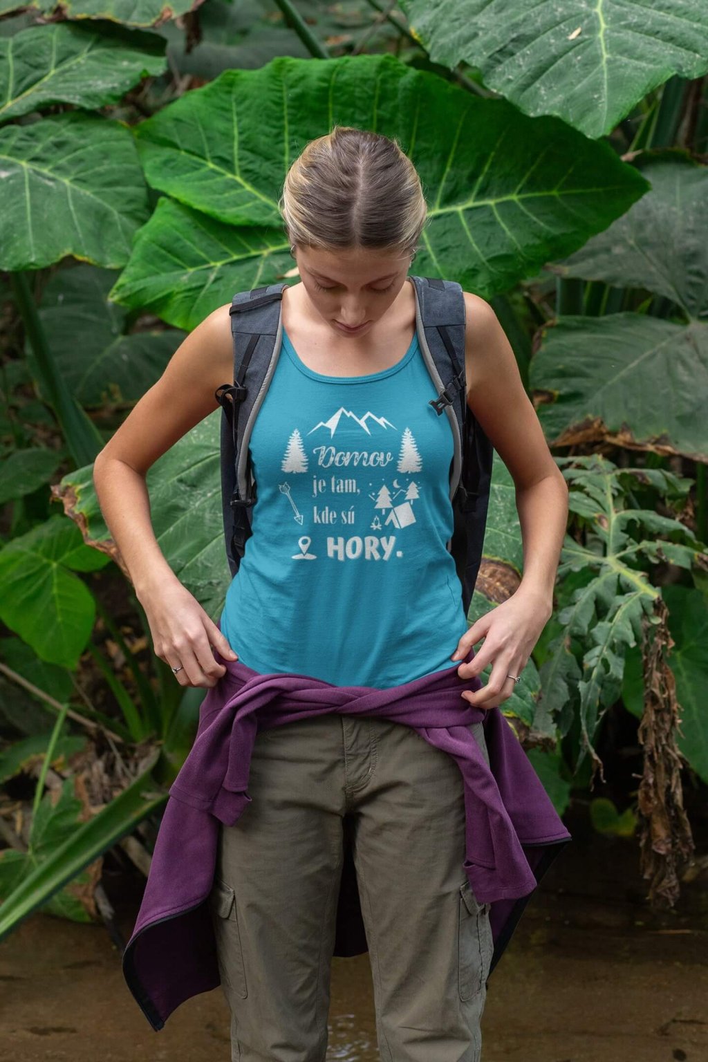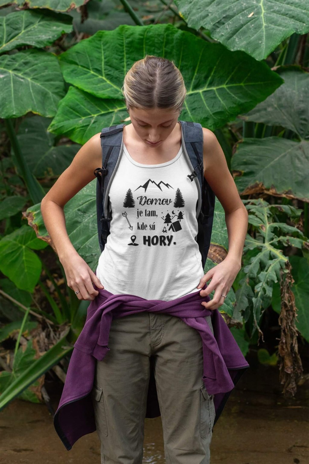 Dámske bavlnené tielko s turistickou potlačou. Na tielku je obrázok s motívom hôr, stromov a nápisom: ,,Domov je tam, kde sú HORY." Tielko je ideálne pre vášnivú turistku.