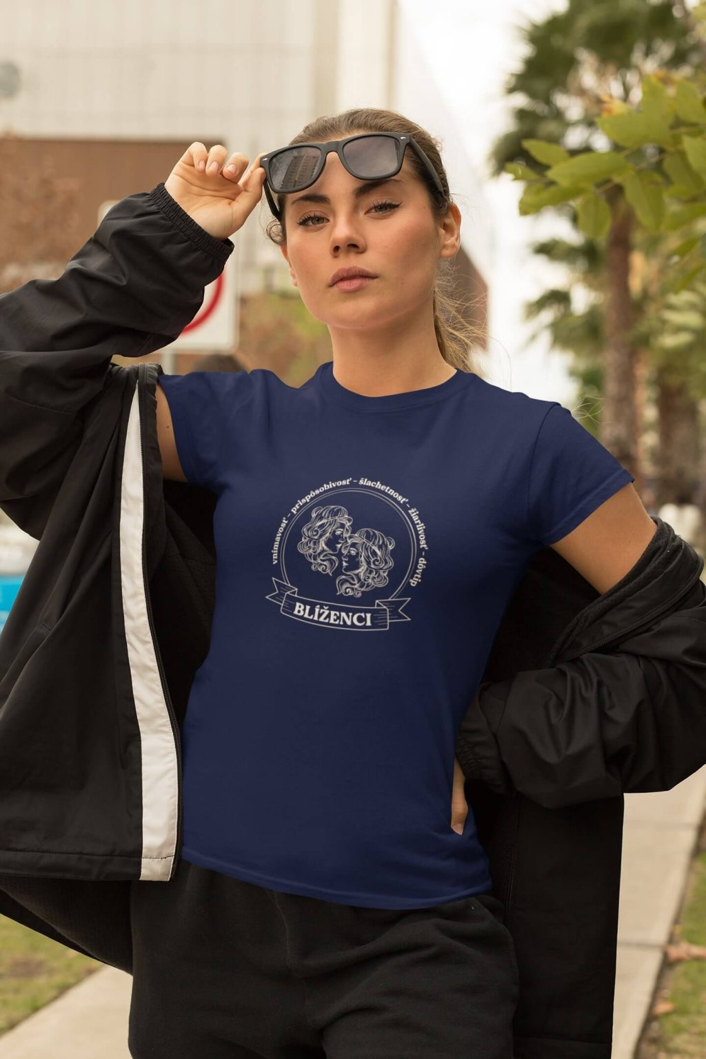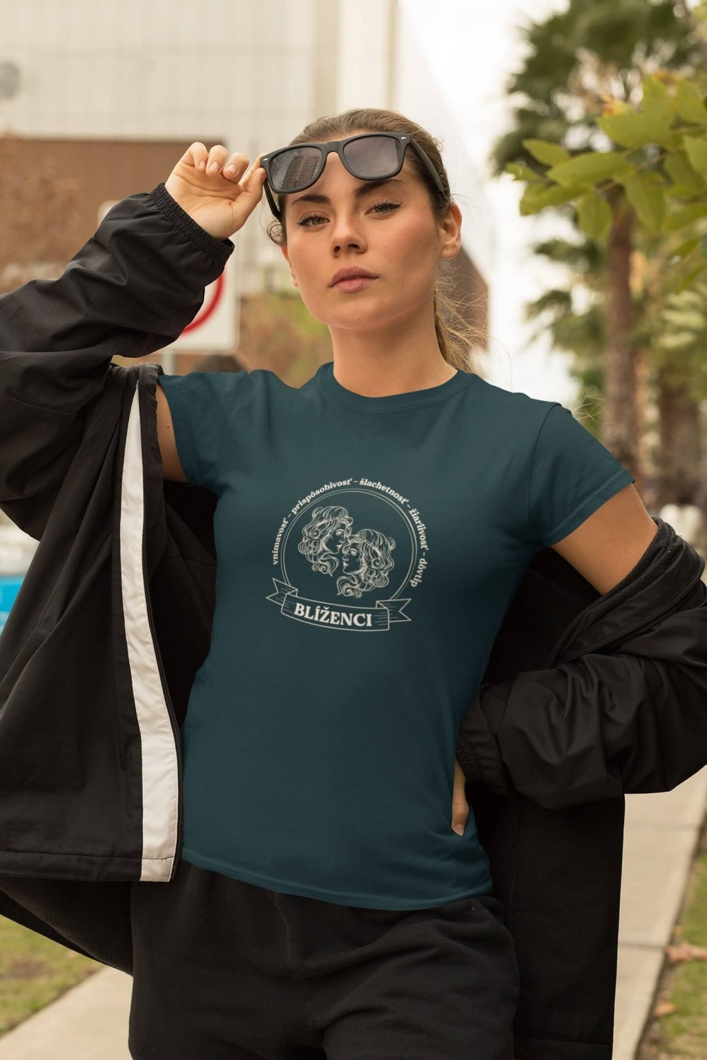 Dámske bavlnené tričko s krátkym rukávom s motívom znamenia BLÍŽENCI a opisom jeho vlastností.