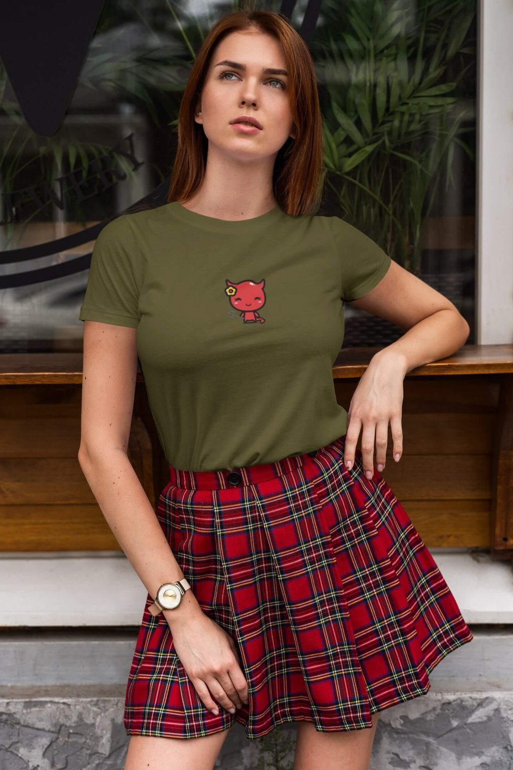 Dámske bavlnené tričko s krátkym rukávom a roztomilou potlačou. V strede hrudníku sa nachádza usmievavý čertík s kvietkom pri uchu.