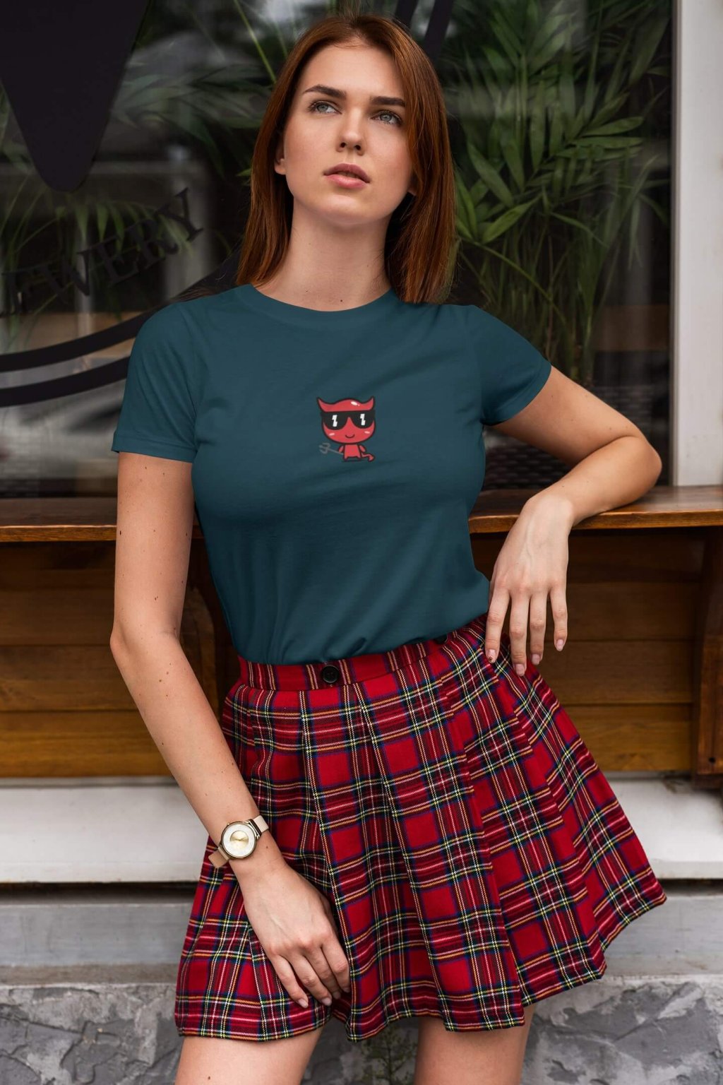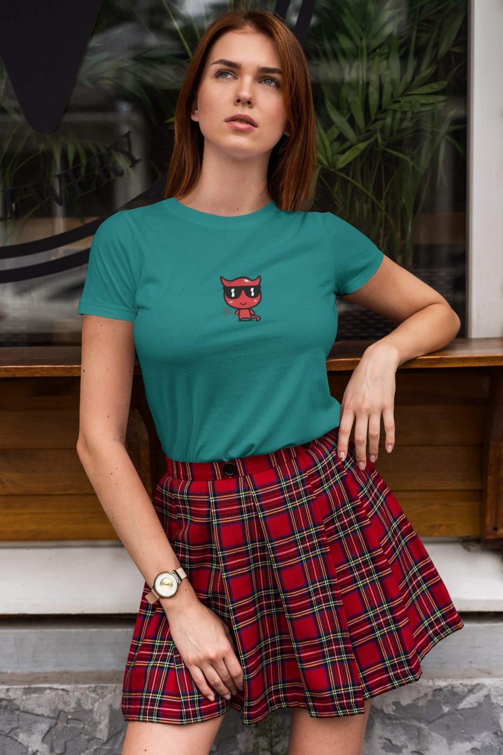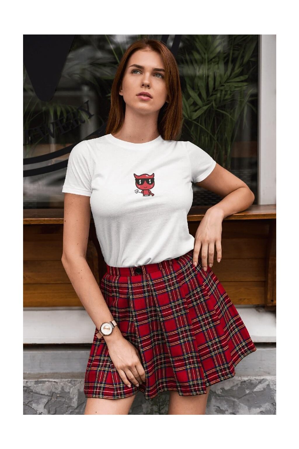 Dámske bavlnené tričko s krátkym rukávom a roztomilou potlačou. V strede hrudníku sa nachádza usmievavý čertík s frajerskými okuliarmi.