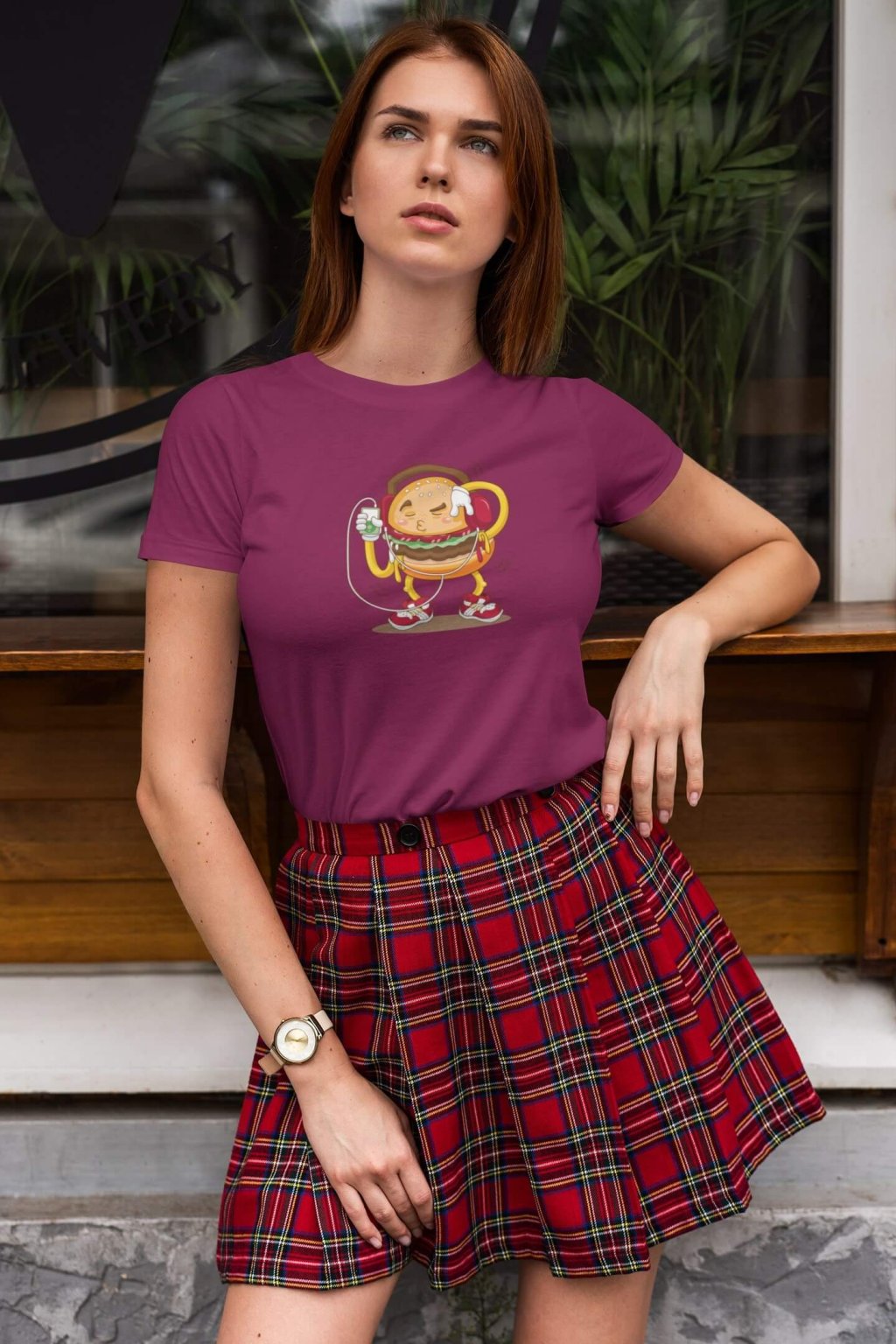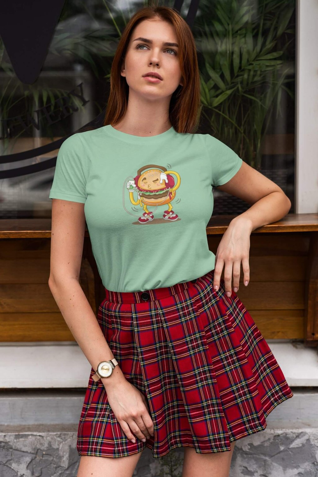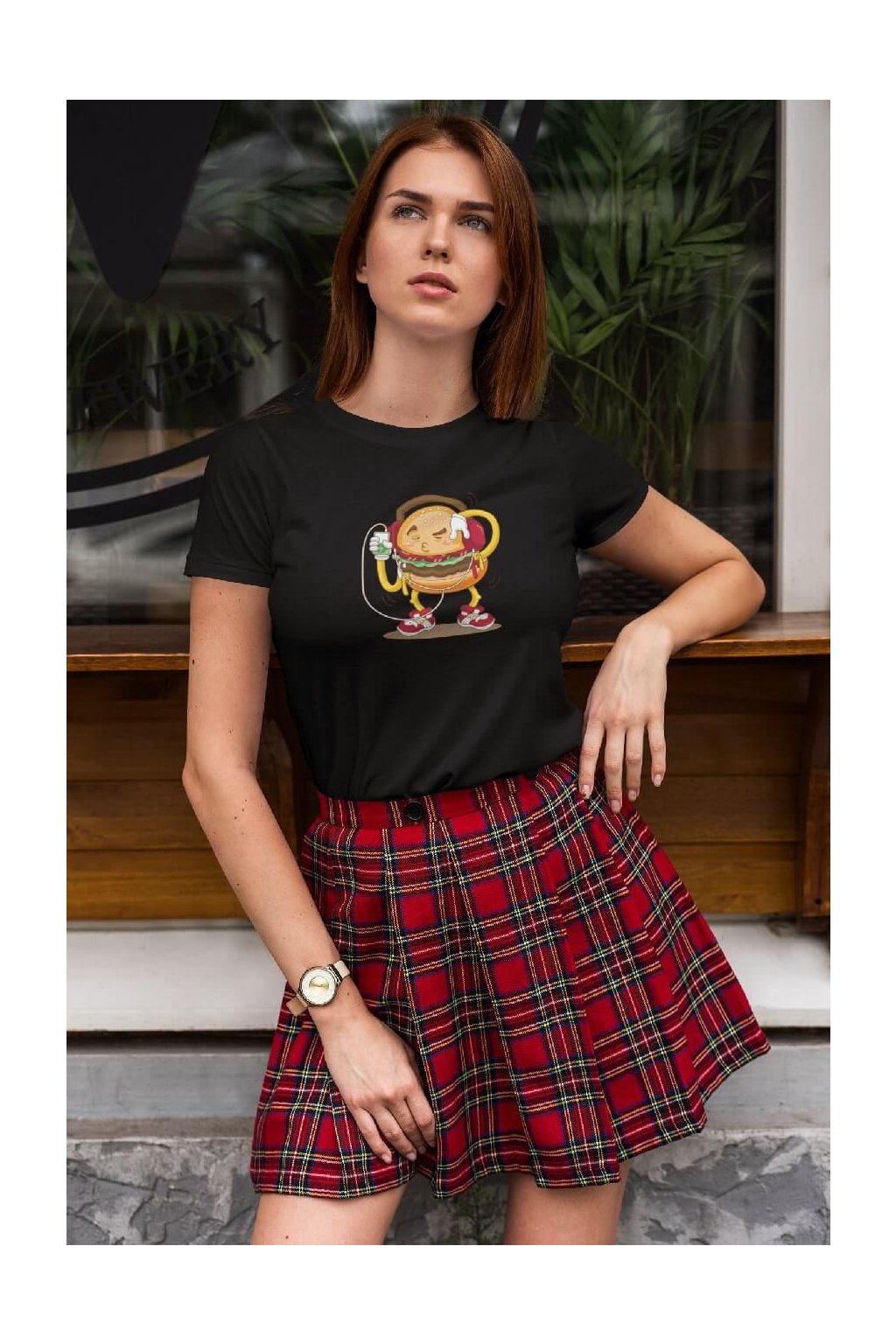 Dámske bavlnené tričko s krátkym rukávom a vtipným motívom. Na tričku je štýlový obrázok hamburgeru so slúchadlami. Maj štýl ako hamburger na tvojom tričku.