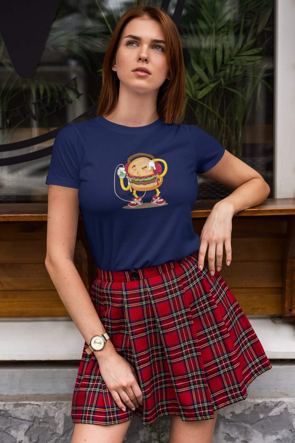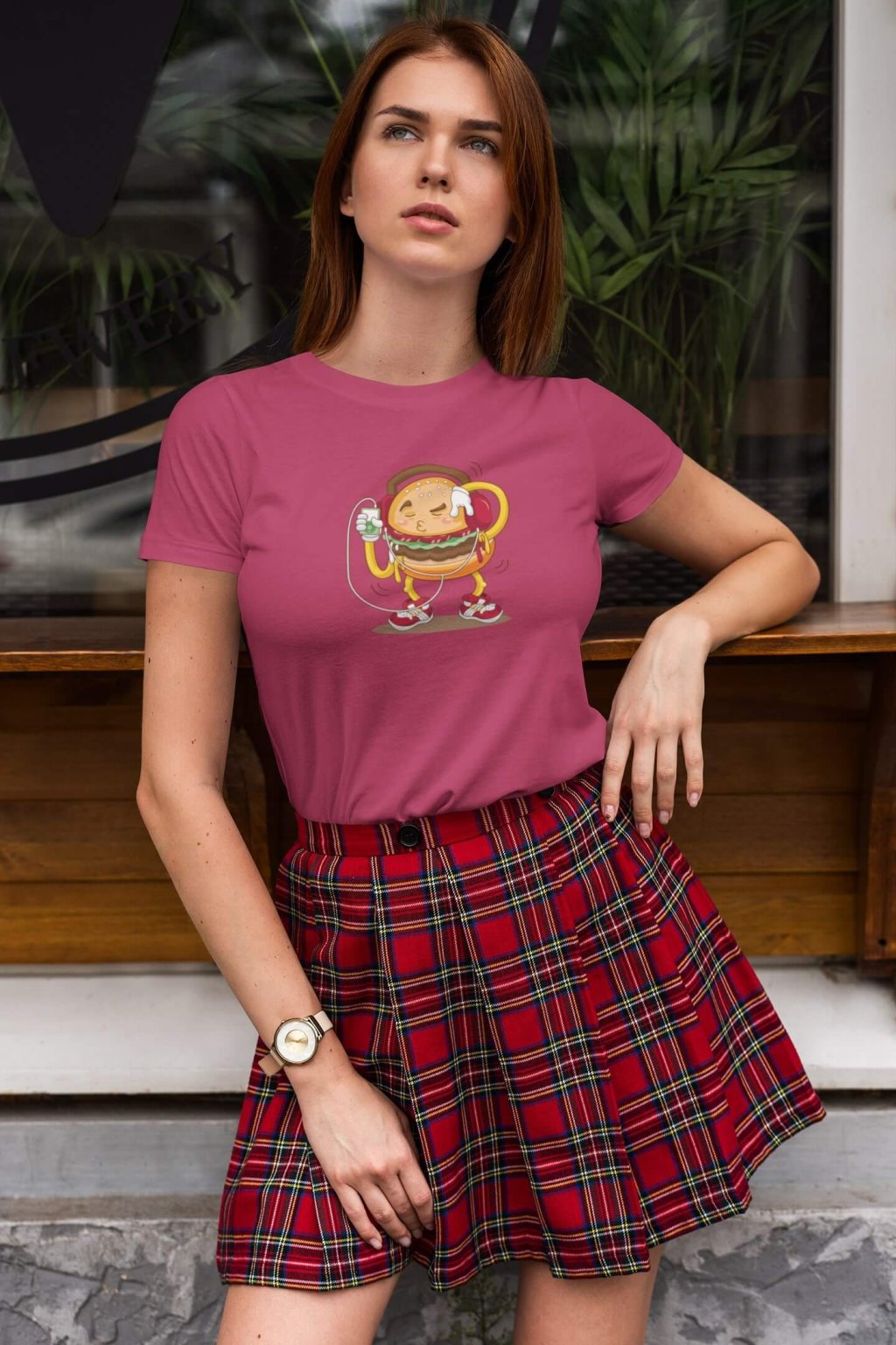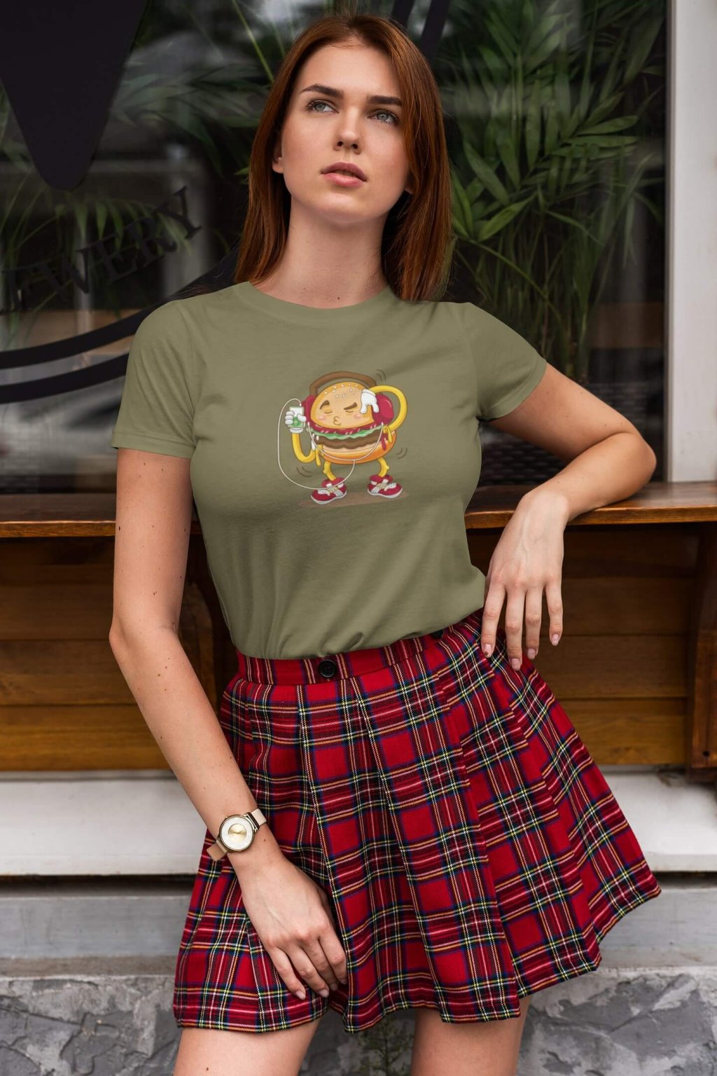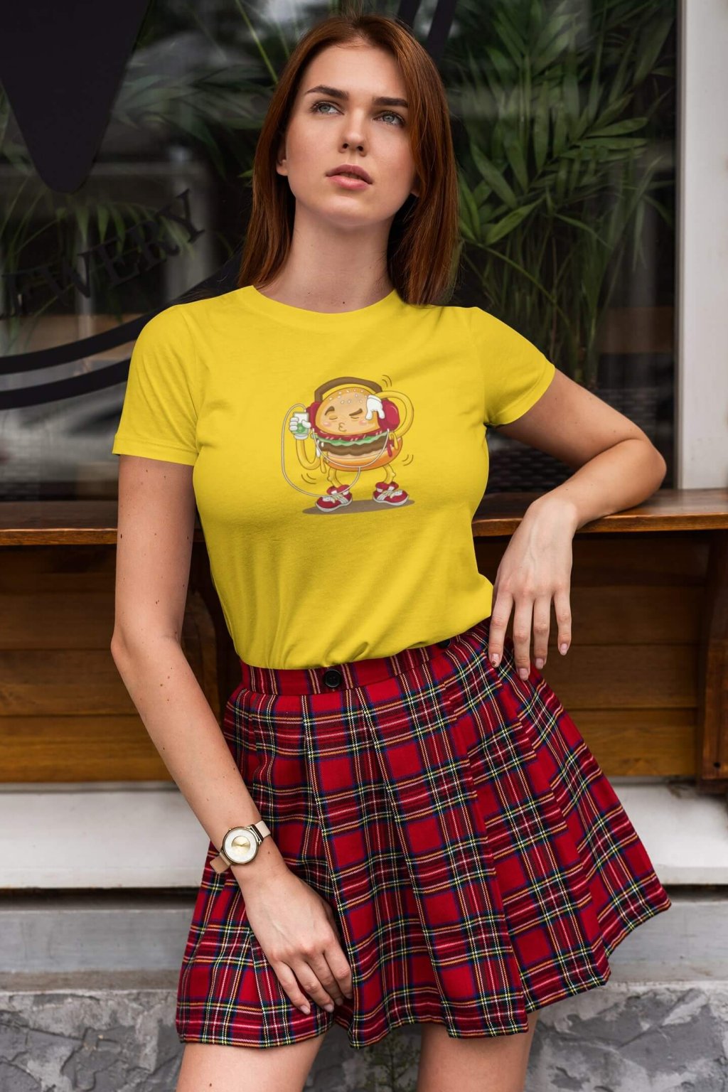 Dámske bavlnené tričko s krátkym rukávom a vtipným motívom. Na tričku je štýlový obrázok hamburgeru so slúchadlami. Maj štýl ako hamburger na tvojom tričku.