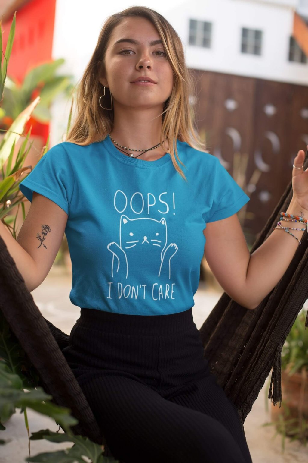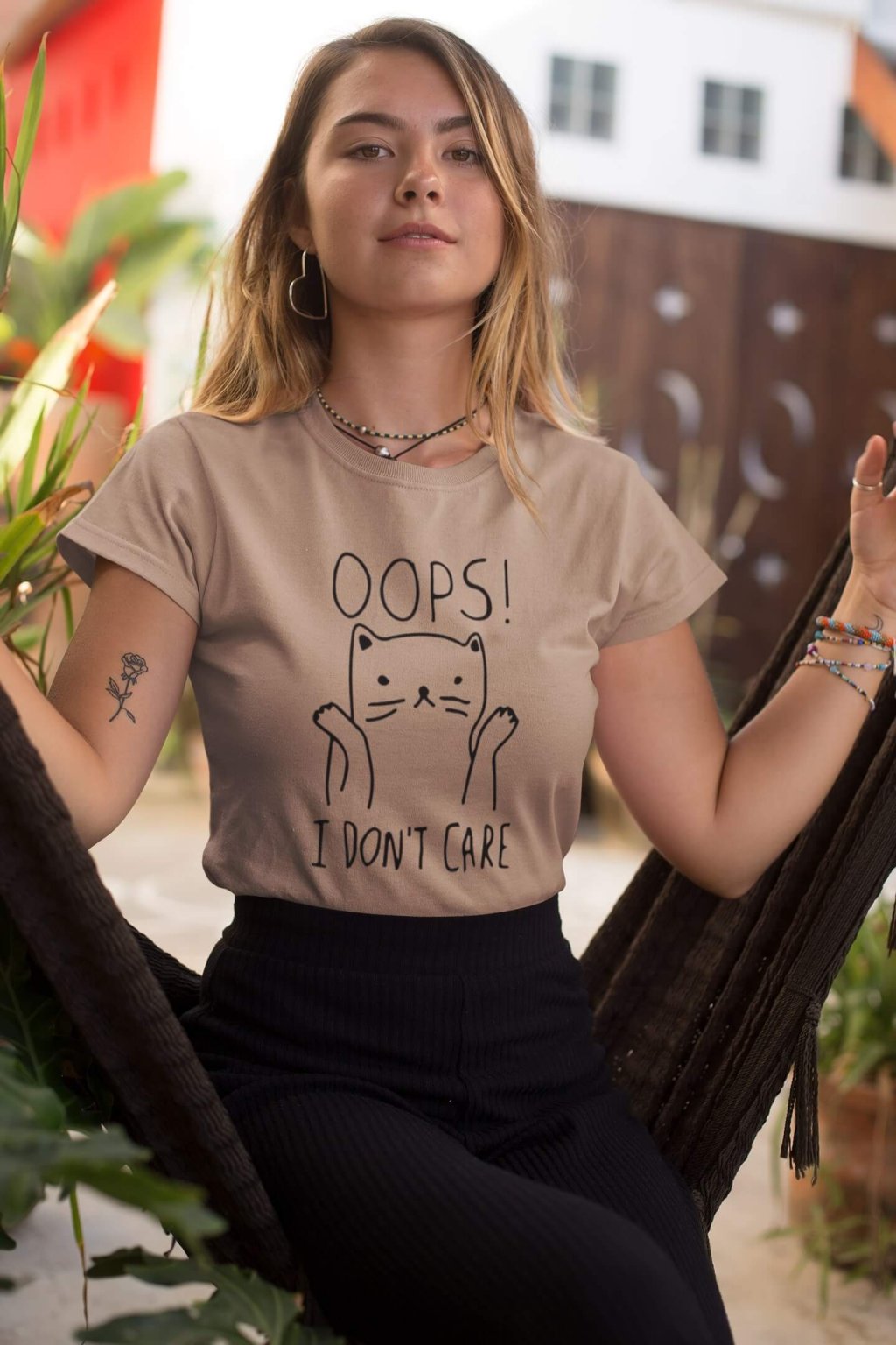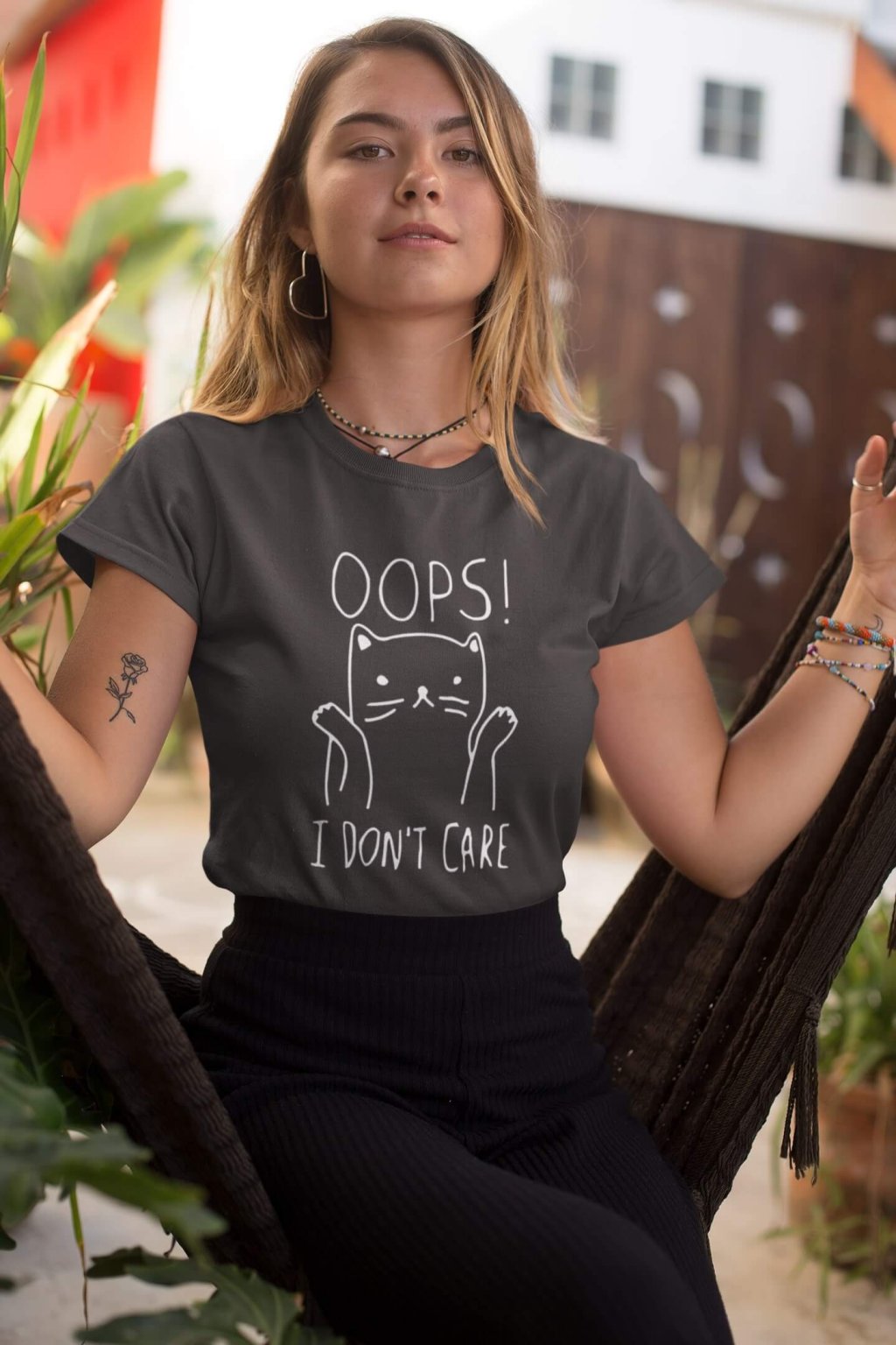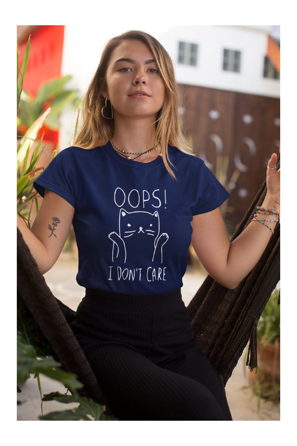 Dámske bavlnené tričko s krátkym rukávom s obrázkom mačky a s nápisom "I DONT CARE," čo preklade znamená "je mi to jedno."