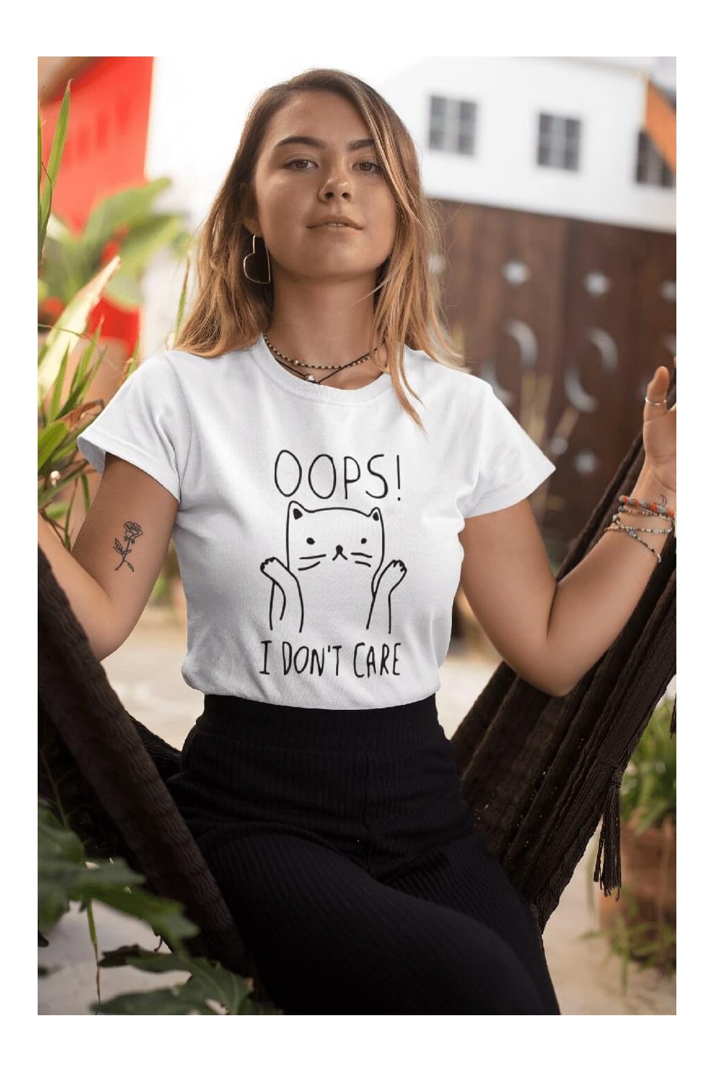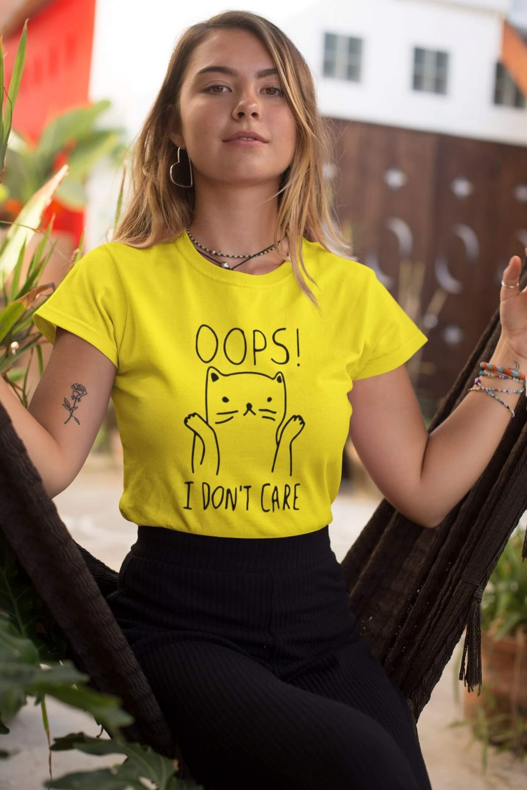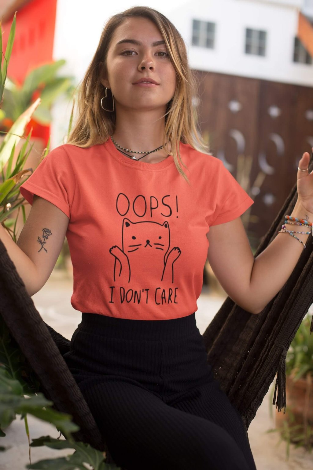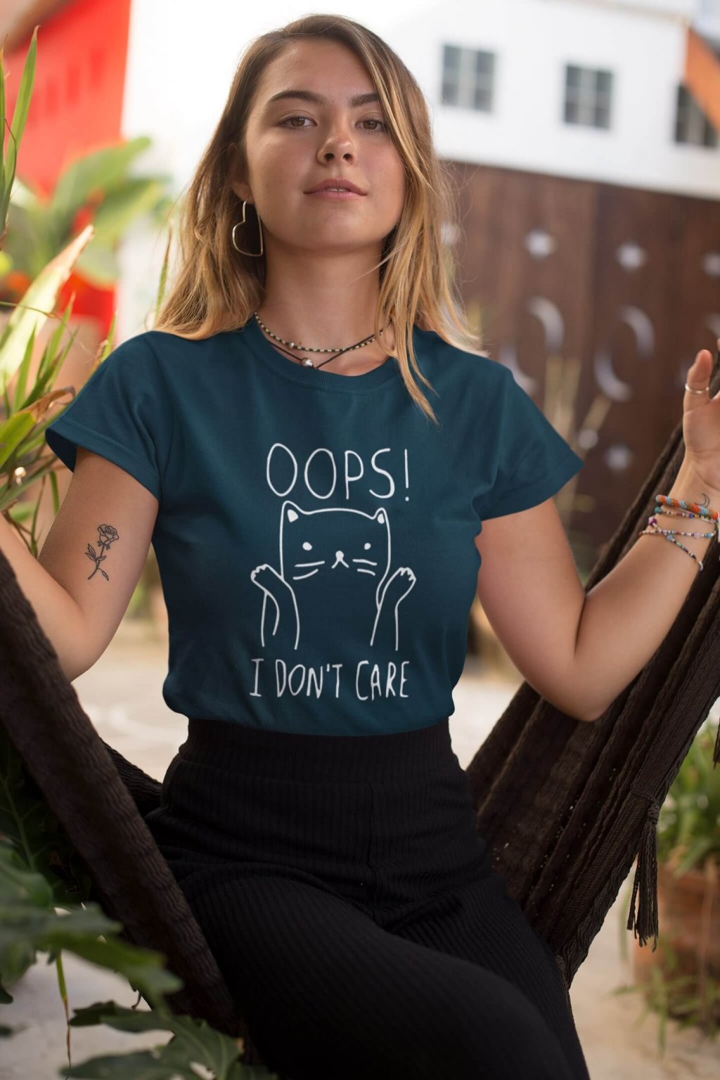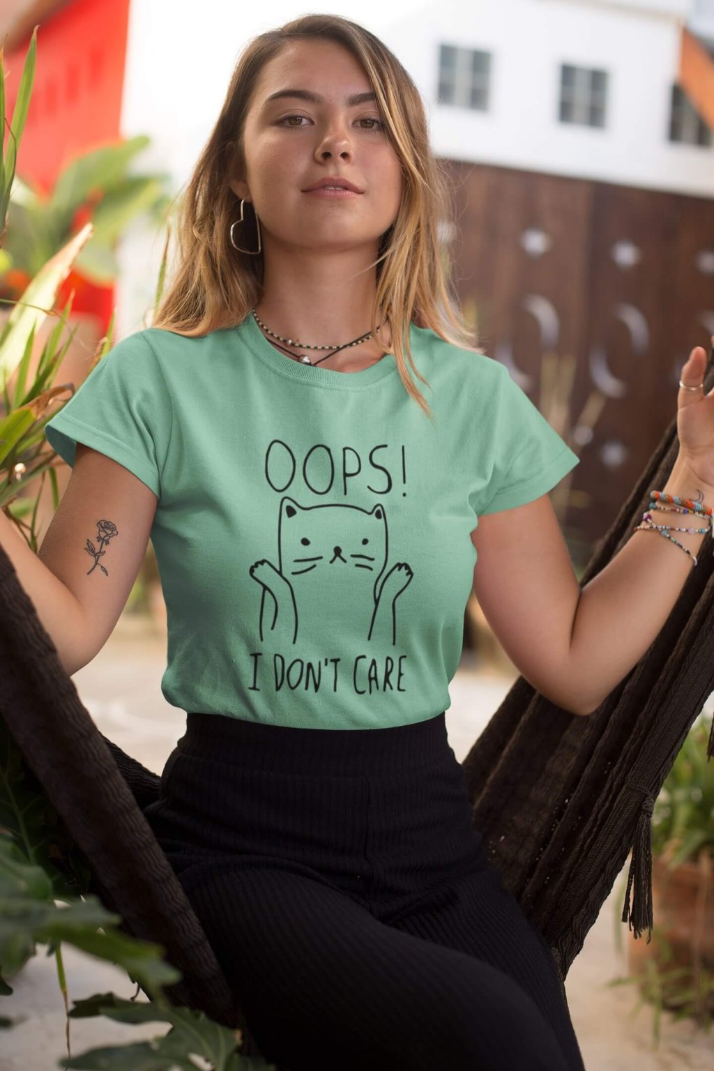 Dámske bavlnené tričko s krátkym rukávom s obrázkom mačky a s nápisom "I DONT CARE," čo preklade znamená "je mi to jedno."