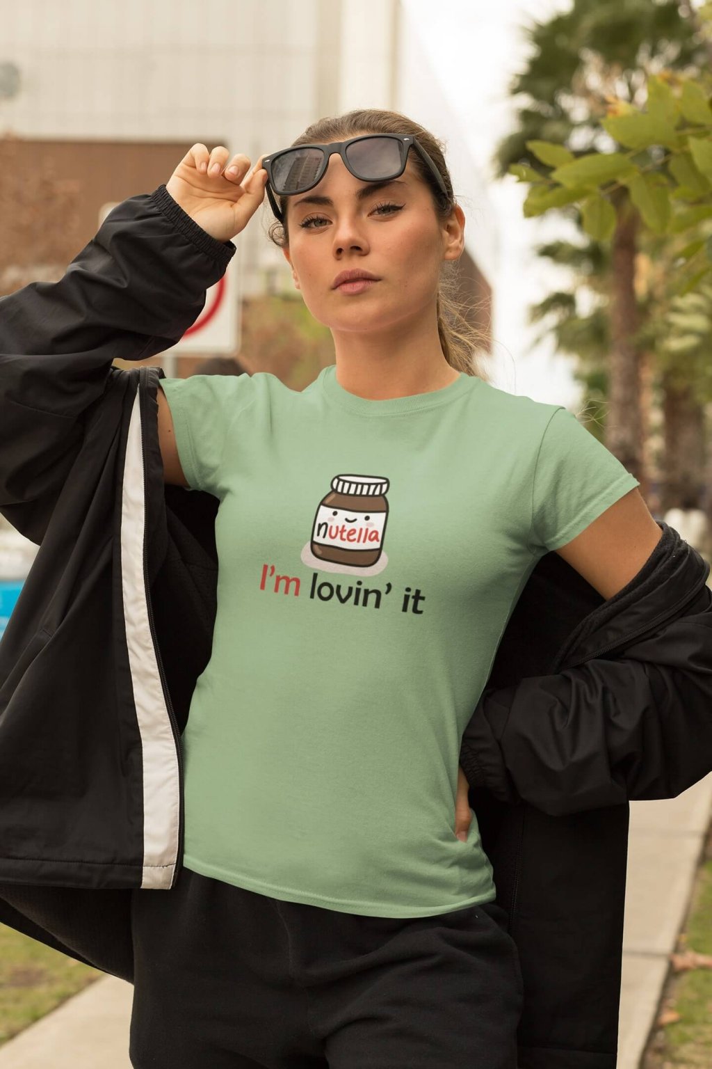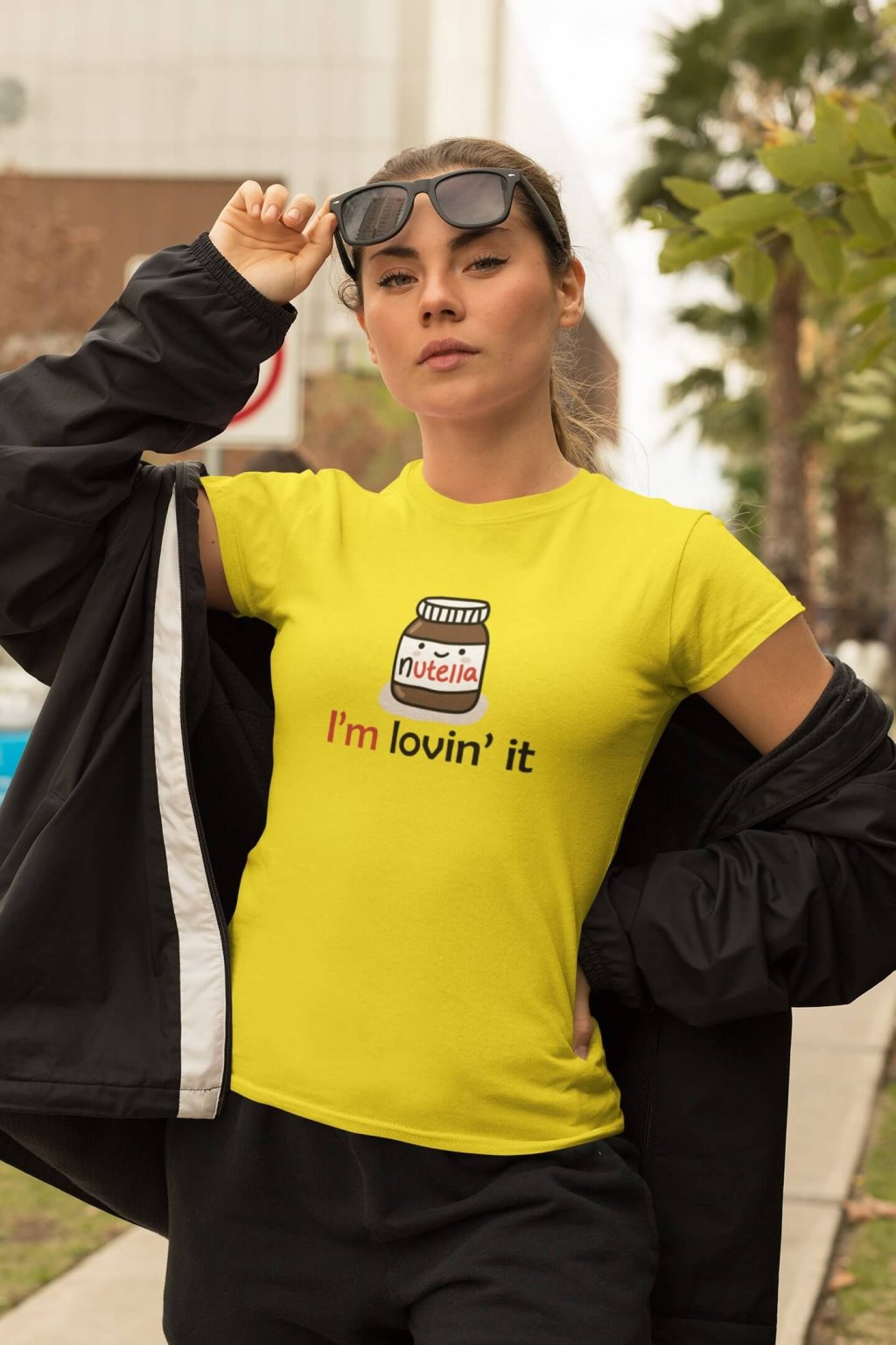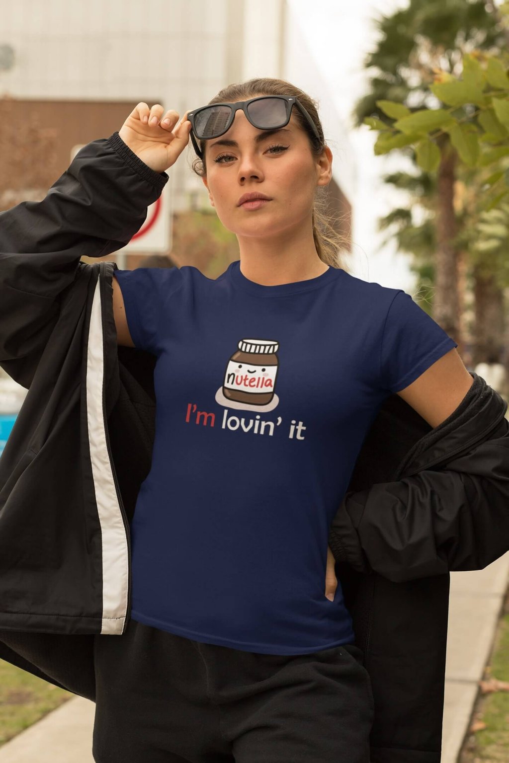 Dámske bavlnené tričko s krátkym rukávom a vtipnou potlačou. Na tričku je originálny obrázok nutelly a pod ním nápis "I'm lovin' it."