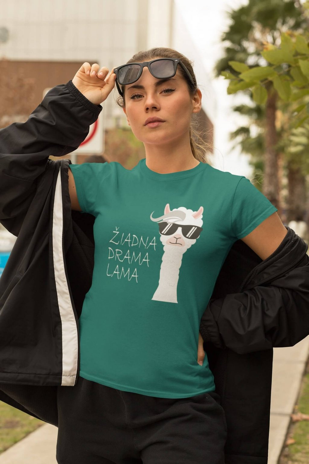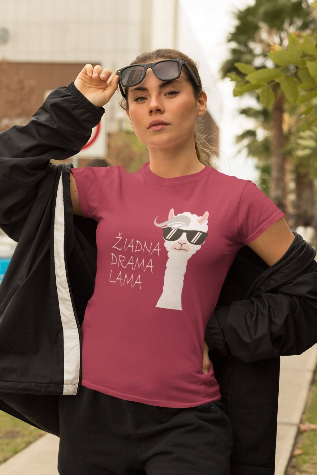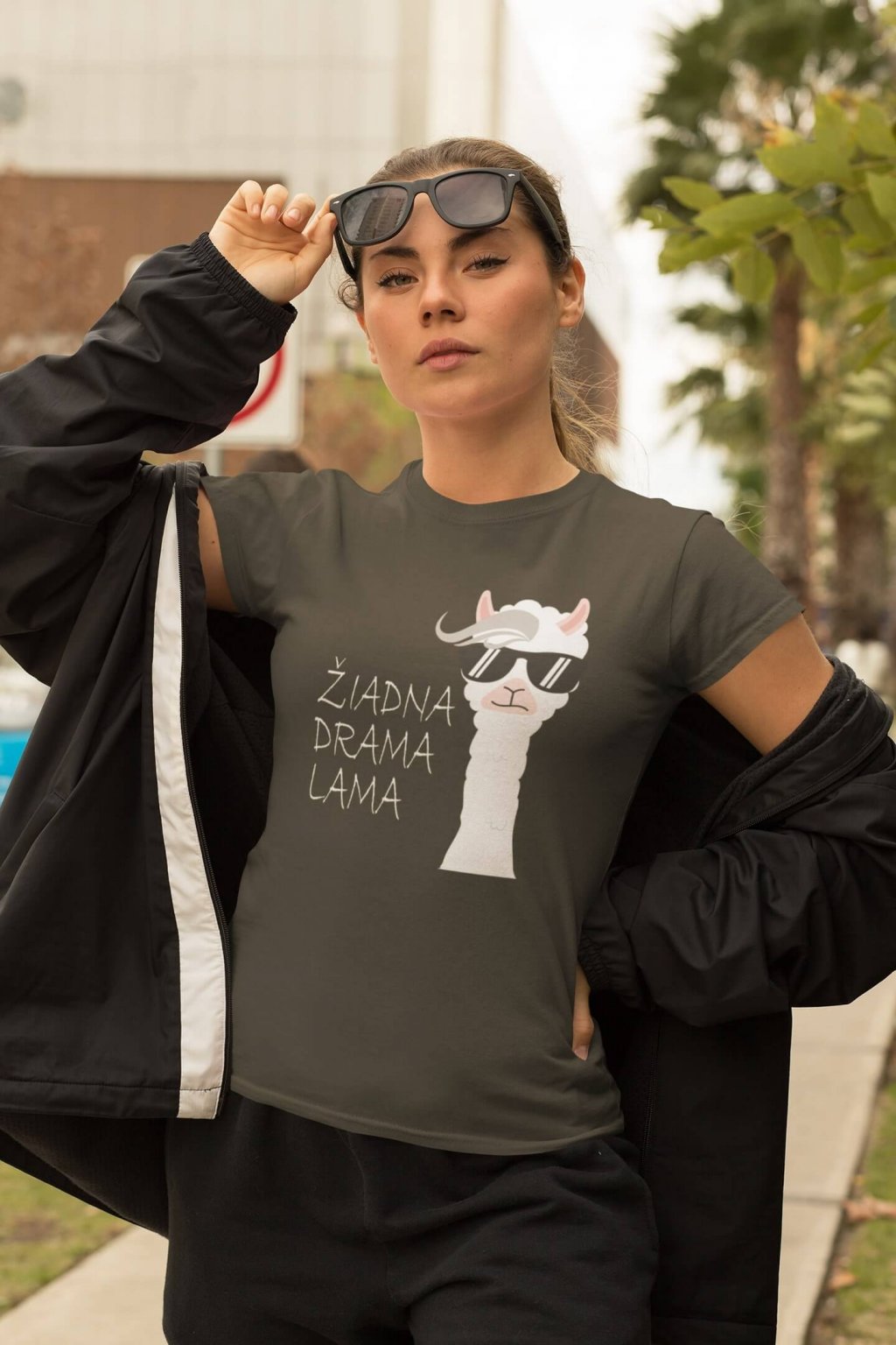 Dámske bavlnené tričko s krátkym rukávom a vtipnou potlačou. Na tričku je obrázok štýlovej lamy, ktorá je v pohode a v jej komiksovej bubline je text: ,,ŽIADNA DRÁMA, LAMA." Lebo život je gombička, len treba mať správny pohodový prístup na situácie v živote.