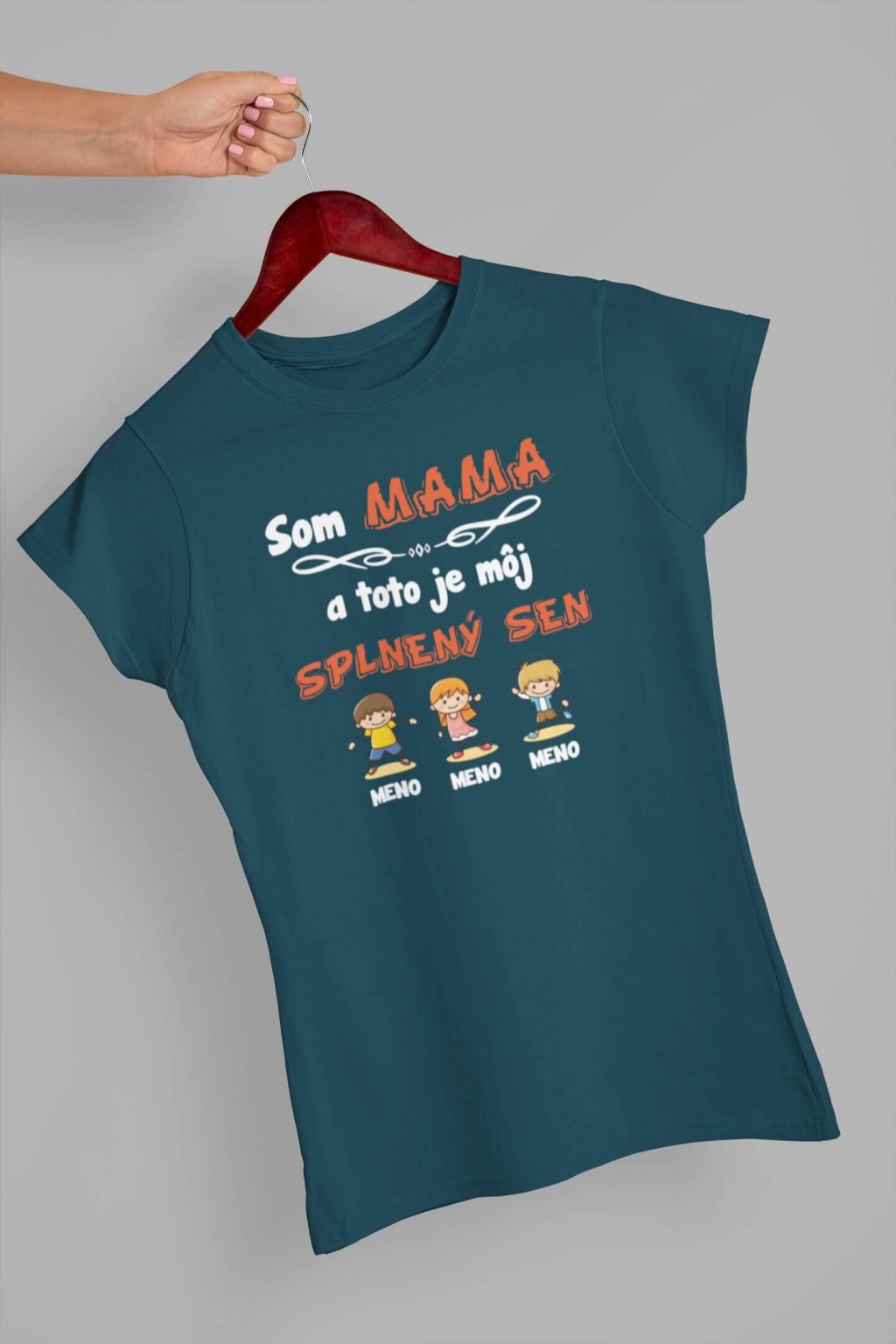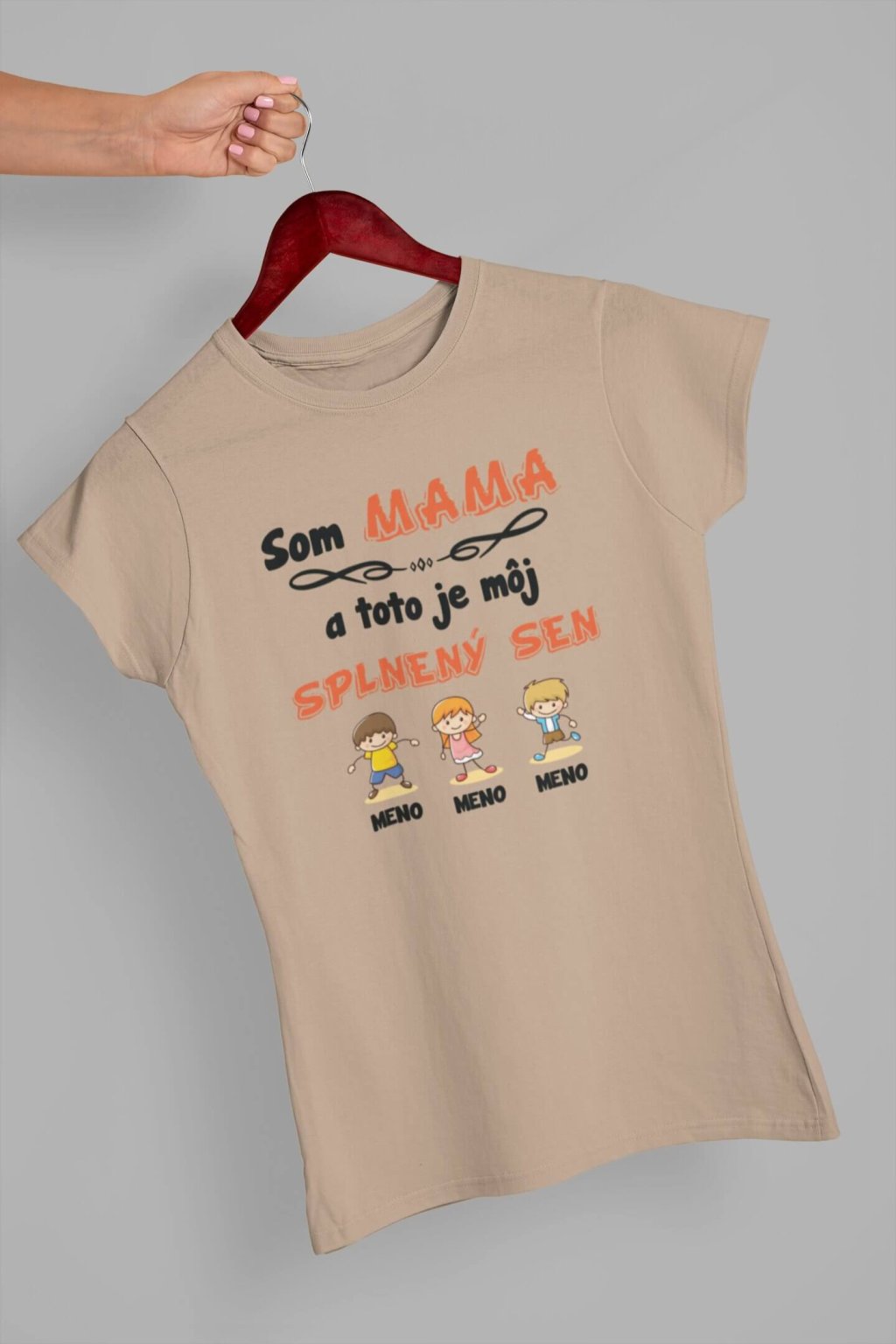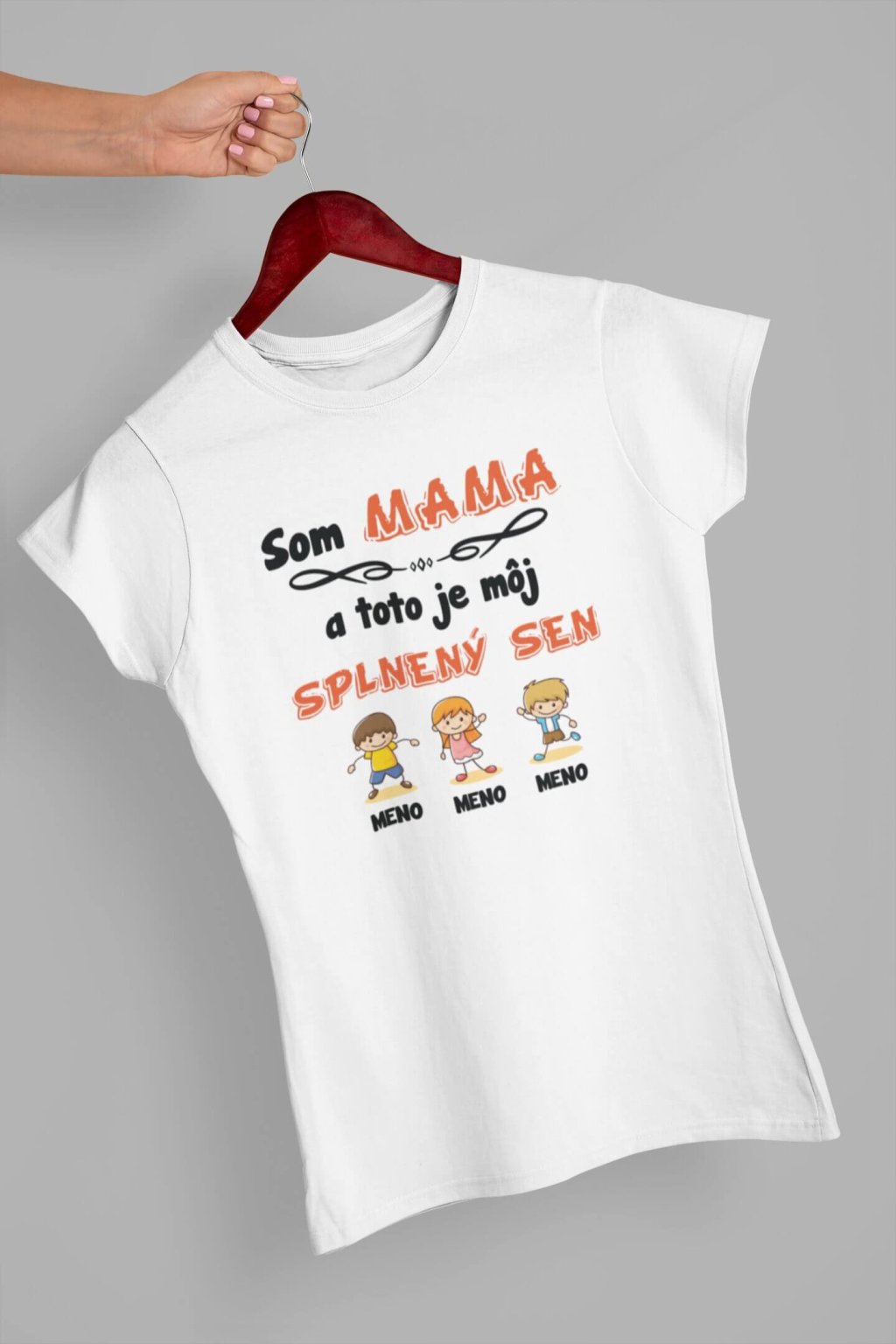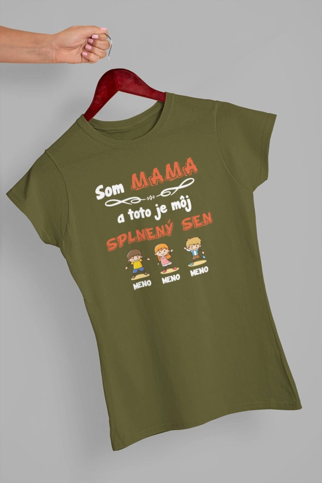 Dámske bavlnené tričko s krátkym rukávom. Na tričku je nápis "Som MAMA a toto je môj splnený sen". Pod nápisom je obrázok detí spolu s menami. Mená detí si môžete doplniť podľa seba, stačí ho ich len napísať do poznámky k produktu.