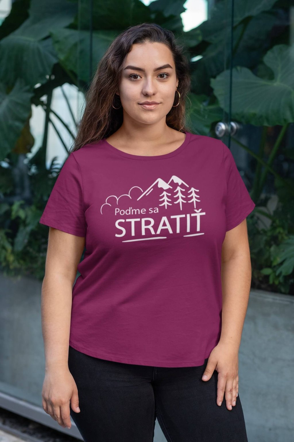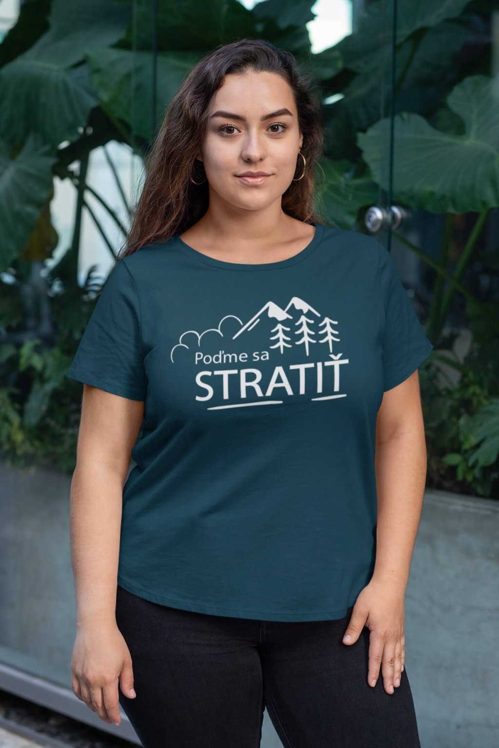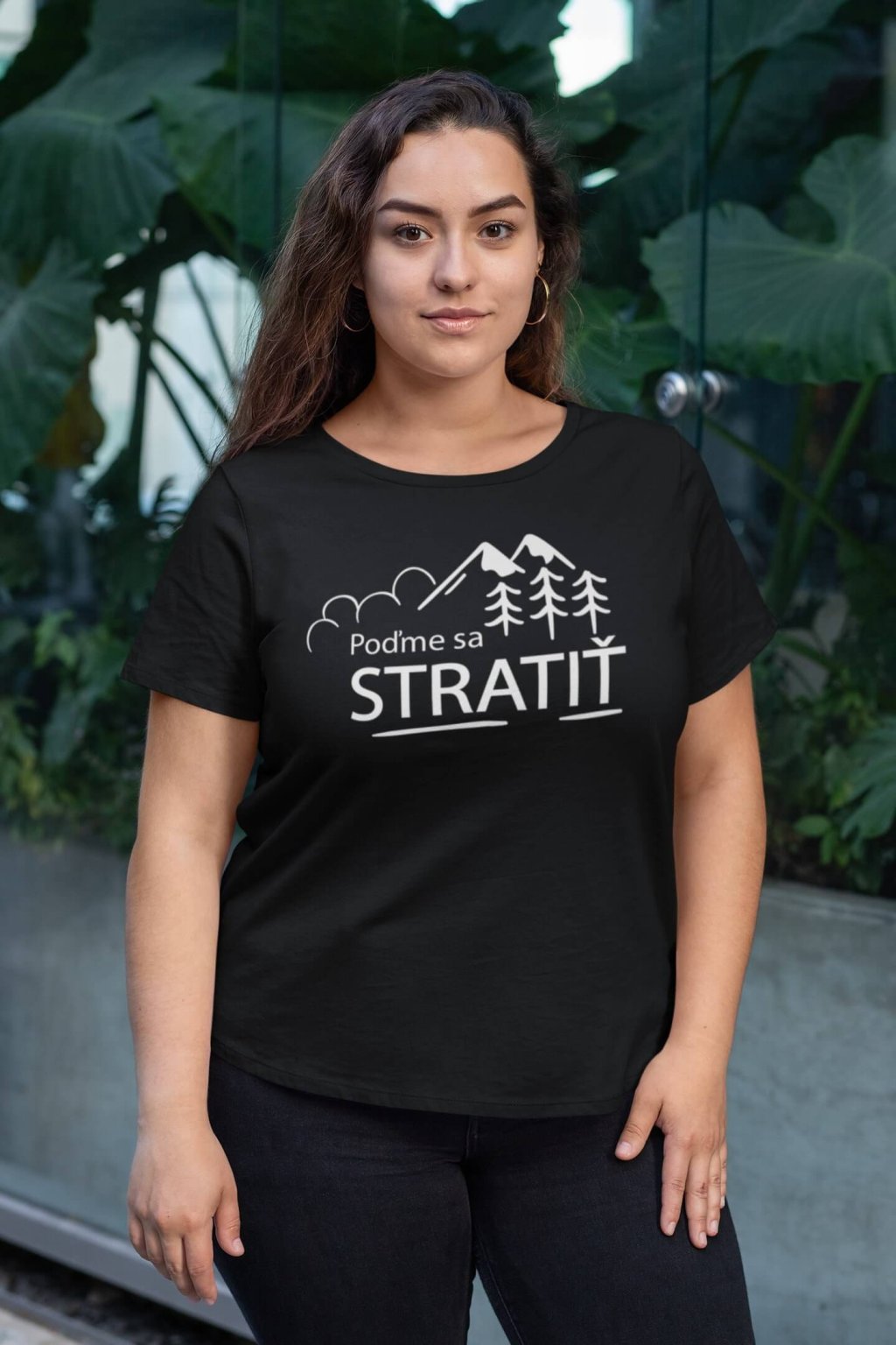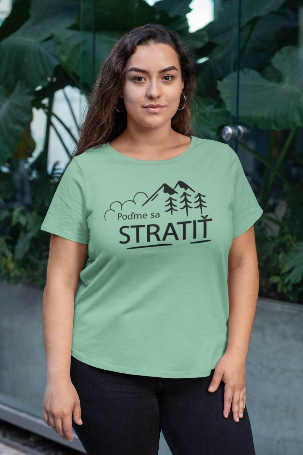 Dámske bavlnené tričko s krátkym rukávom a turistickou potlačou. Na tričku je obrázok s motívom prírody a nápisom: ,,Poďme sa STRATIŤ." Tričko je ideálne pre vášnivú turistku.