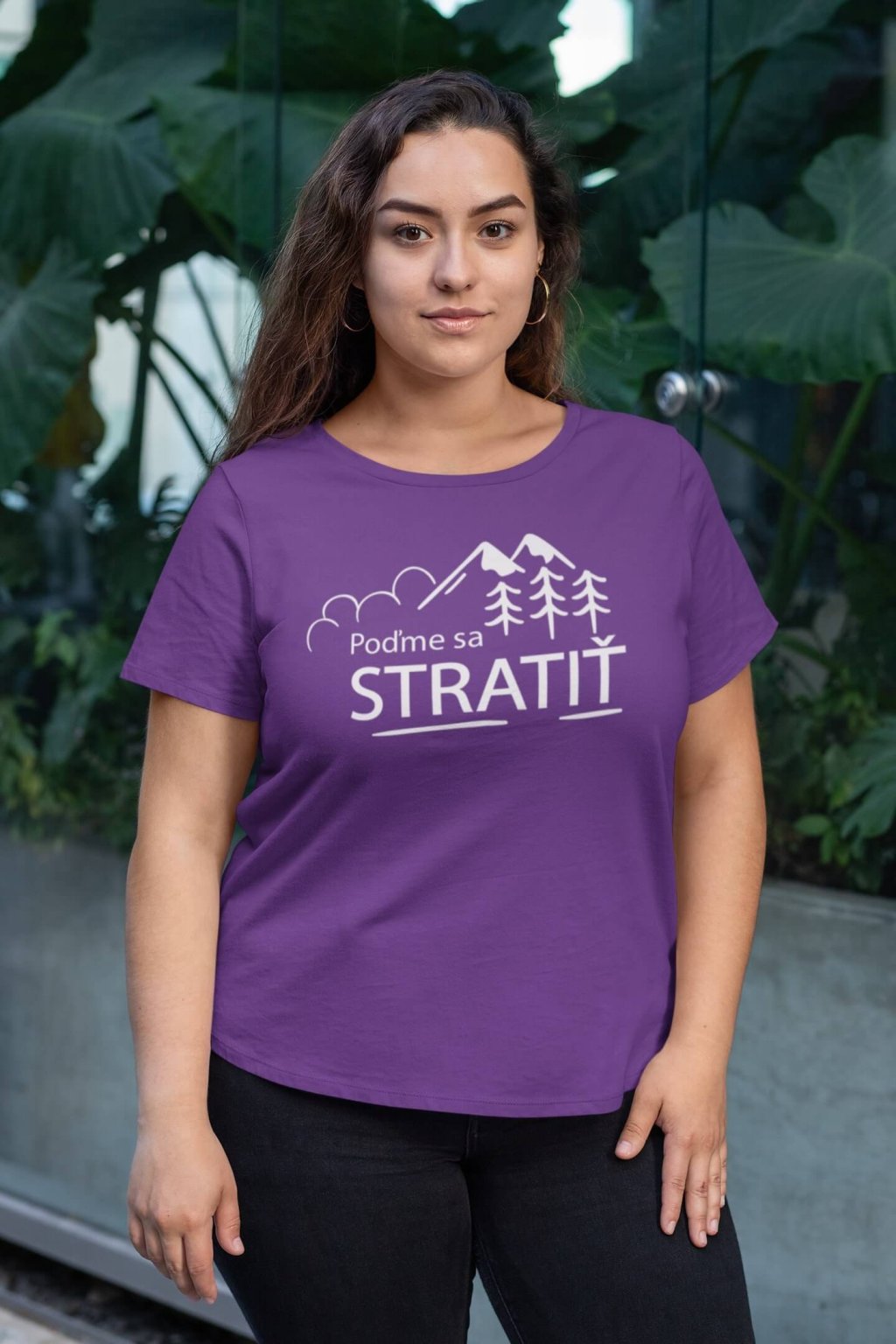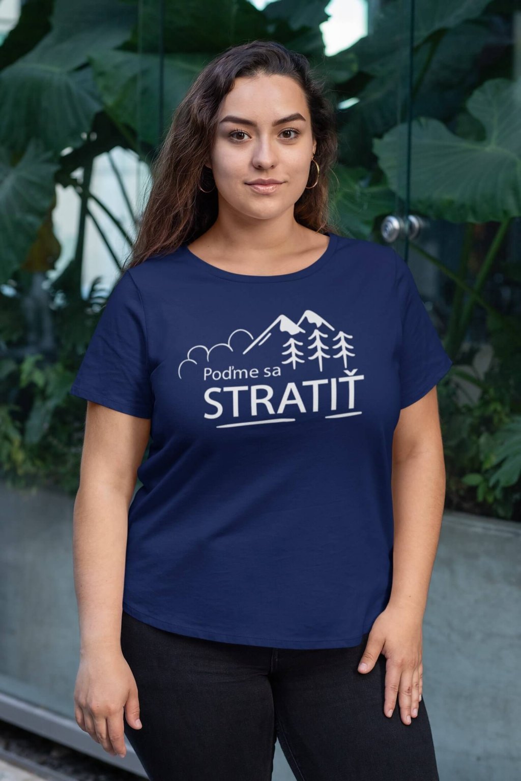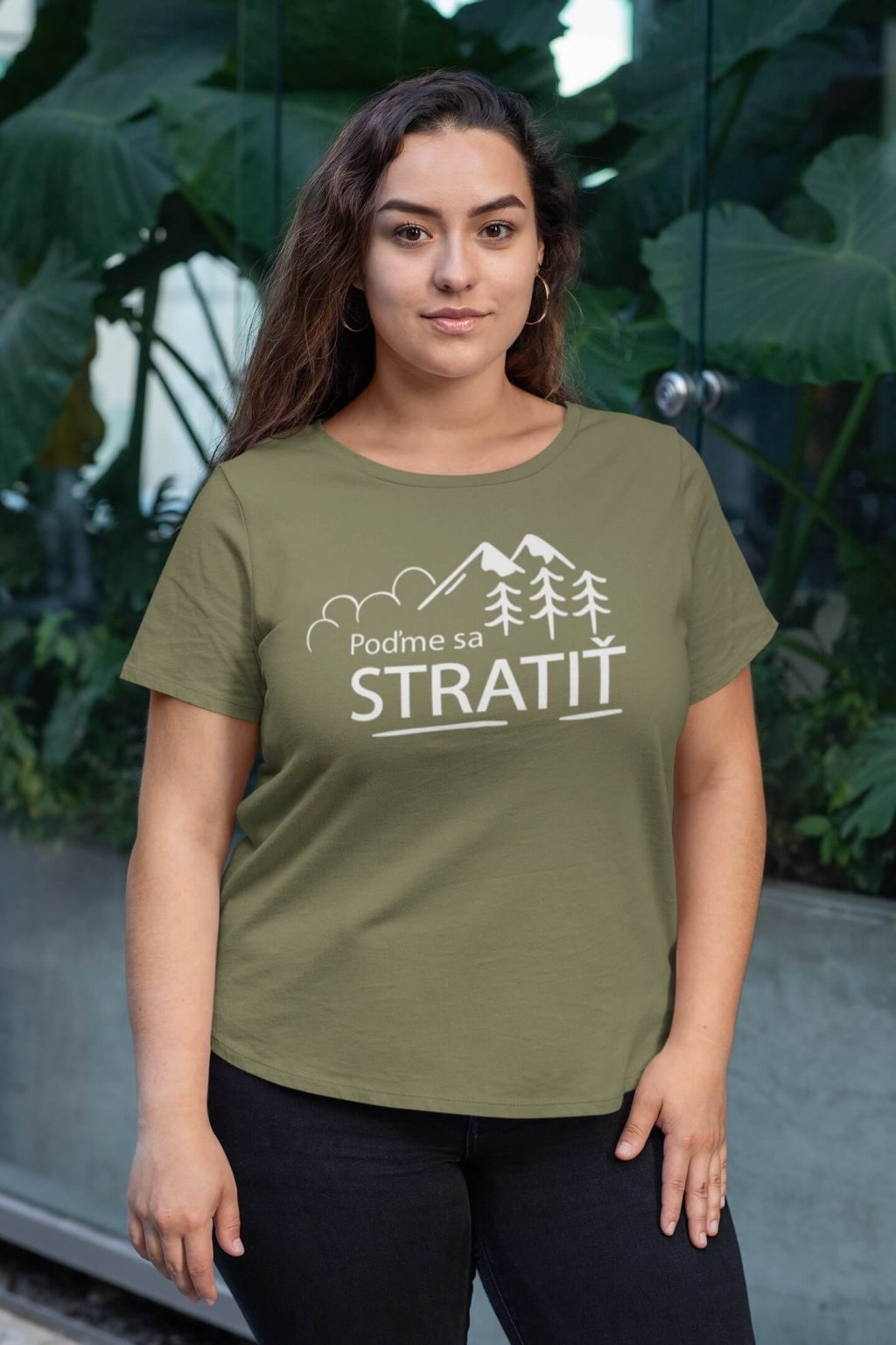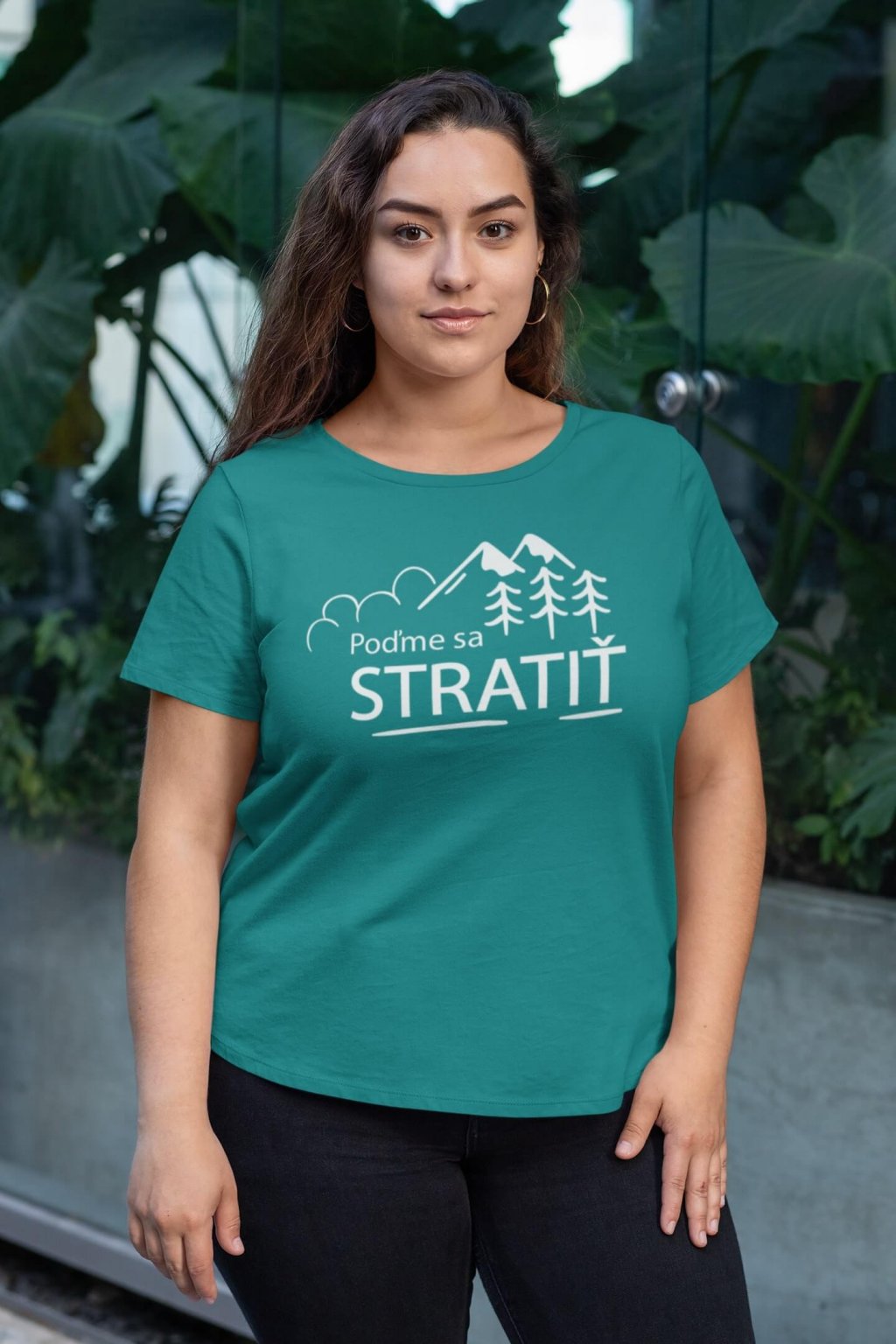 Dámske bavlnené tričko s krátkym rukávom a turistickou potlačou. Na tričku je obrázok s motívom prírody a nápisom: ,,Poďme sa STRATIŤ." Tričko je ideálne pre vášnivú turistku.