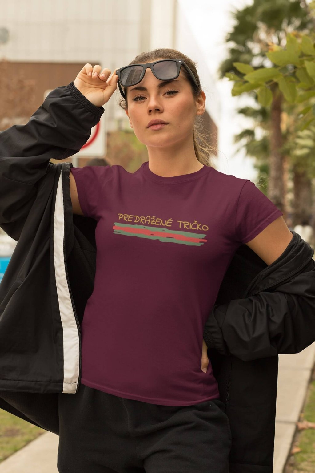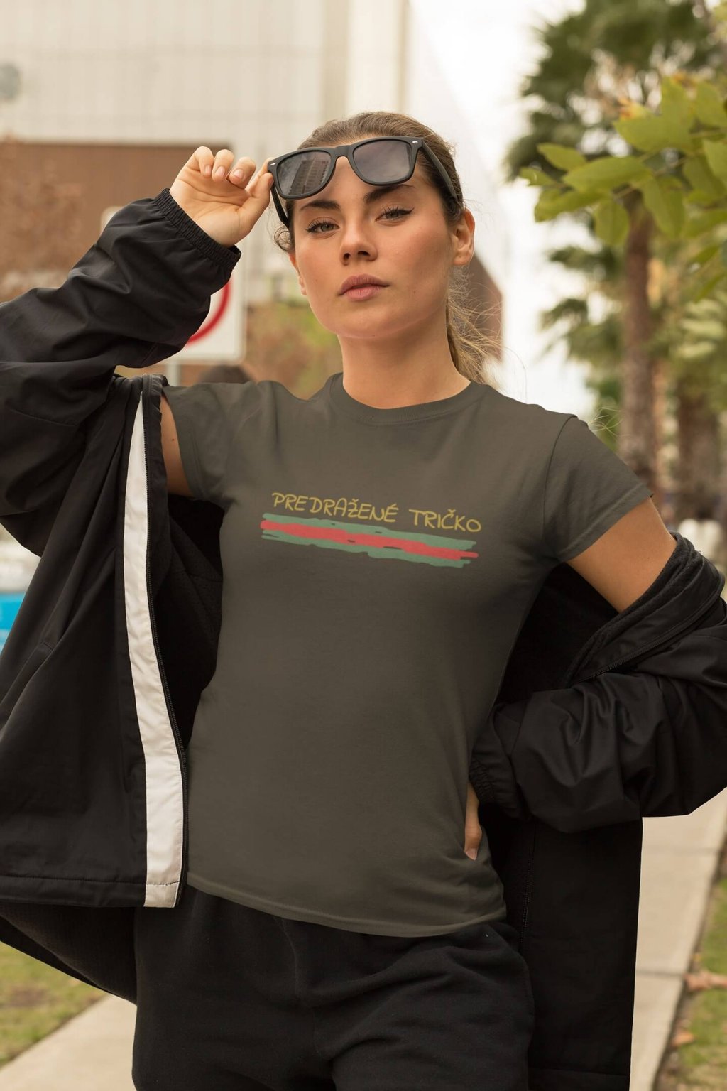 Dámske bavlnené tričko s krátkym rukávom. Na tričku je vtipný nápis: ,,PREDRAŽENÉ TRIČKO."