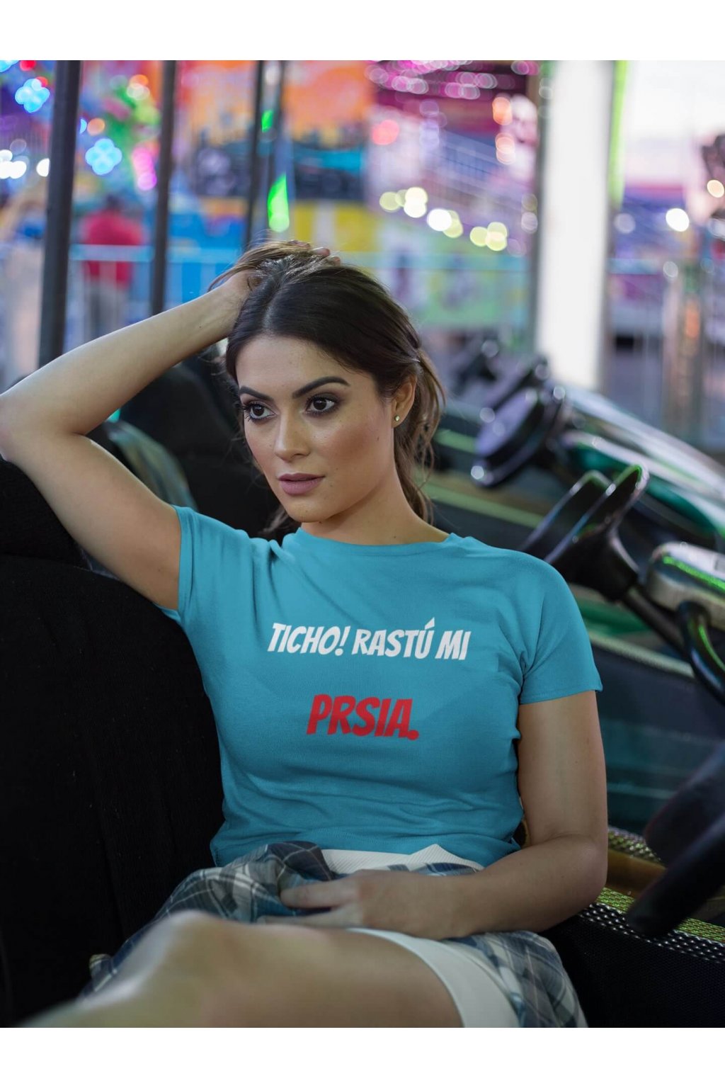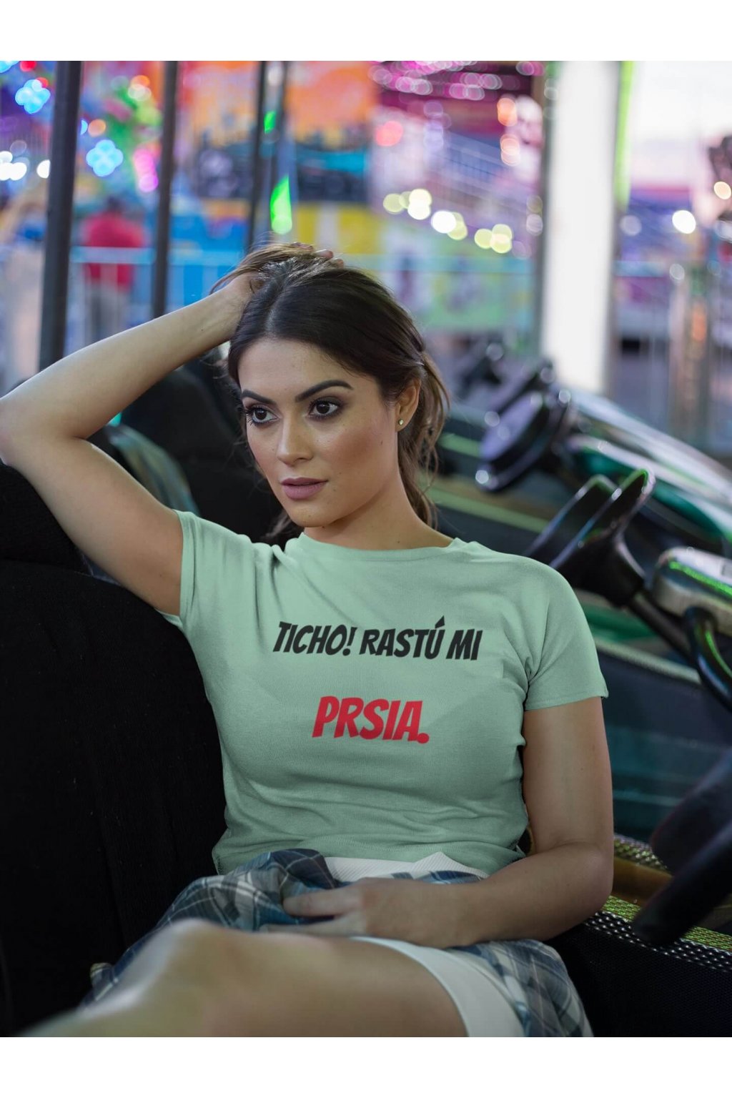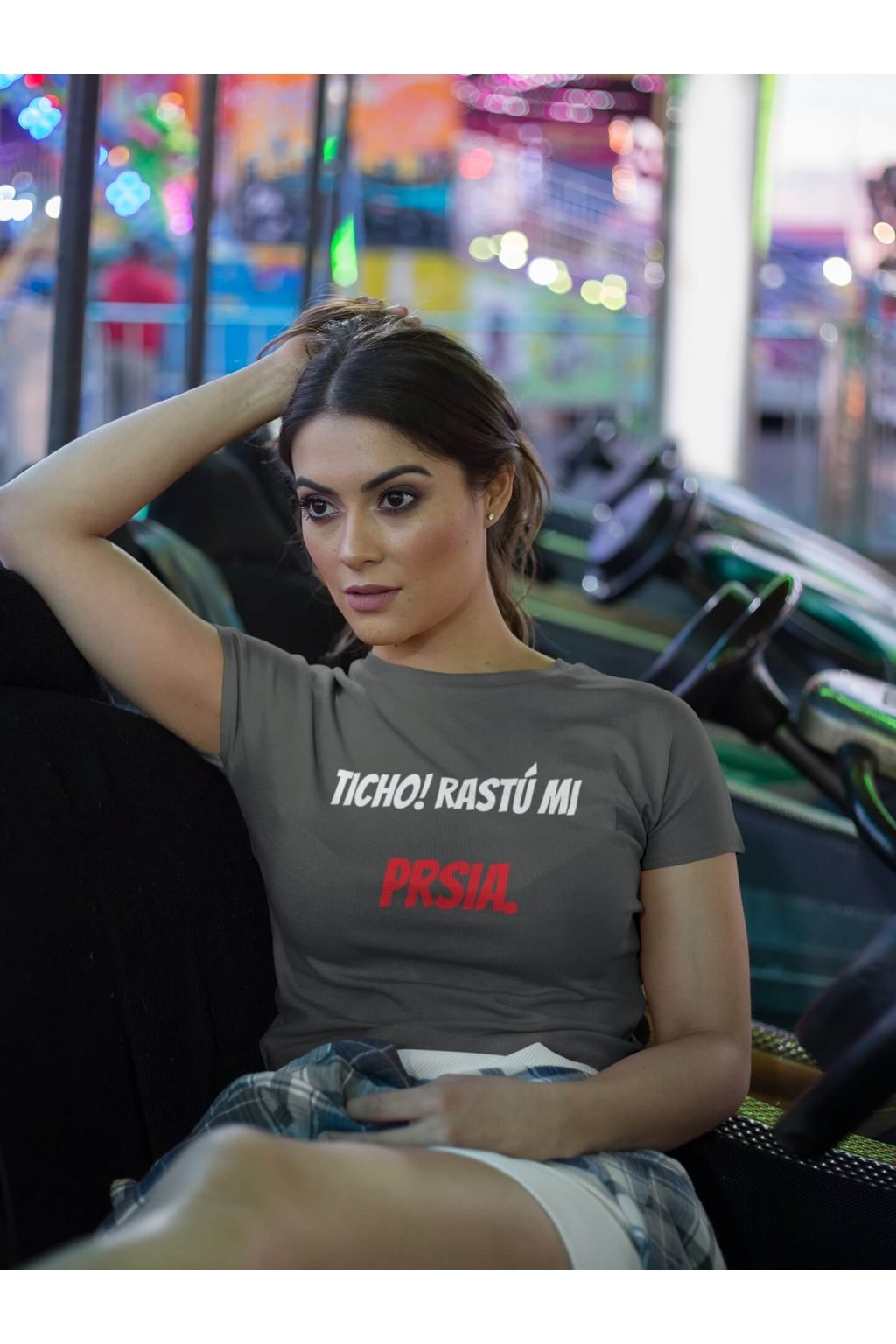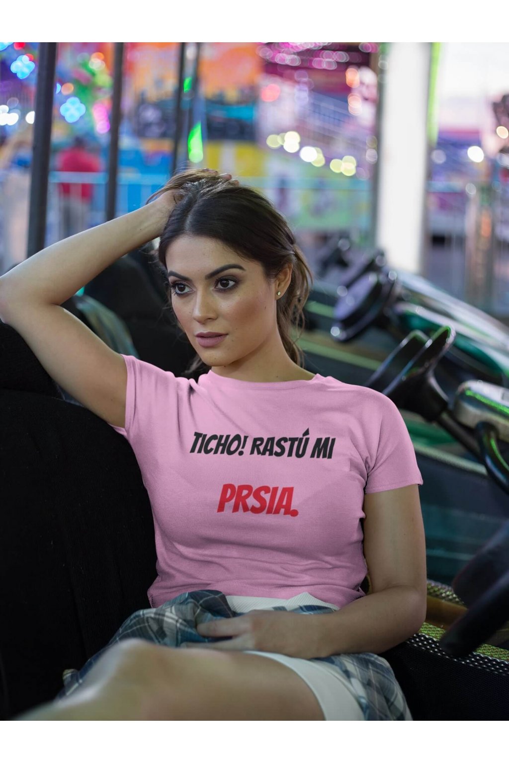 Dámske bavlnené tričko s krátkym rukávom a vtipnou potlačou. Na tričku je originálny nápis: ,,TICHO! RASTÚ MI PRSIA."