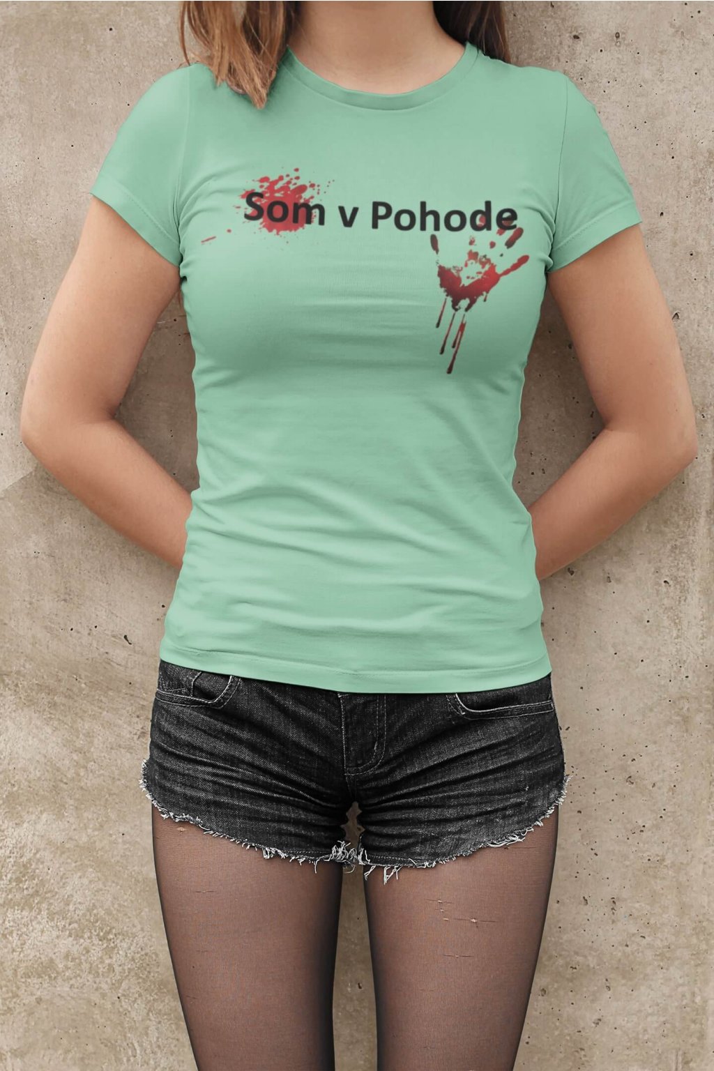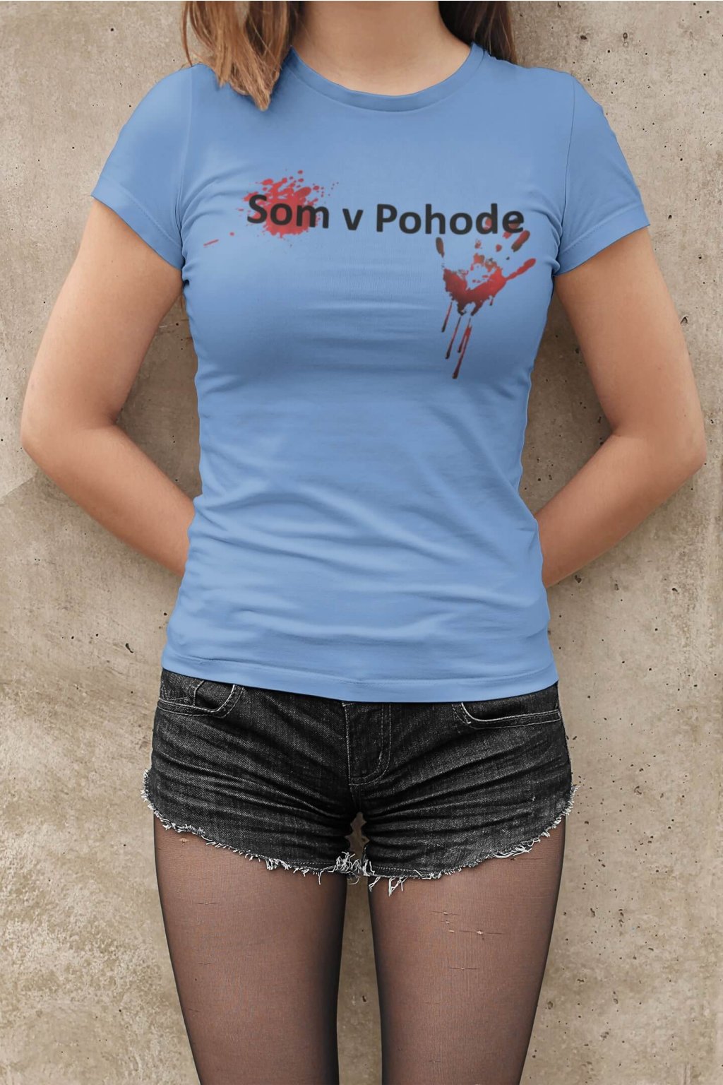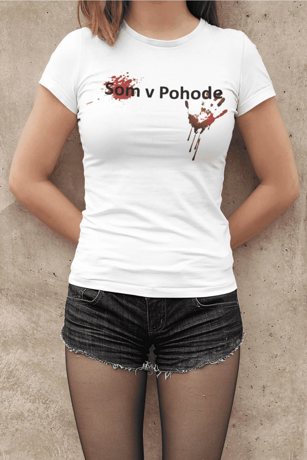 Dámske bavlnené tričko s krátkym rukávom a originálnou potlačou. Na tričku je obrázok ruky s fľakmi krvi a nápis: ,,Som v Pohode."