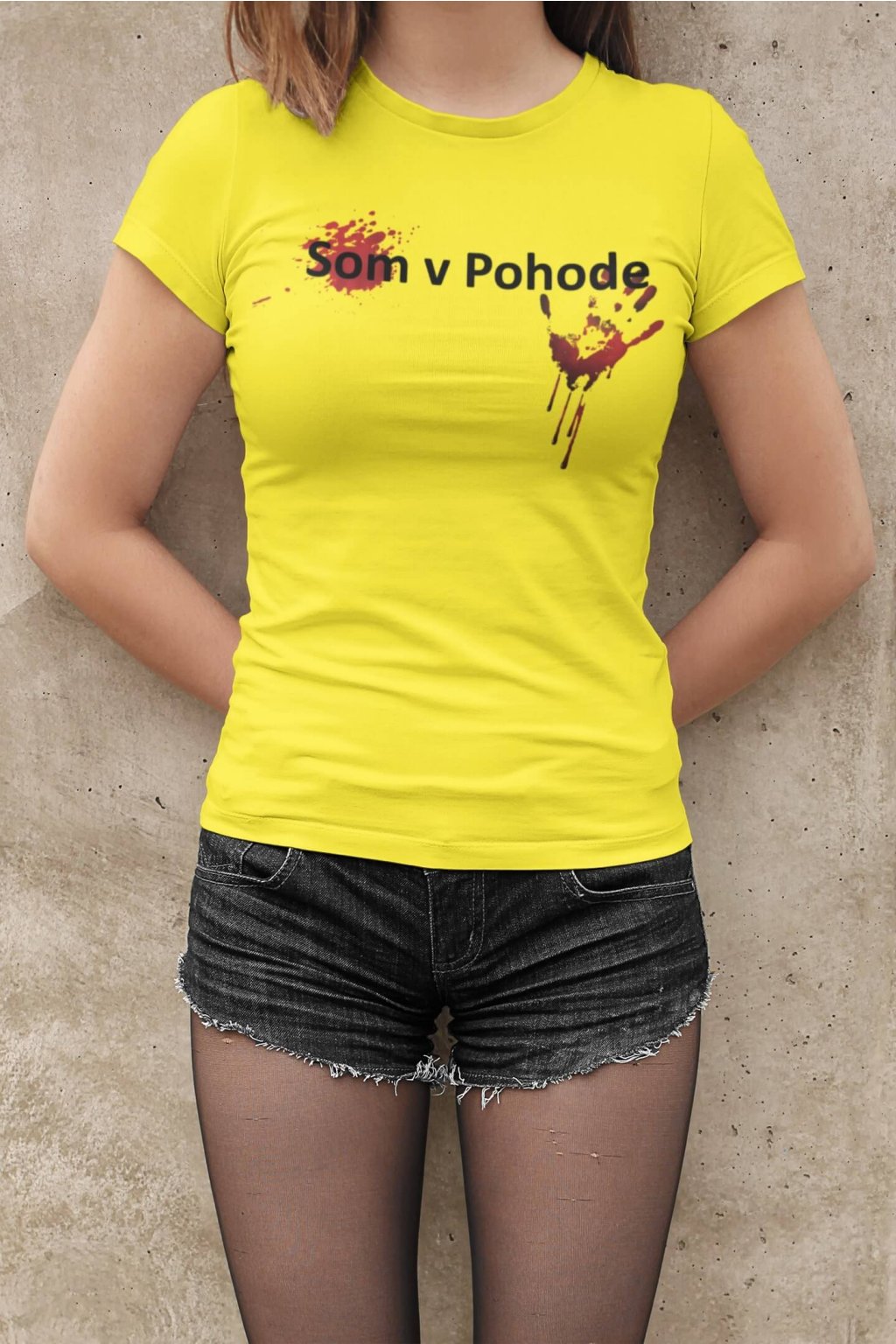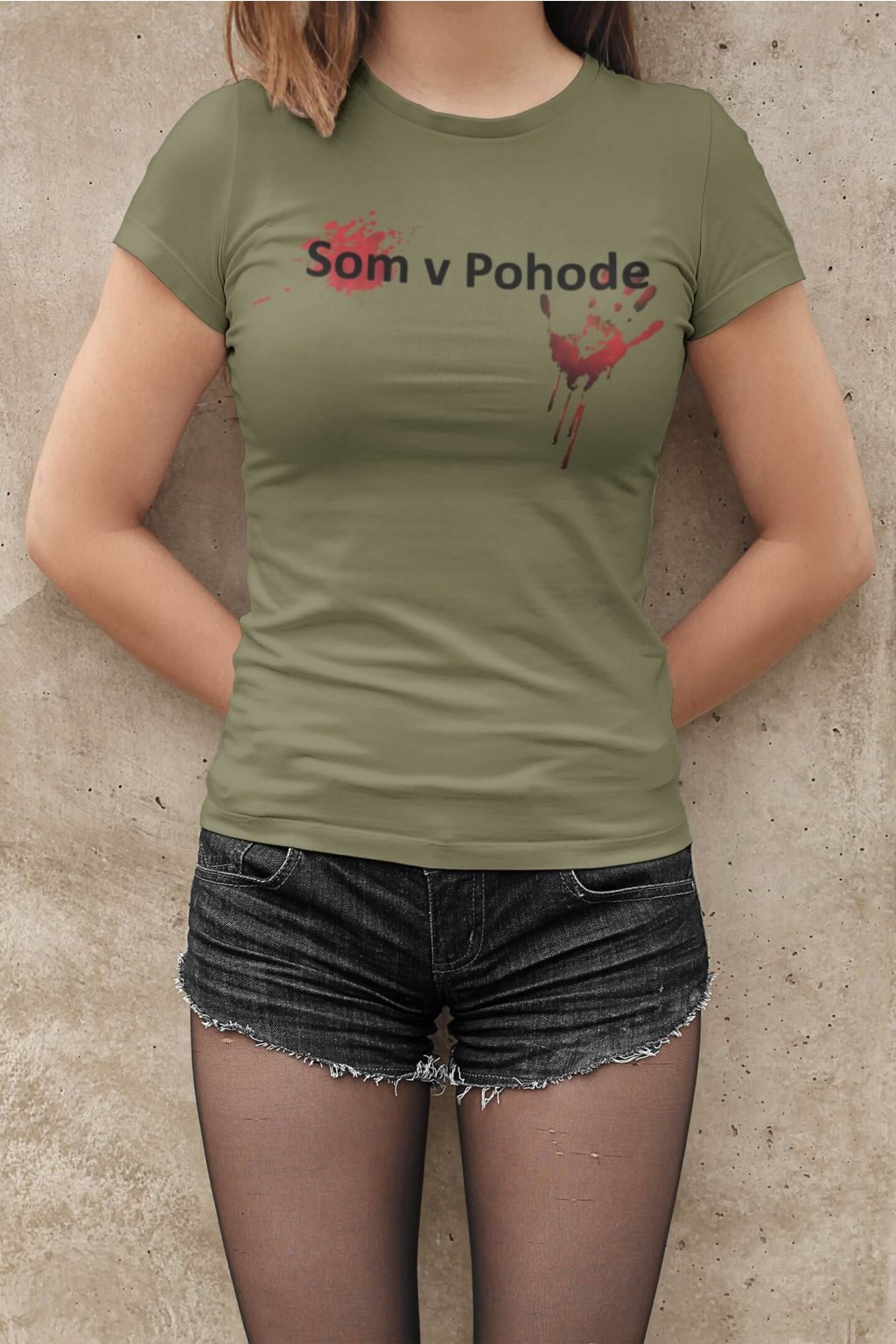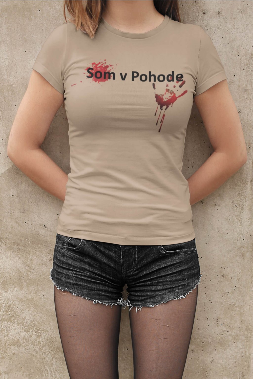 Dámske bavlnené tričko s krátkym rukávom a originálnou potlačou. Na tričku je obrázok ruky s fľakmi krvi a nápis: ,,Som v Pohode."