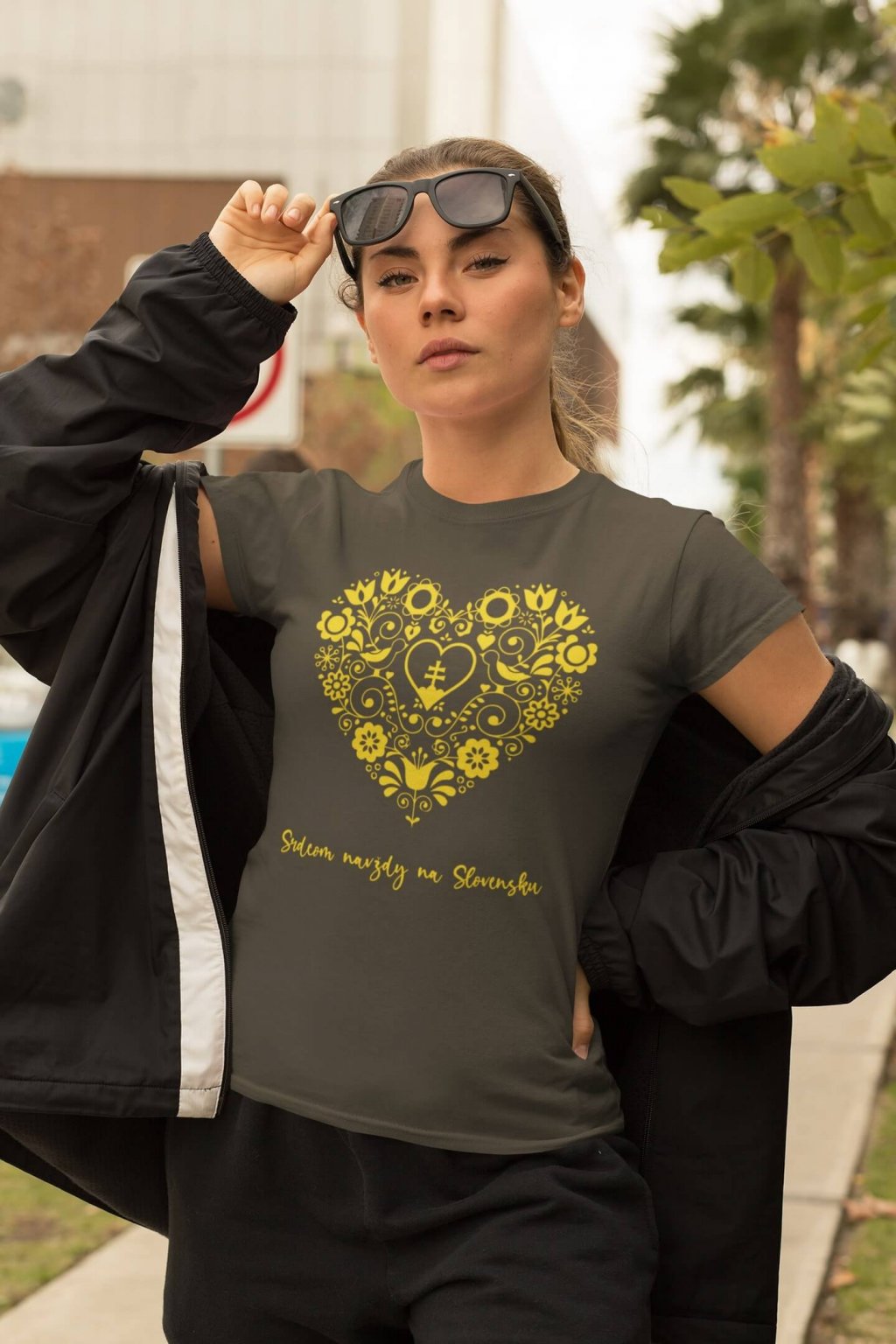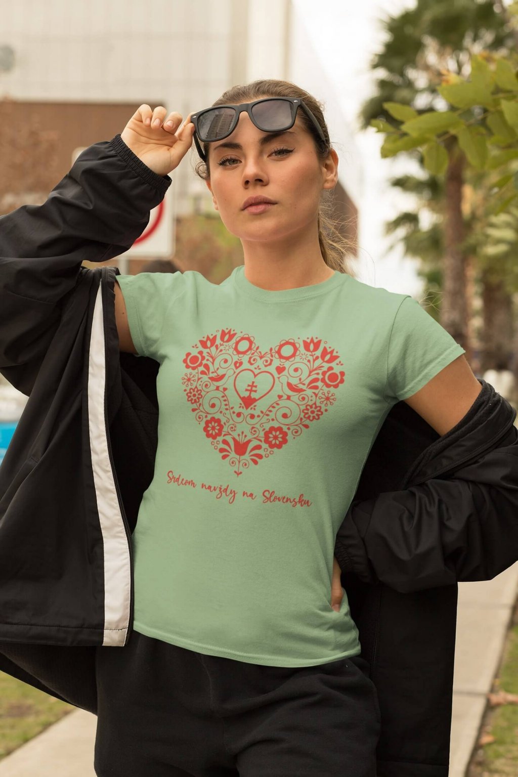 Dámske bavlnené tričko s krátkym rukávom pre hrdú Slovenku. Na tričku je nápis "Srdcom navždy na Slovensku".