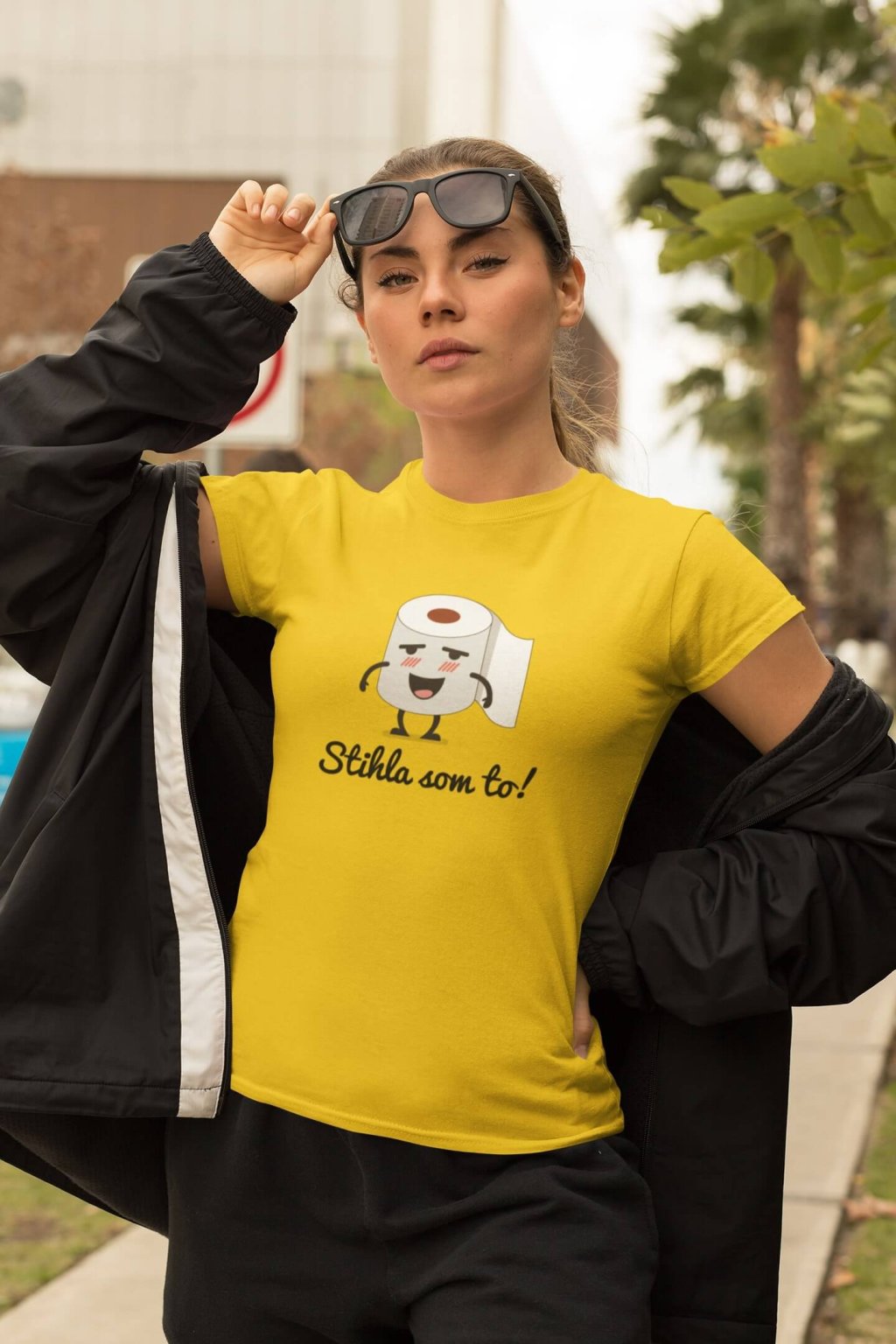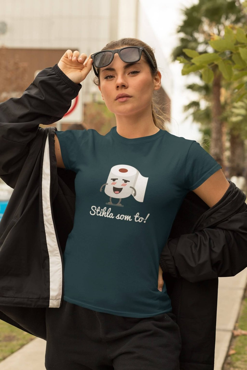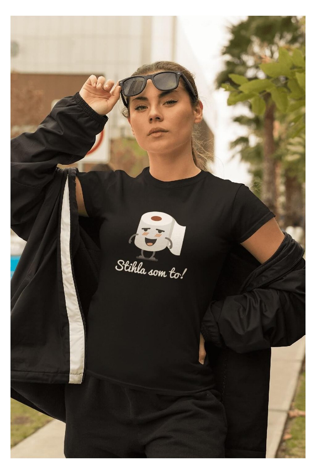 Dámske bavlnené tričko s krátkym rukávom a vtipnou potlačou. Na tričku je zábavný obrázok toaletného papiera a nápis: ,,Stihla som to!" Nie je krajší pocit, ako keď to stihneš.