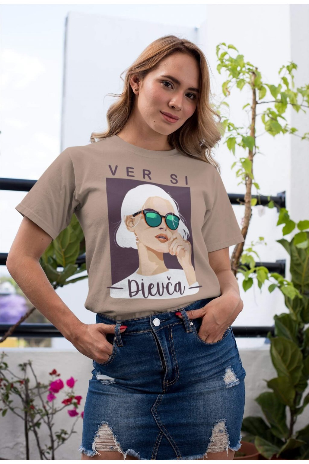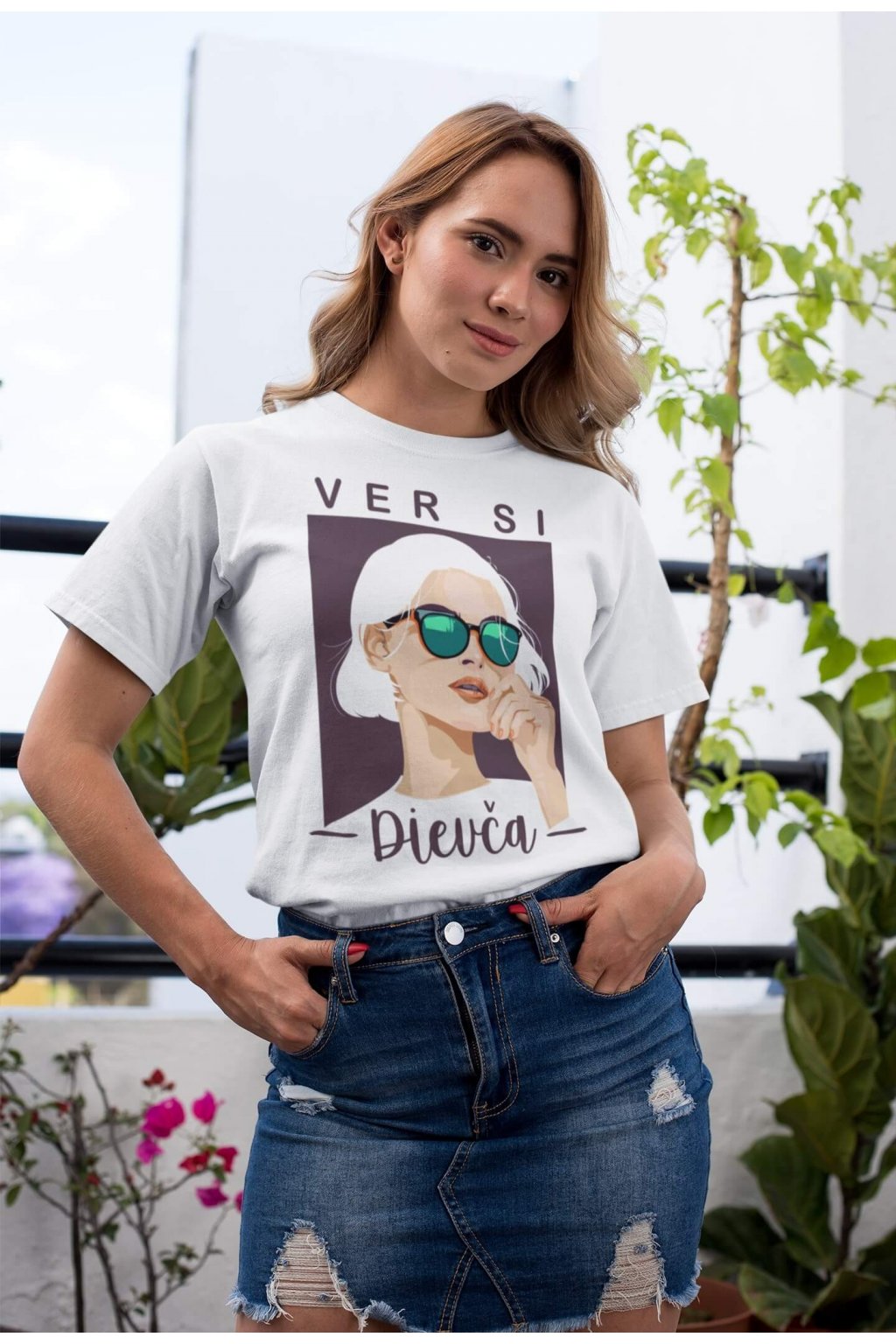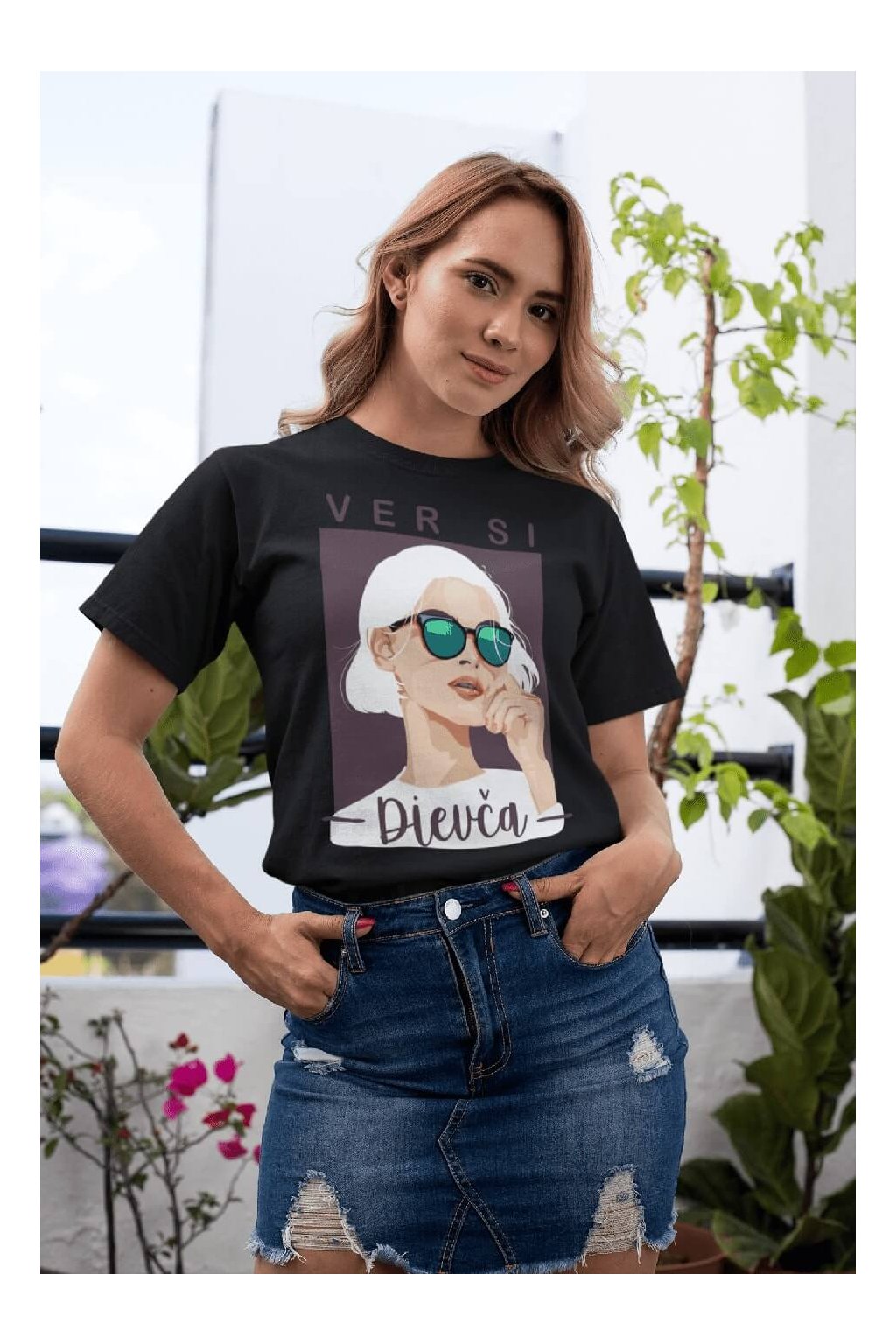 Dámske bavlnené tričko s krátkym rukávom s portrétom ženy a nápisom "VER SI Dievča," ktoré poteší každú ambicióznu a cieľavedomú ženu.