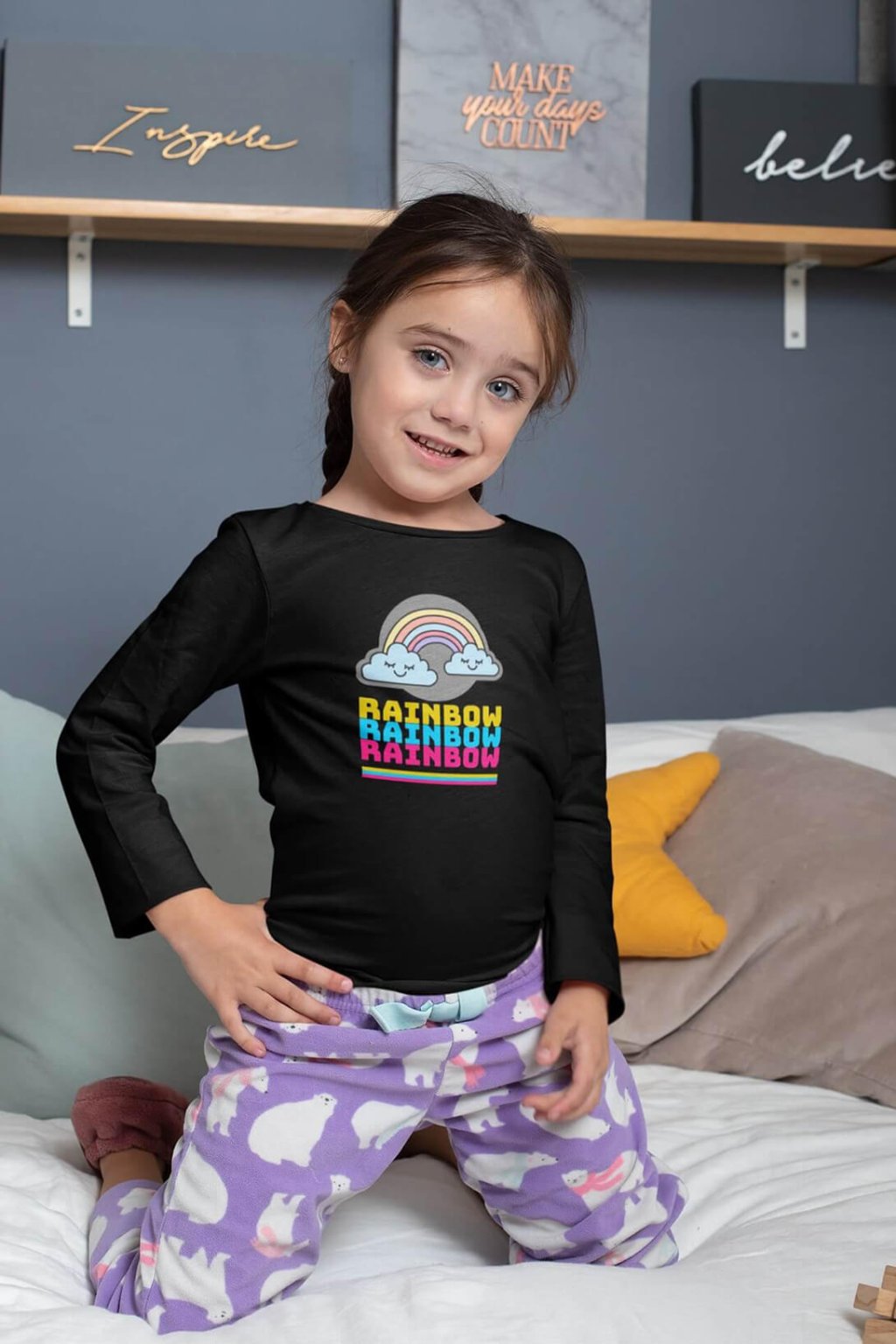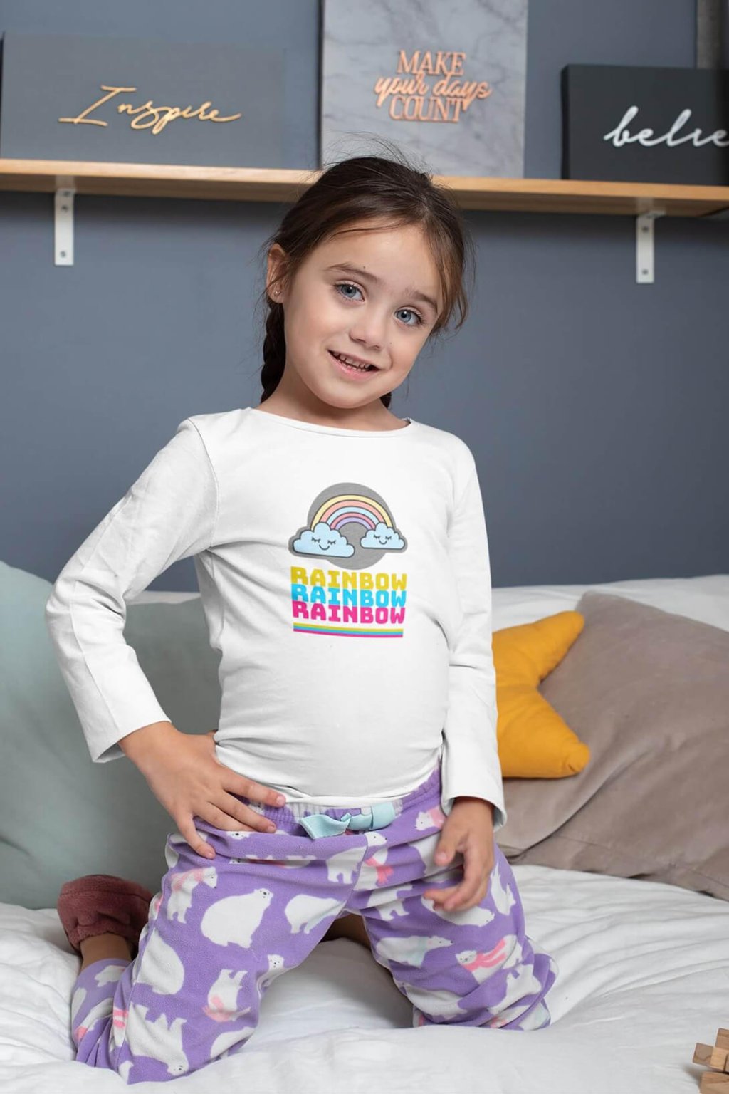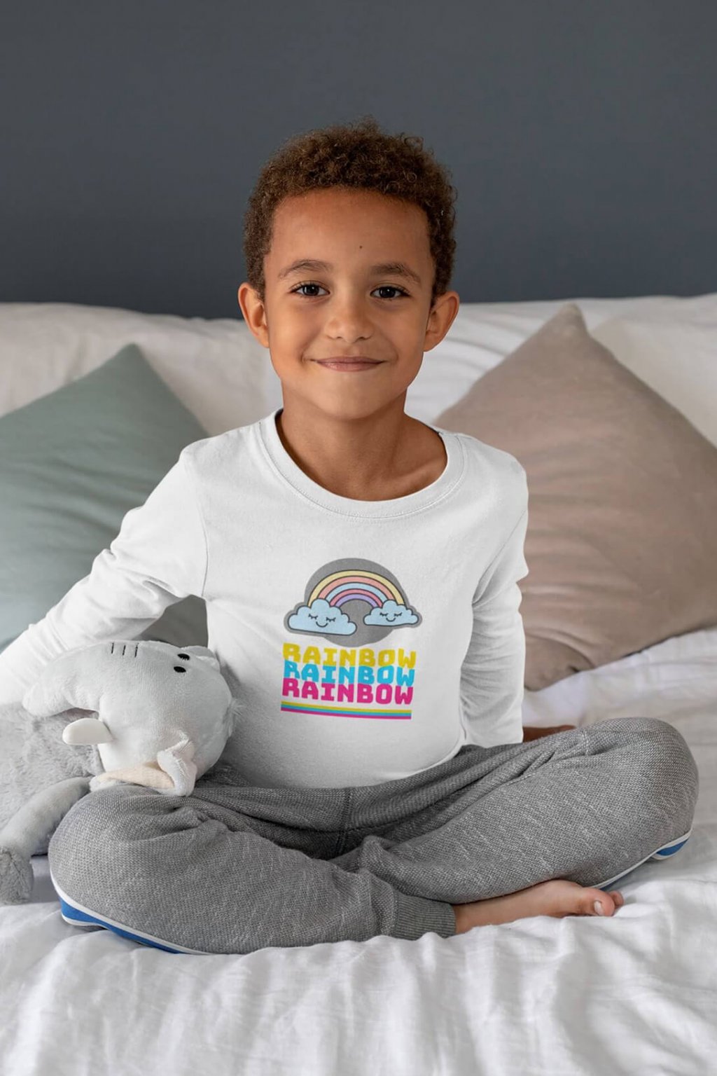 Detské bavlnené tričko s dlhým rukávom a trojitým nápisom "rainbow", čo v preklade znamená "dúha" a taktiež s obrázkom veselej dúhy nad textom. Vhodné pre deti, ktoré sú večne vysmiate. Tričko je vhodné pre dievča aj chlapca.