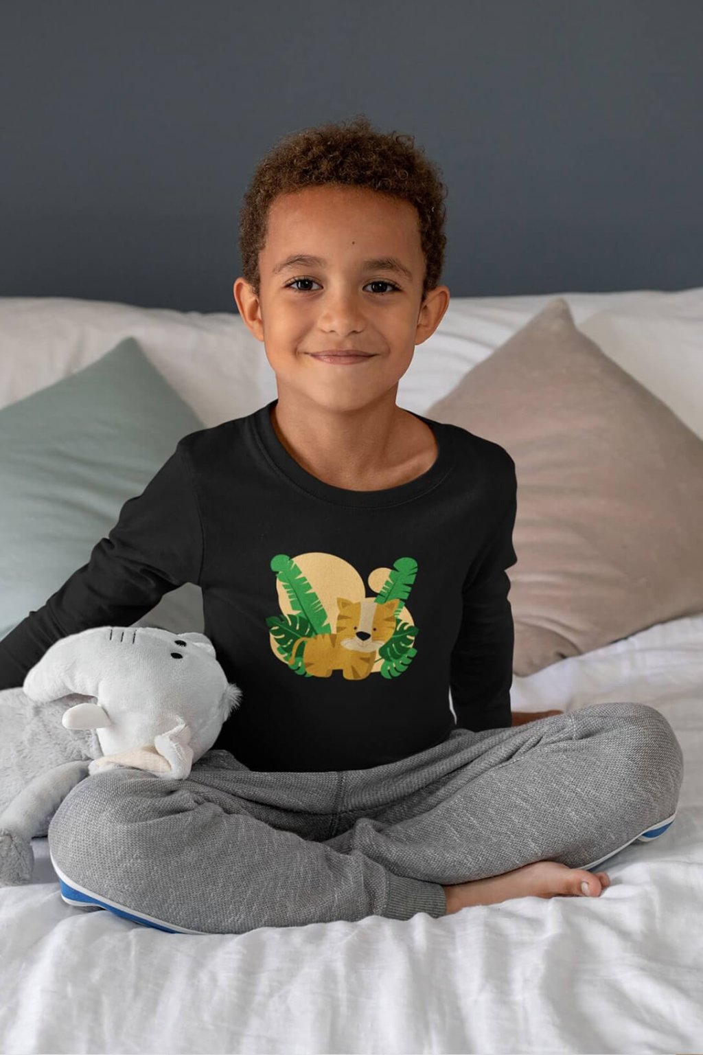 Detské bavlnené tričko s dlhým rukávom a obrázkom kresleného leva v svojom typickom prostredí. Tričko je vhodné pre dievča aj chlapca.