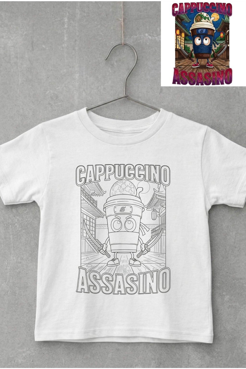 Detské bavlnené tričko s krátkym rukávom, na ktorom je motív Cappuccino Assasino, ktorý si môžete vyfarbiť. Rozvíjajte kreativitu a hravosť svojich ratolestí zaujímavým spôsobom.