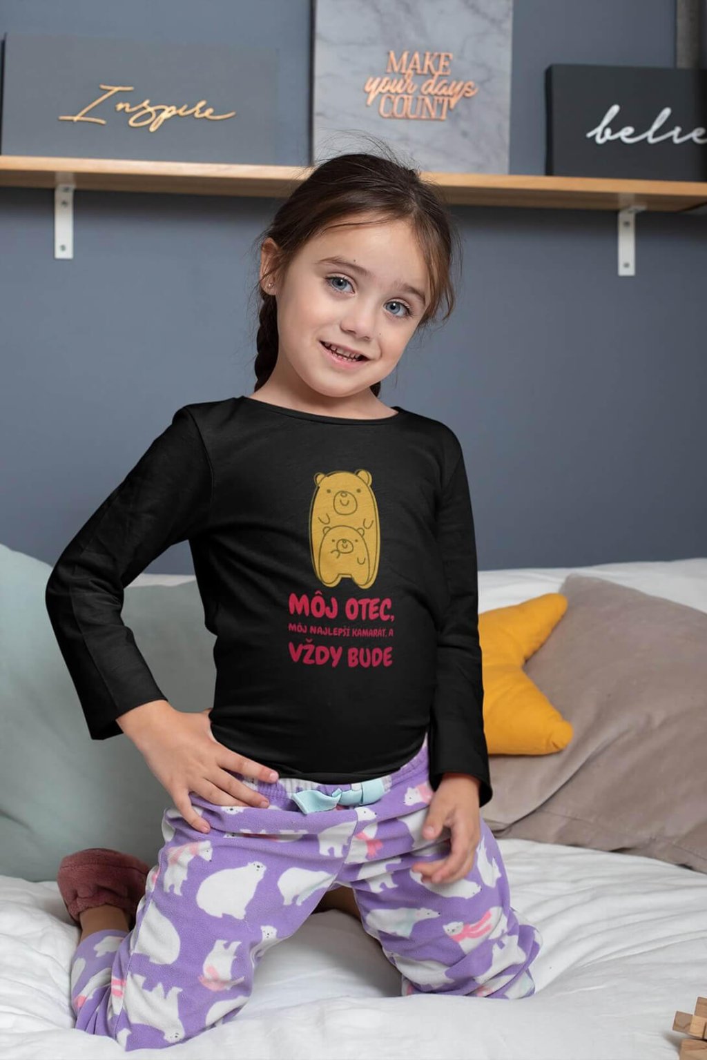 Dievčenské bavlnené tričko s dlhým rukávom a dvoma rozkošnými medvedíkmi ako obrázok otca a jeho dcéry s nápisom "môj otec, môj najlepší kamarát, a vždy bude".