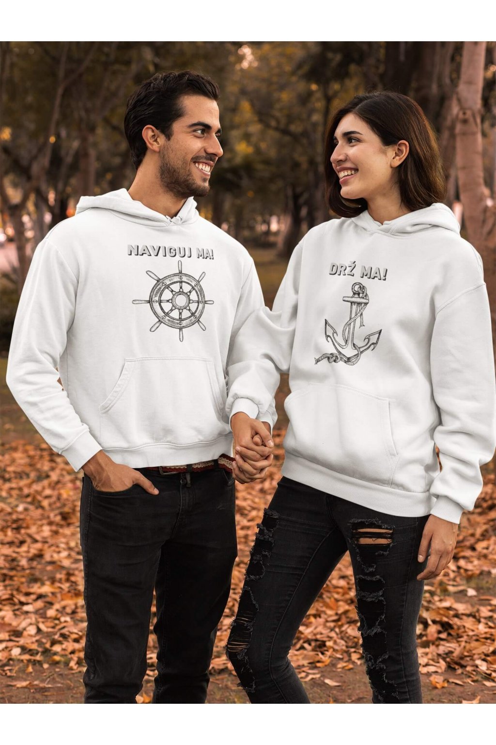 Bavlnené mikiny pre páry s roztomilou potlačou. Na pánskej mikine je obrázok kormidla s nápisom: ,,Naviguj ma!" Dámy majú na svojej mikine obrázok kotvy, nad ktorou je nápis: ,,Drž ma!" Mikiny, ktoré sa vzájomne dopĺňajú potešia všetkých zamilovaných.