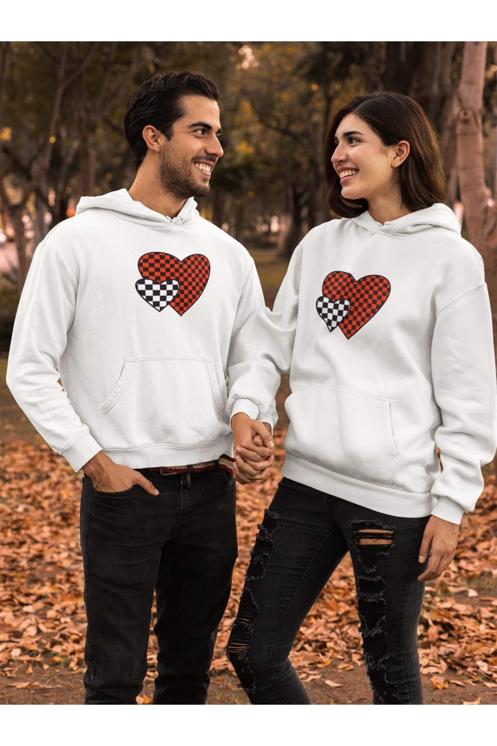 Bavlnené mikiny pre páry s roztomilou potlačou. Na pánskej a na ženskej mikine je potlač dvoch károvaných srdiečok.