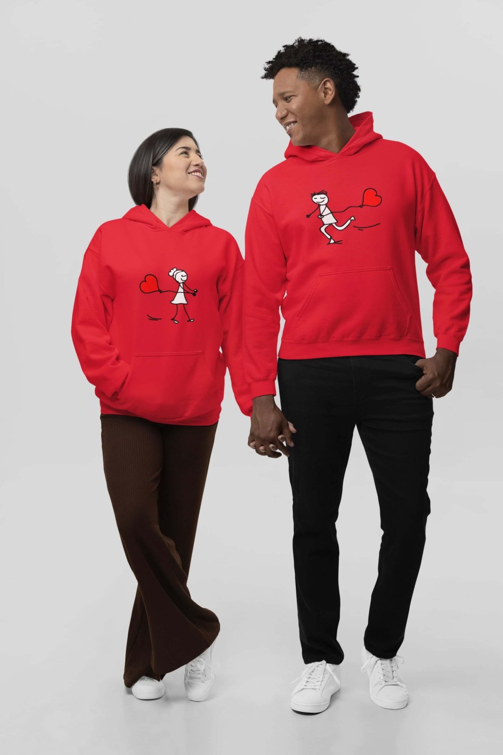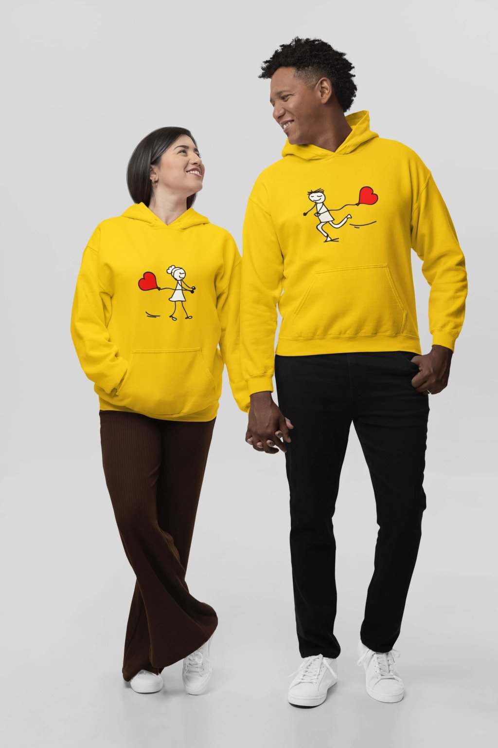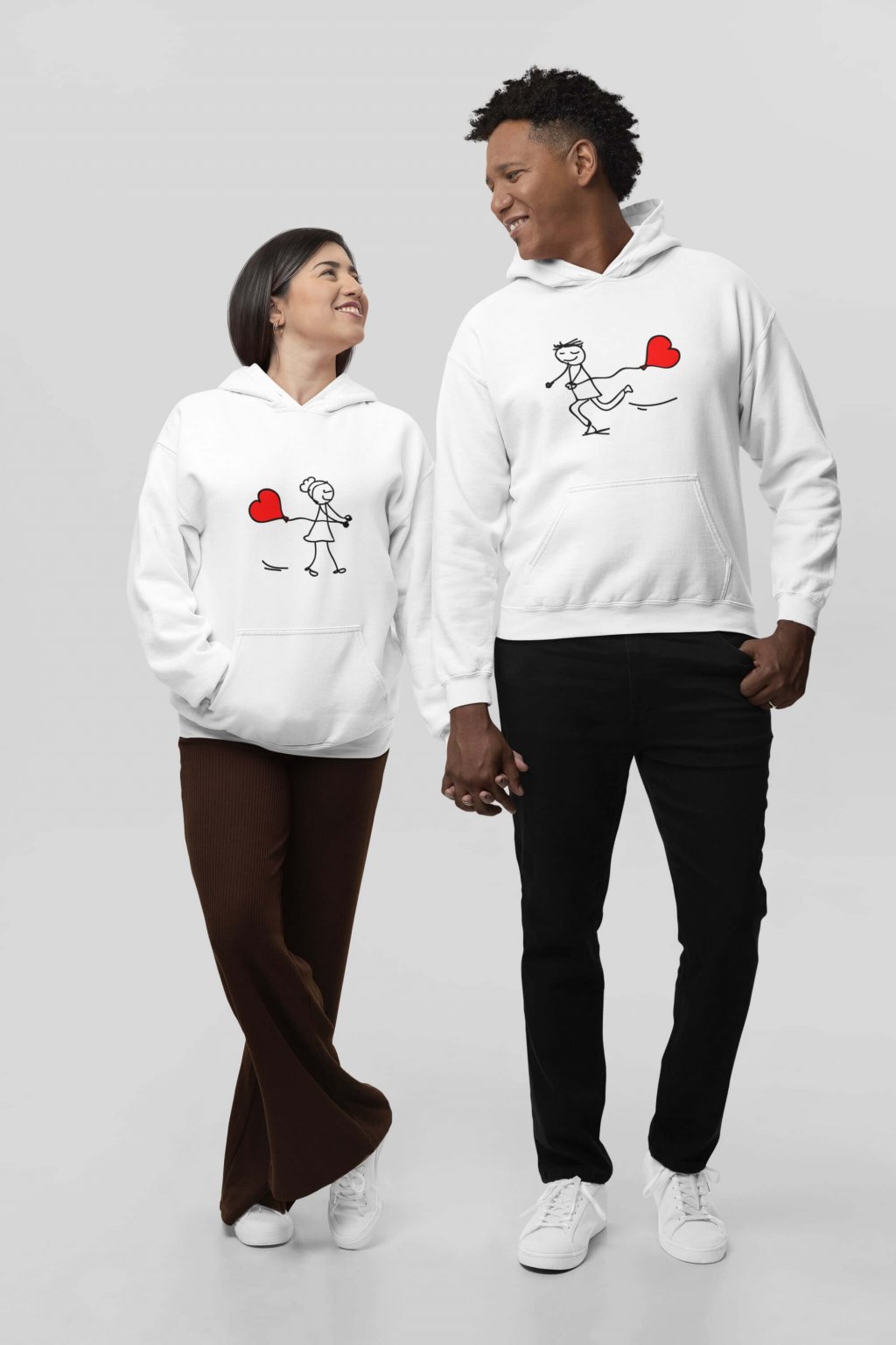 Bavlnené mikiny pre páry s roztomilou potlačou. Na mikinách je kreslený obrázok postavičiek, ktoré sú do seba zaľúbené, bežiac k sebe s balónikom v tvare srdiečka. Mikiny, ktoré sa vzájomne dopĺňajú potešia všetkých zamilovaných.