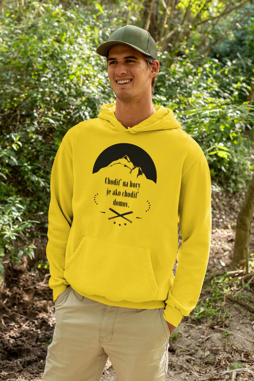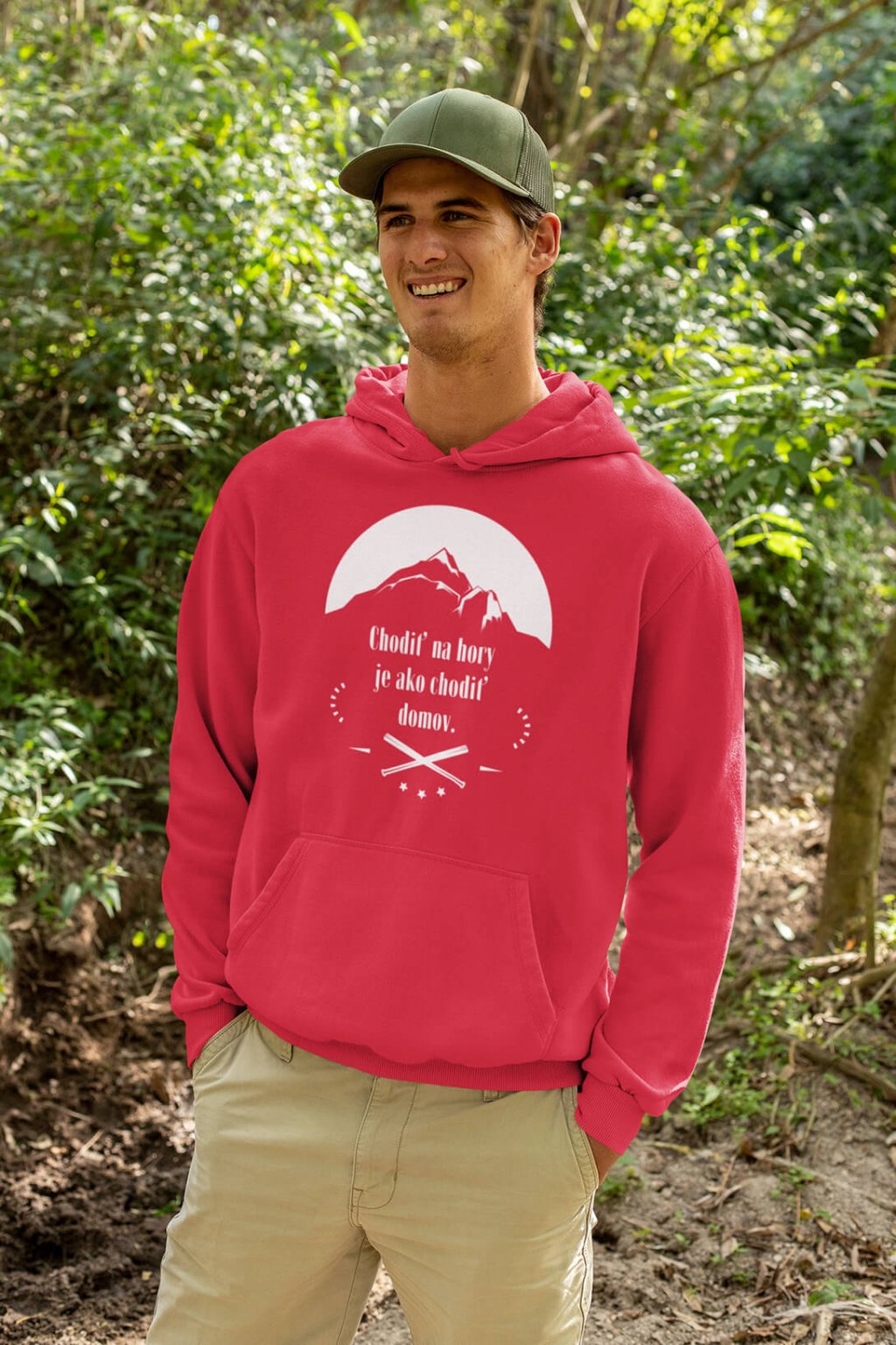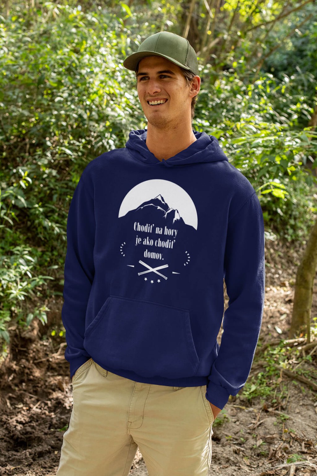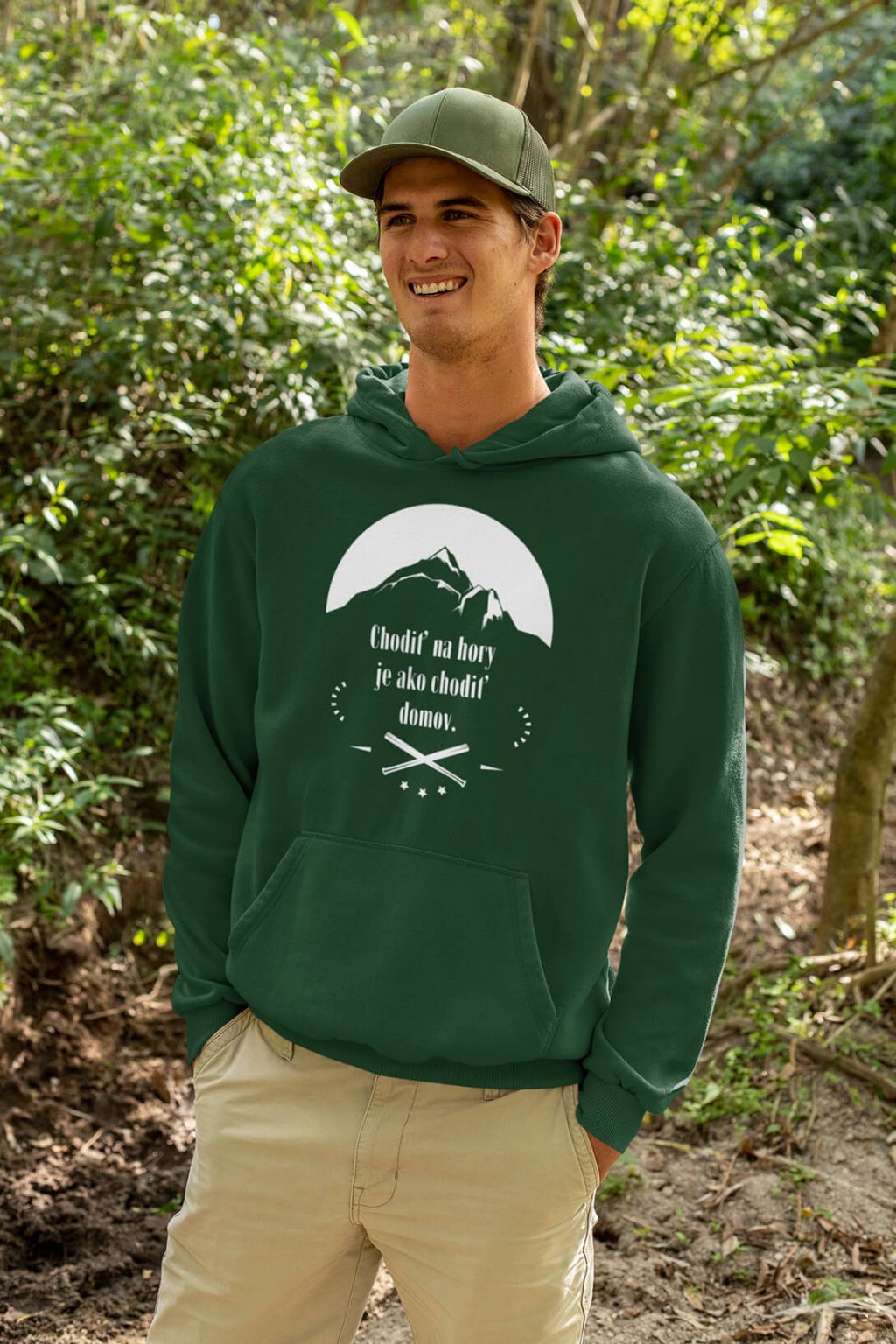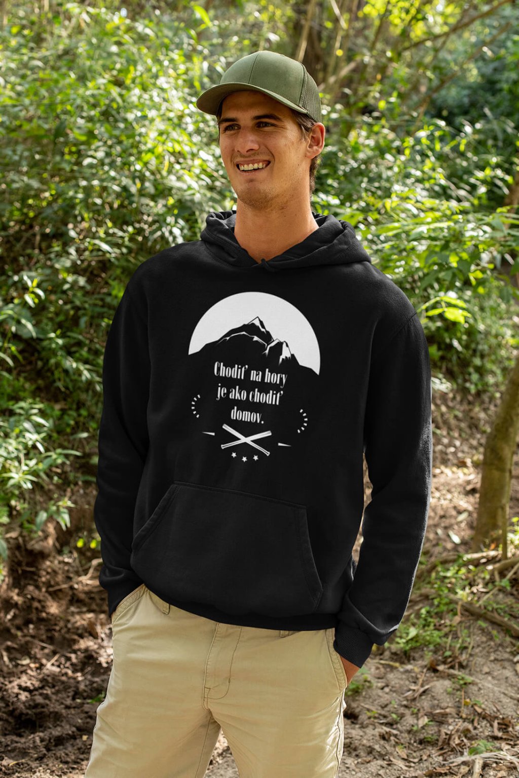 Pánska bavlnená mikina s kapucňou a turistickou potlačou. Na mikine je obrázok s motívom hôr a nápisom: ,,Chodiť na hory je ako chodiť domov".