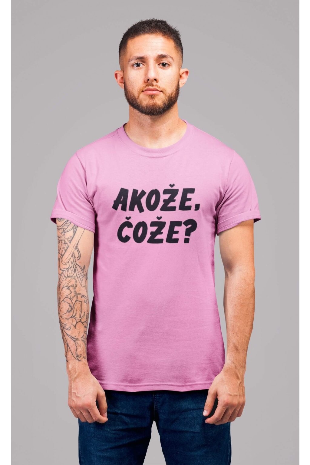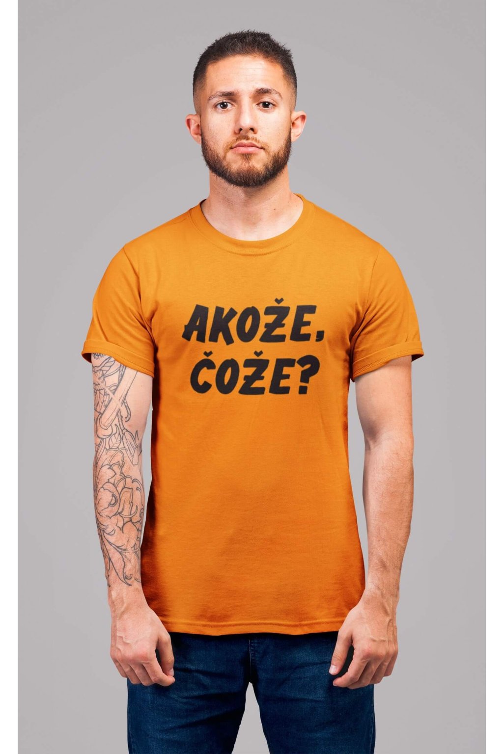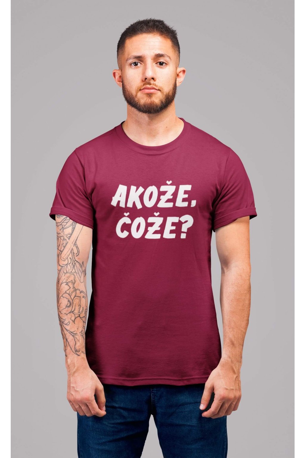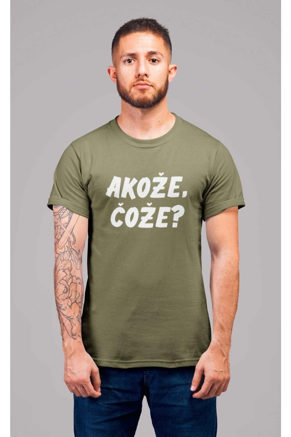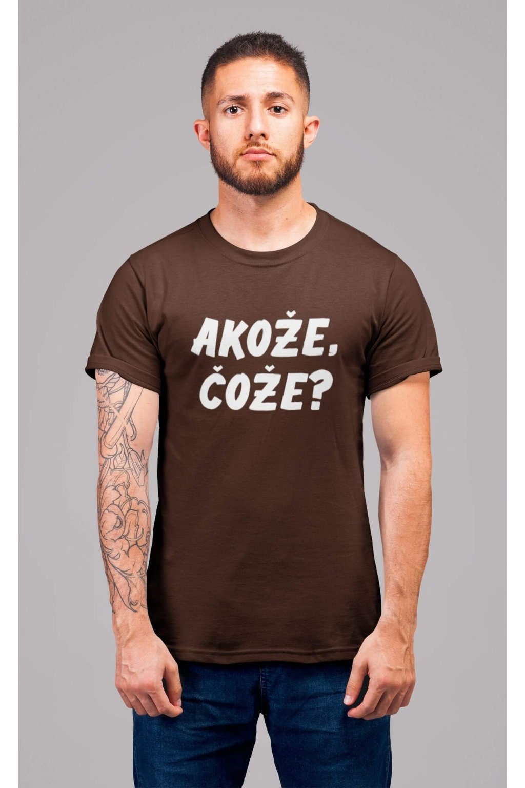 Pánske bavlnené tričko s krátkym rukávom a s vtipnou potlačou. Na originálnom tričku je výrazný nápis: ,,AKOŽE, ČOŽE?"