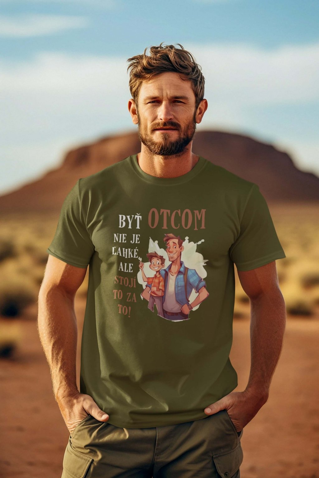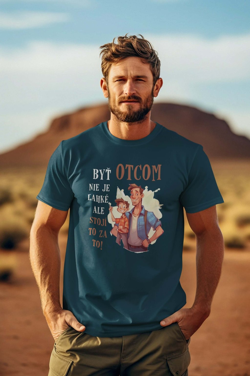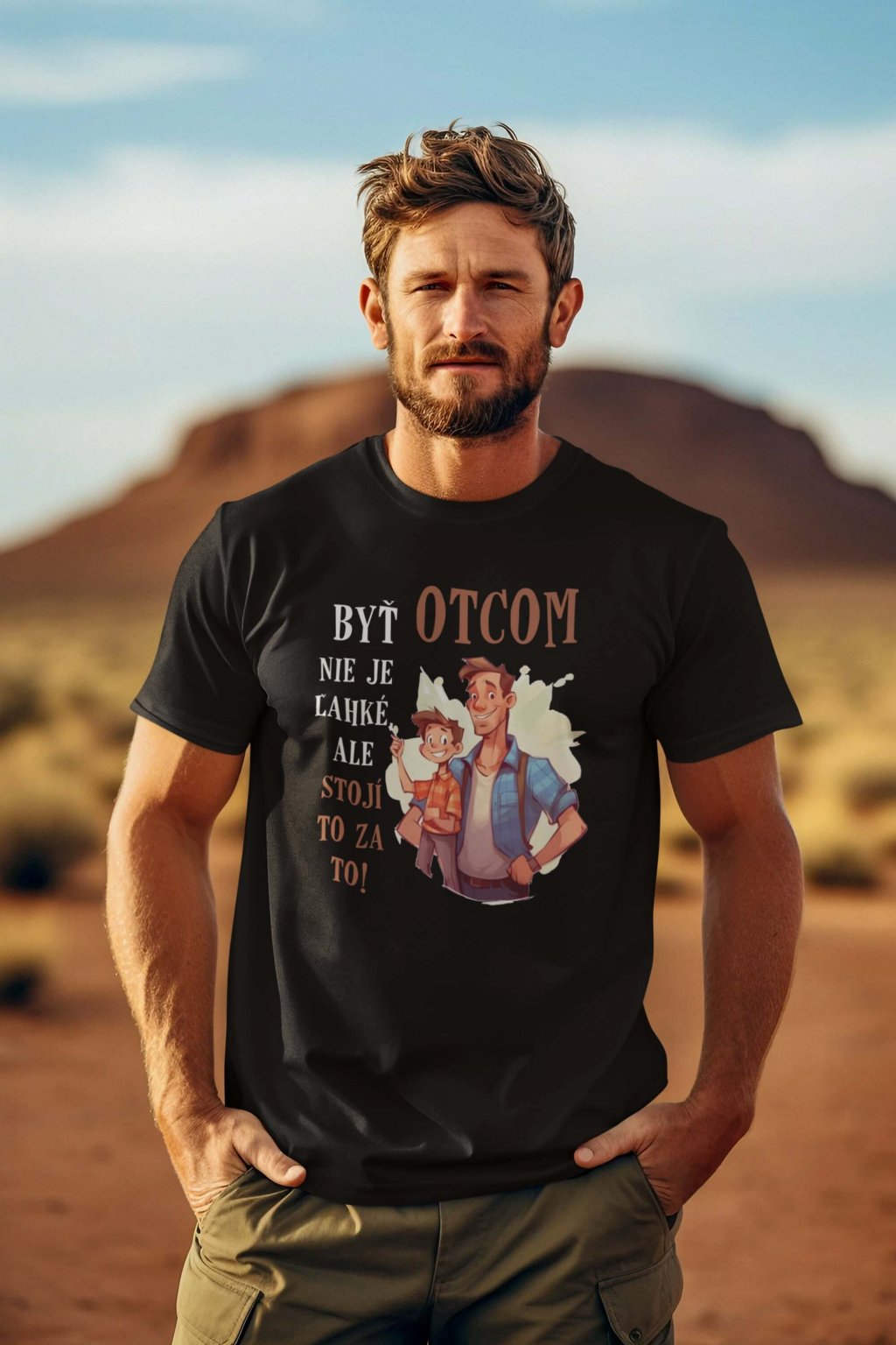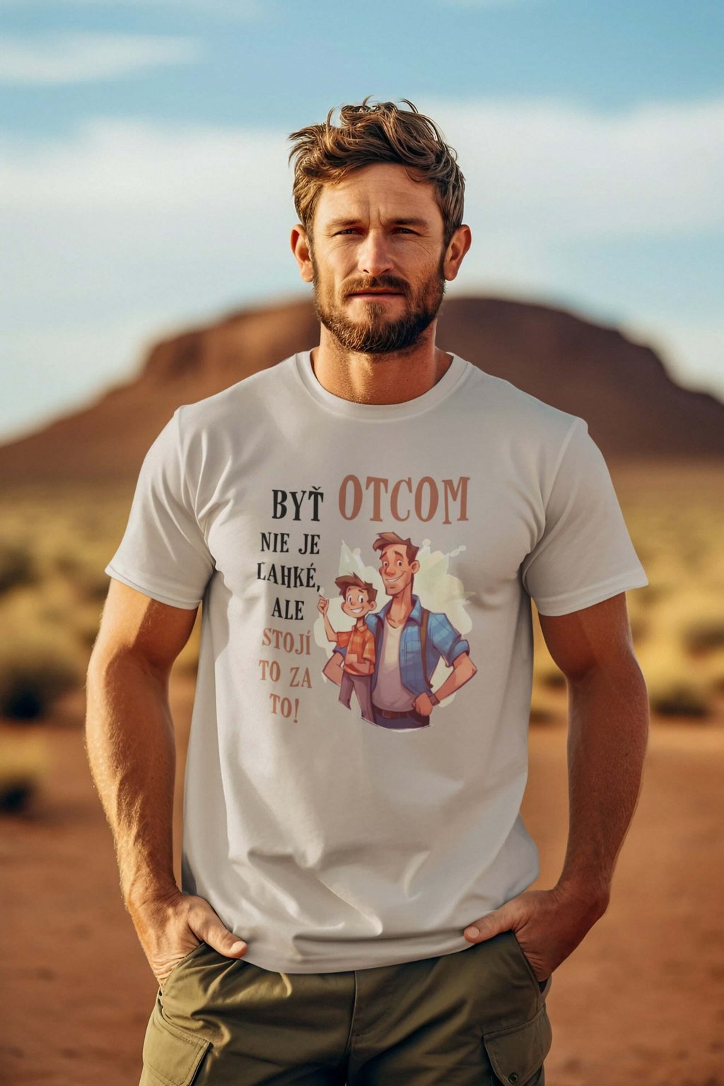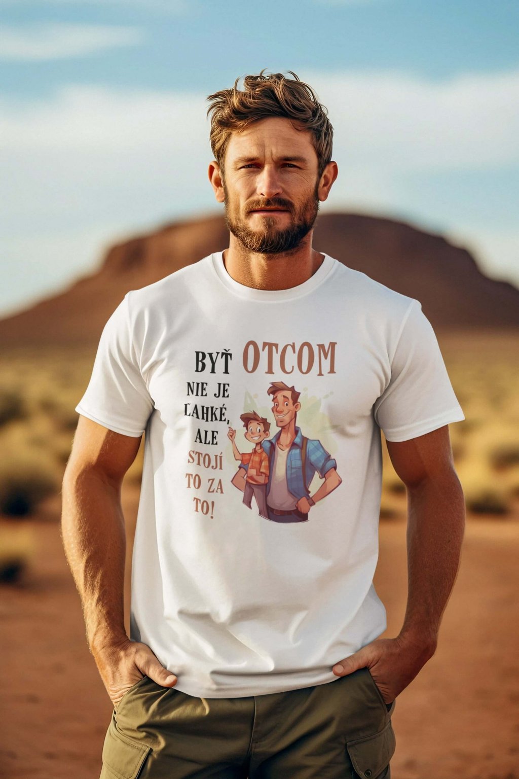 Pánske bavlnené tričko s krátkym rukávom, na ktorom je napísané: "Byť otcom nie je ľahké, ale stojí to za to!" a obrázok otca s dieťaťom.