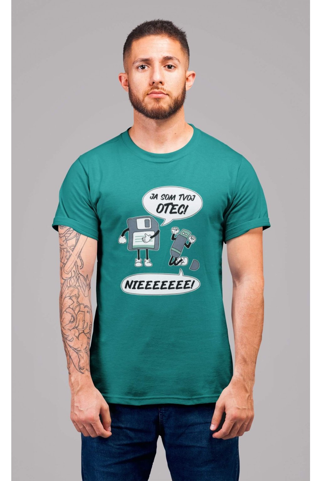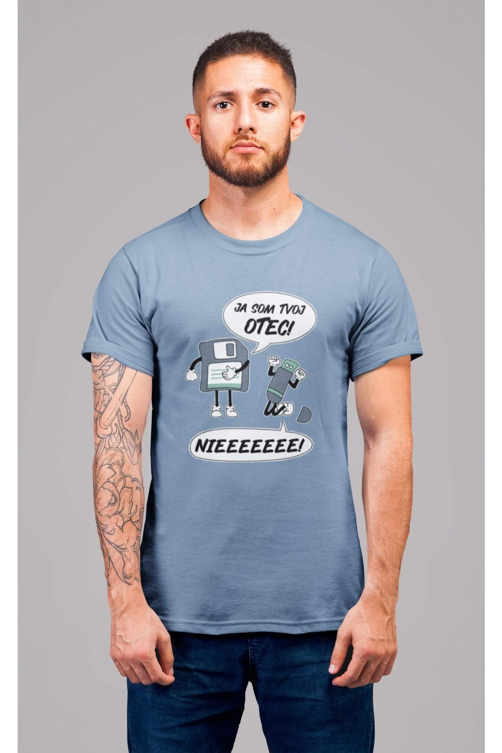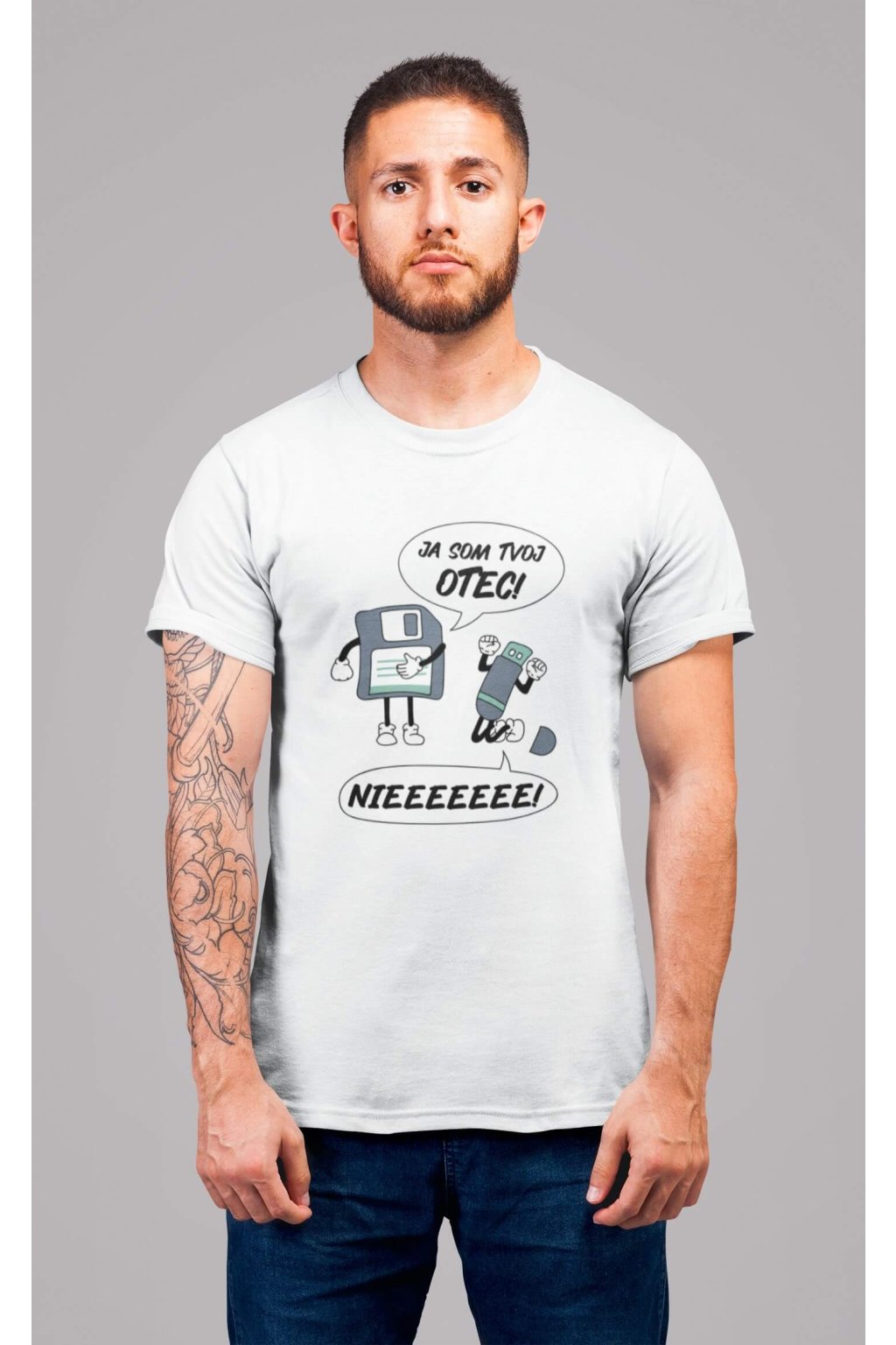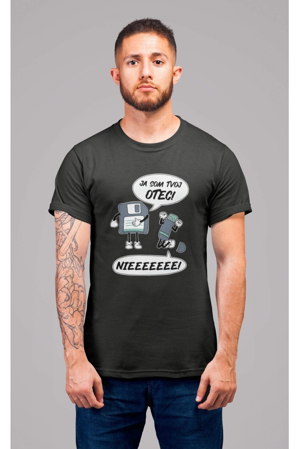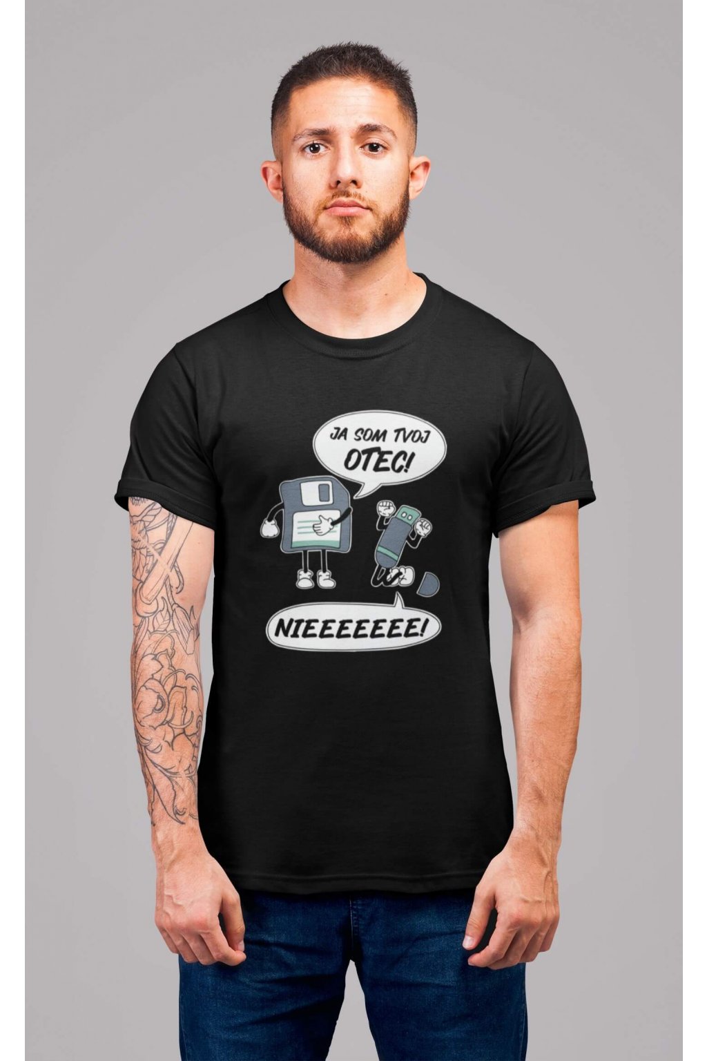 Pánske bavlnené tričko s krátkym rukávom s vtipnou potlačou. Na tričku je vtipný motív starej diskety, ktorá hovorí "JA SOM TVOJ OTEC" a USB, ktoré kričí "NIEEEEEE."