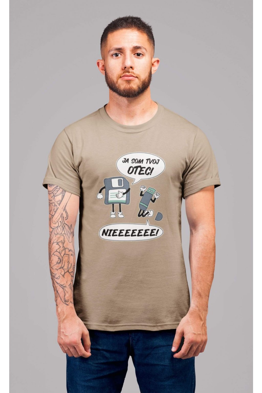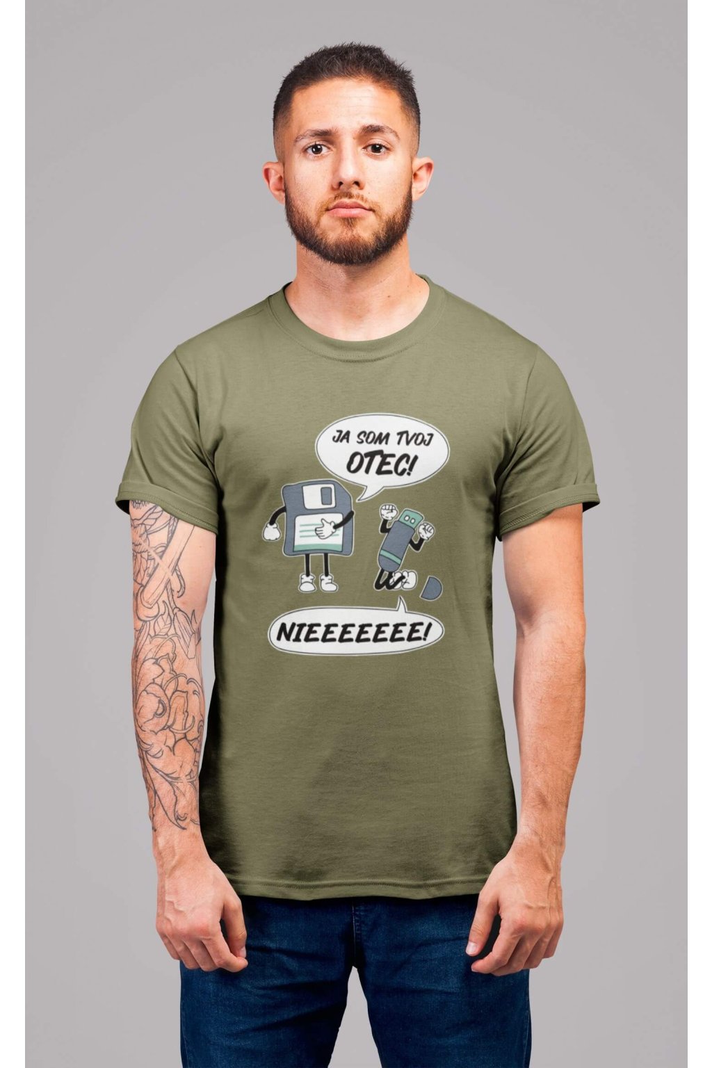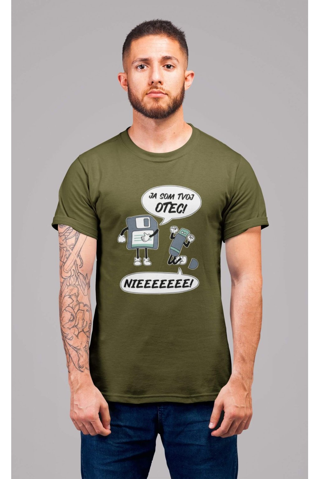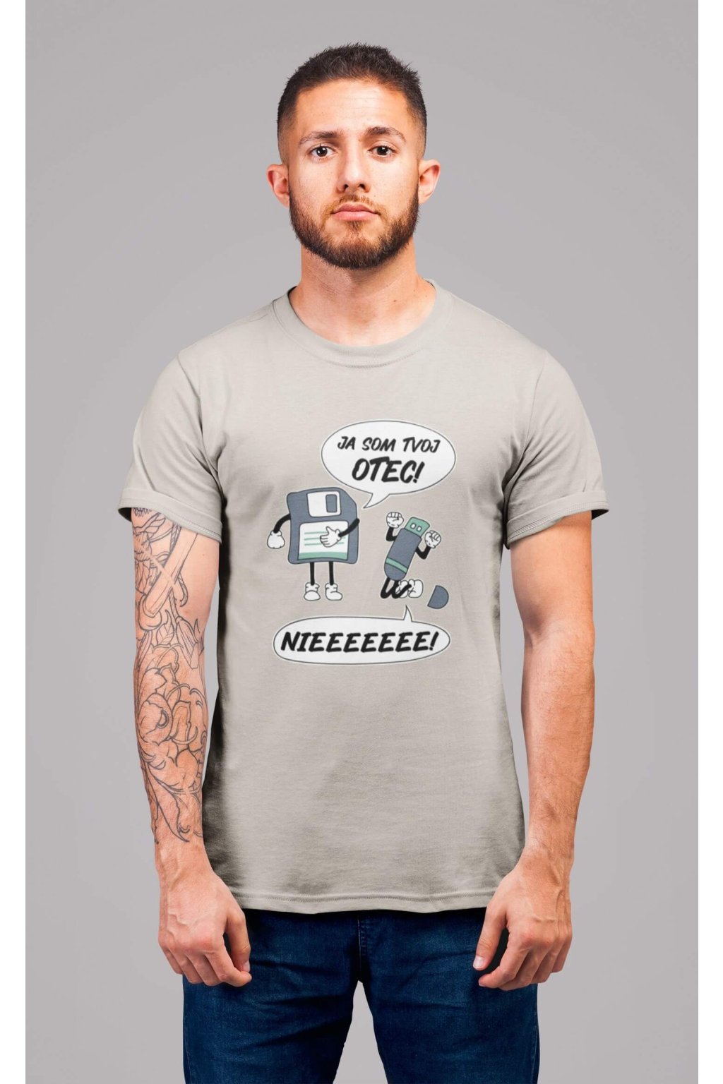 Pánske bavlnené tričko s krátkym rukávom s vtipnou potlačou. Na tričku je vtipný motív starej diskety, ktorá hovorí "JA SOM TVOJ OTEC" a USB, ktoré kričí "NIEEEEEE."