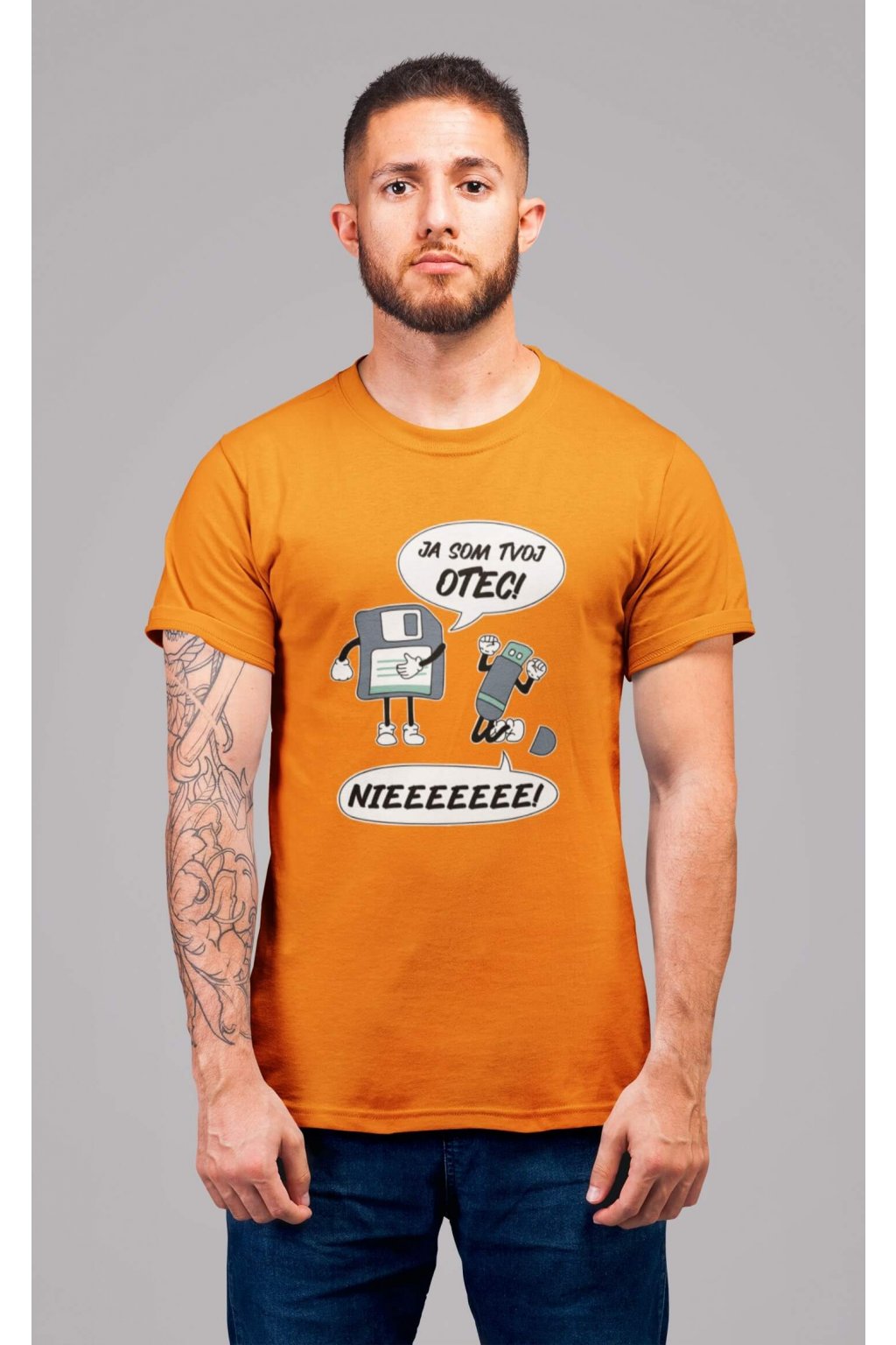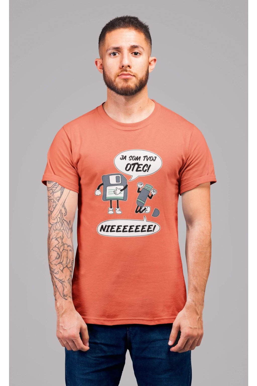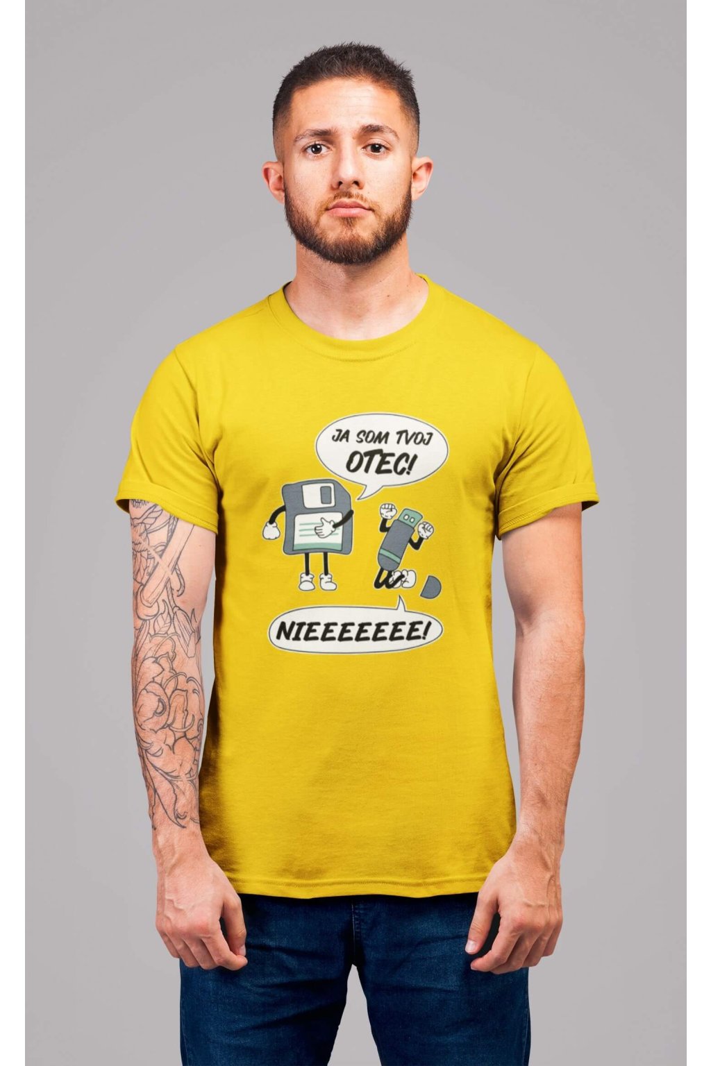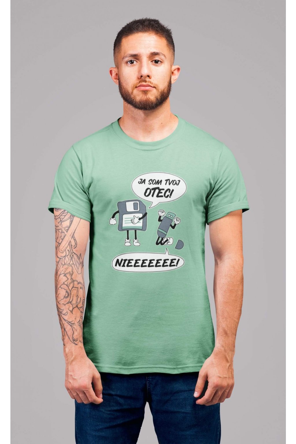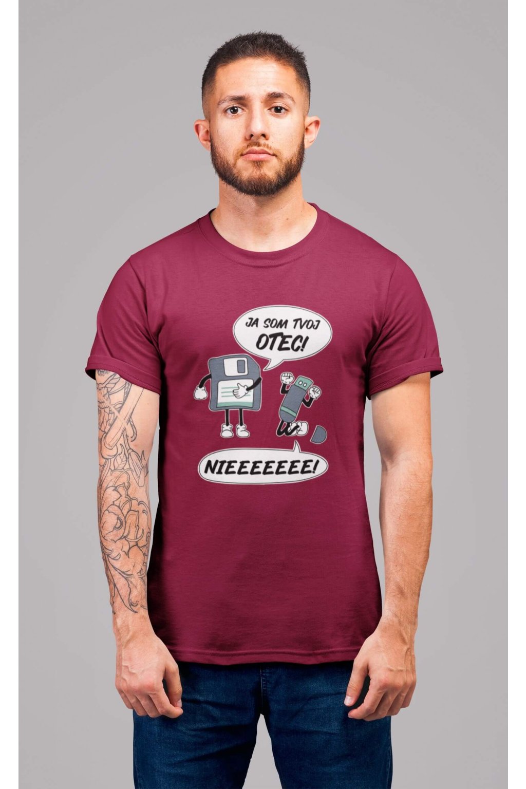 Pánske bavlnené tričko s krátkym rukávom s vtipnou potlačou. Na tričku je vtipný motív starej diskety, ktorá hovorí "JA SOM TVOJ OTEC" a USB, ktoré kričí "NIEEEEEE."