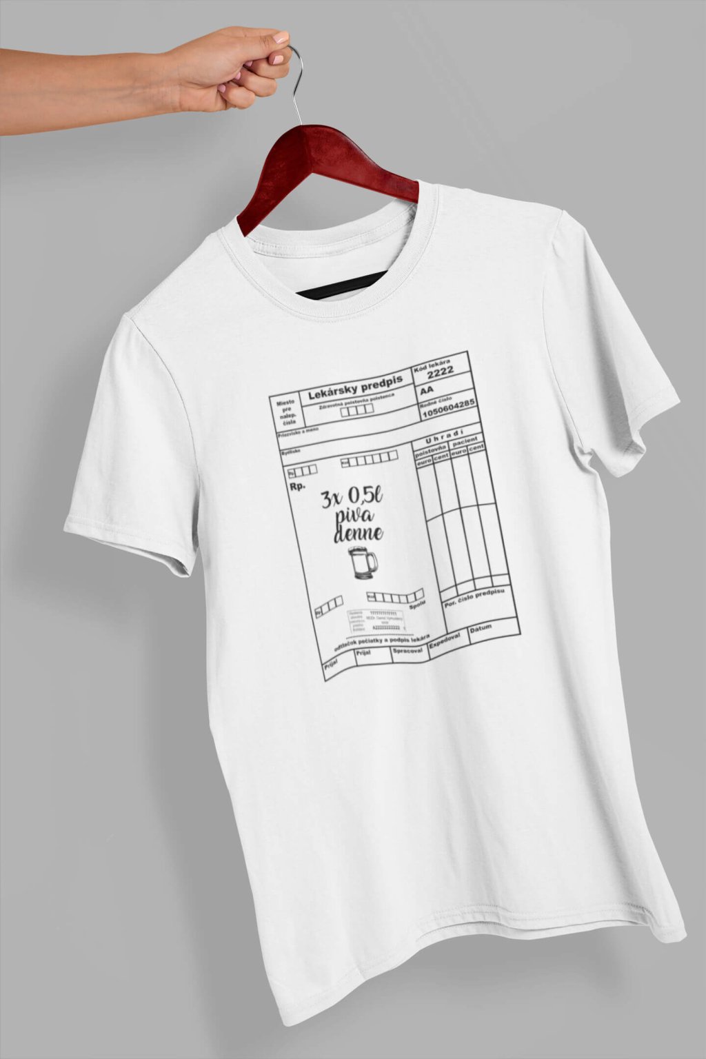 Pánske bavlnené tričko s krátkym rukávom a grafikou, na ktorej je obrázok lekárskeho predpisu, v ktorom je vpísané 3x 0,5l piva denne. Meno, priezvisko a bydlisko je potrebné si doplniť do poznámky tak, aby tričko mohlo byť personalizované.