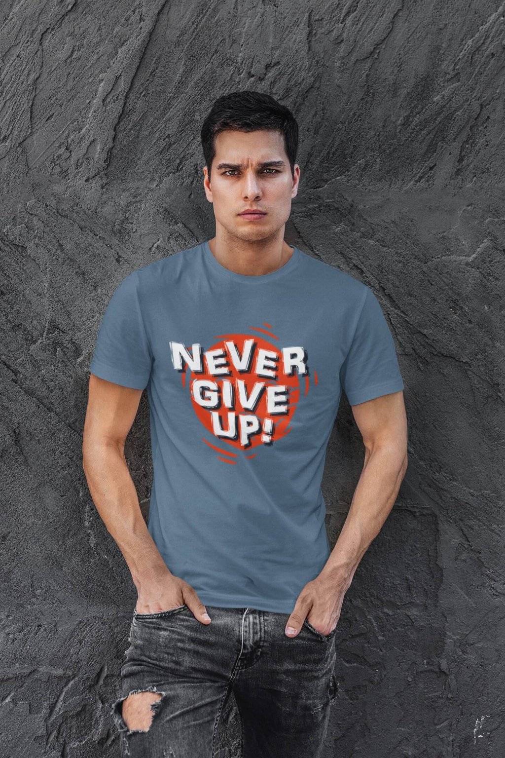 Pánske bavlnené tričko s krátkym rukávom a nápisom "NEVER GIVE UP," čo v preklade znamená "nikdy sa nevzdávaj."