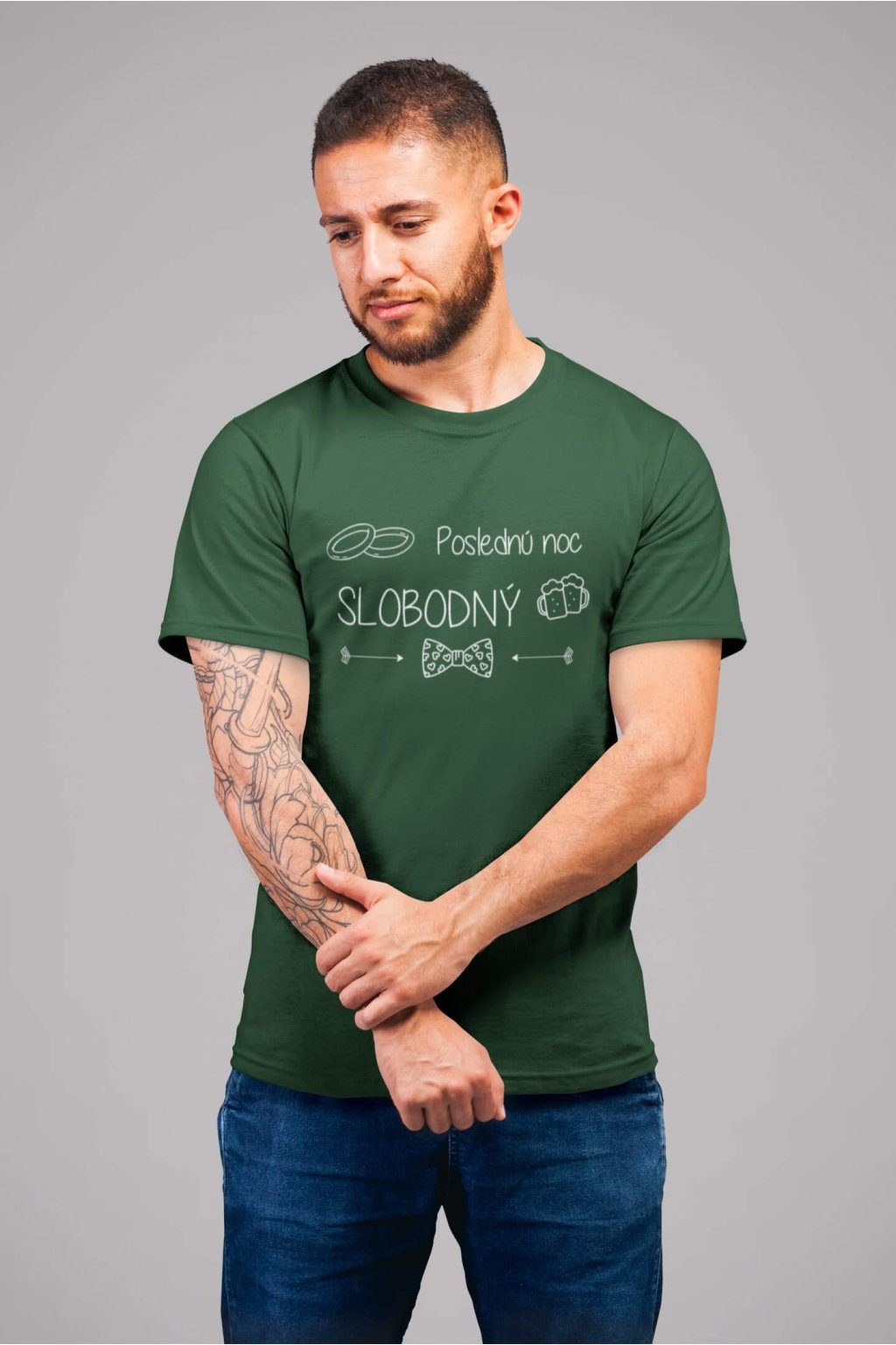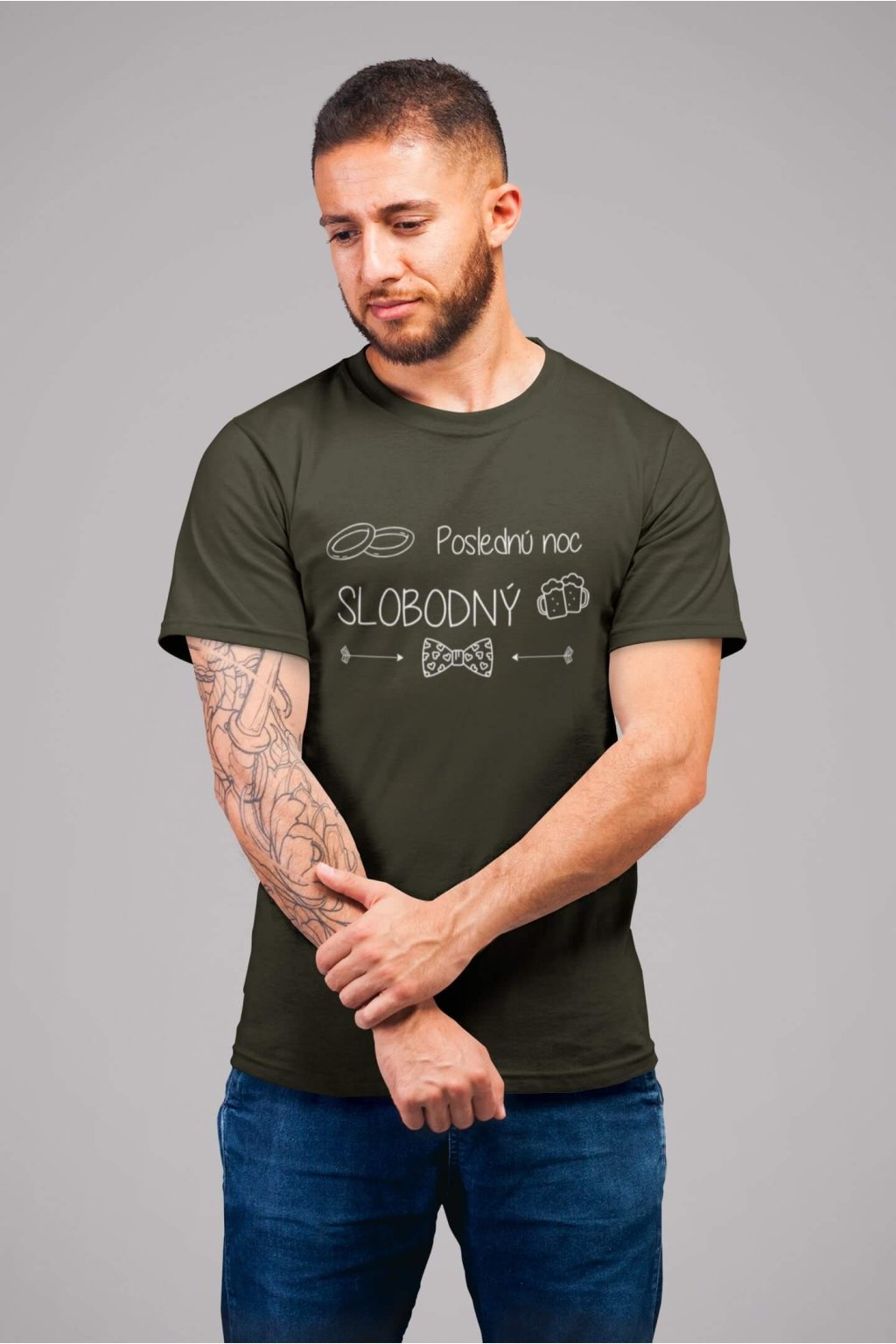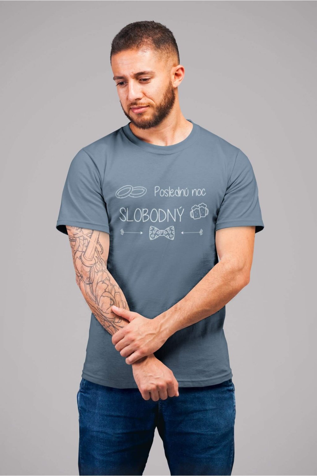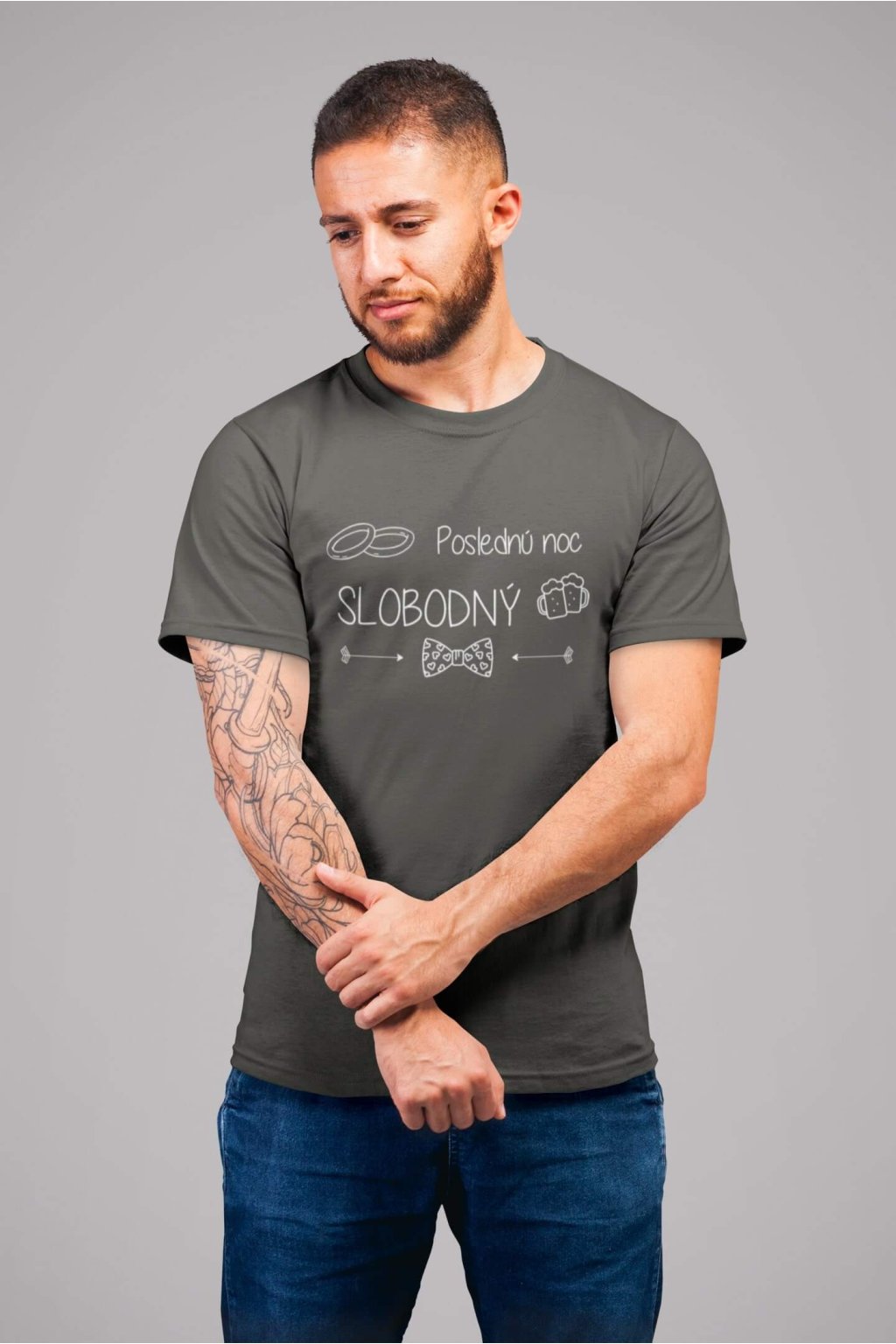 Pánske bavlnené tričko so štýlovou potlačou so svadobnou tématikou a nápisom "Poslednú noc slobodný". Tričko je vhodné ako darček pre ženícha.