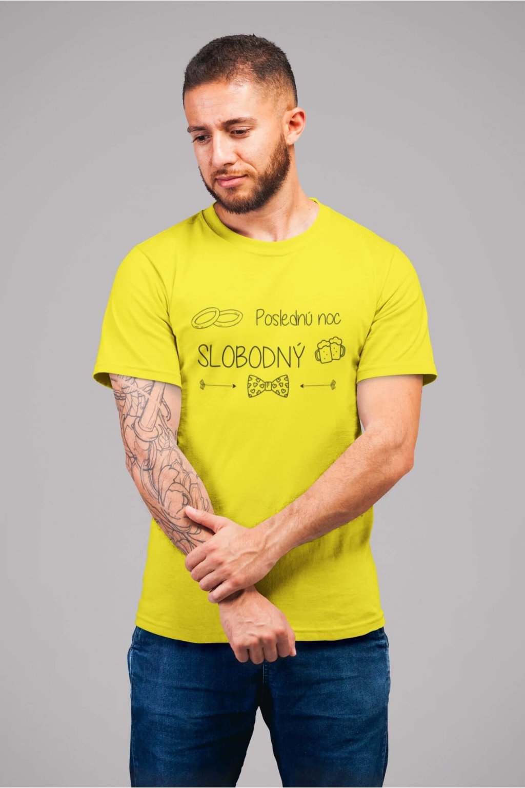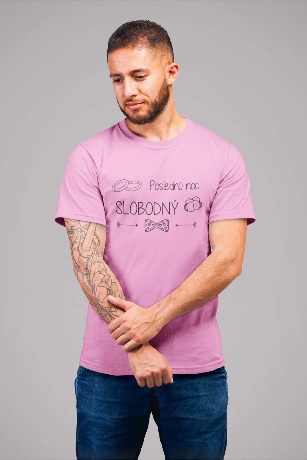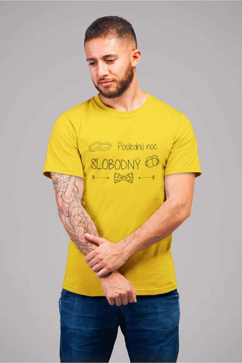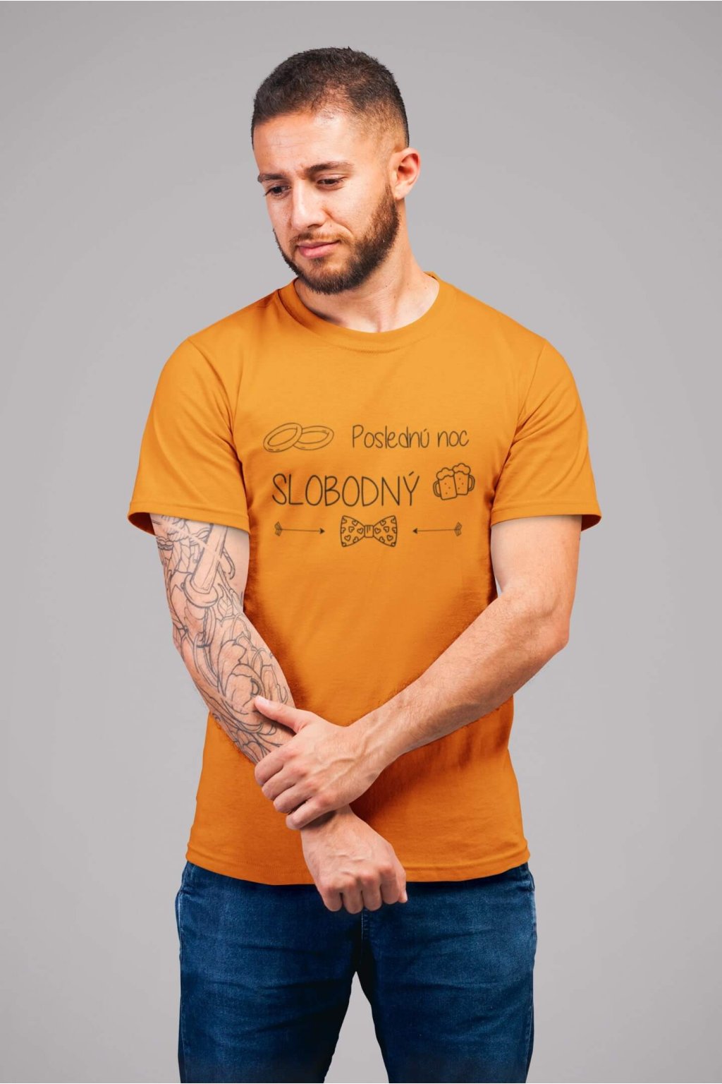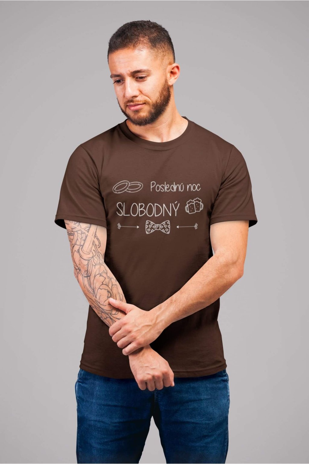 Pánske bavlnené tričko so štýlovou potlačou so svadobnou tématikou a nápisom "Poslednú noc slobodný". Tričko je vhodné ako darček pre ženícha.