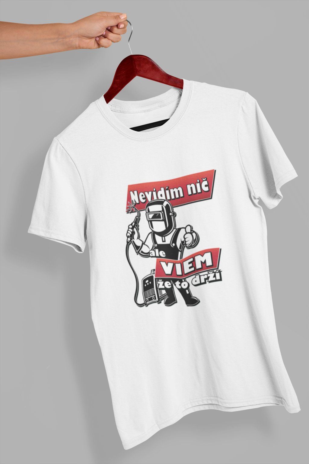 Pánske bavlnené tričko s krátkym rukávom a s nápisom pre milovníkov svojho povolania, tj. pre každého zvárača. Na tričku je nápis: ,,Nič nevidím. Ale VIEM že to drží". Tričko je ideálnym darčekom pre zvárača.