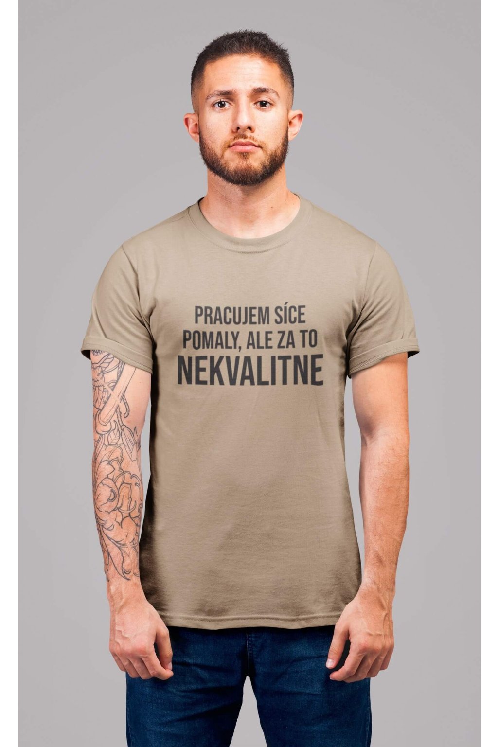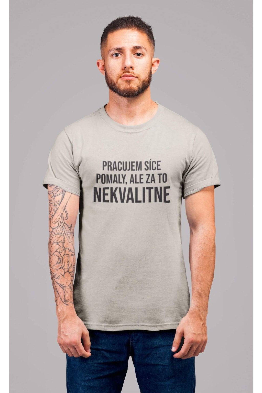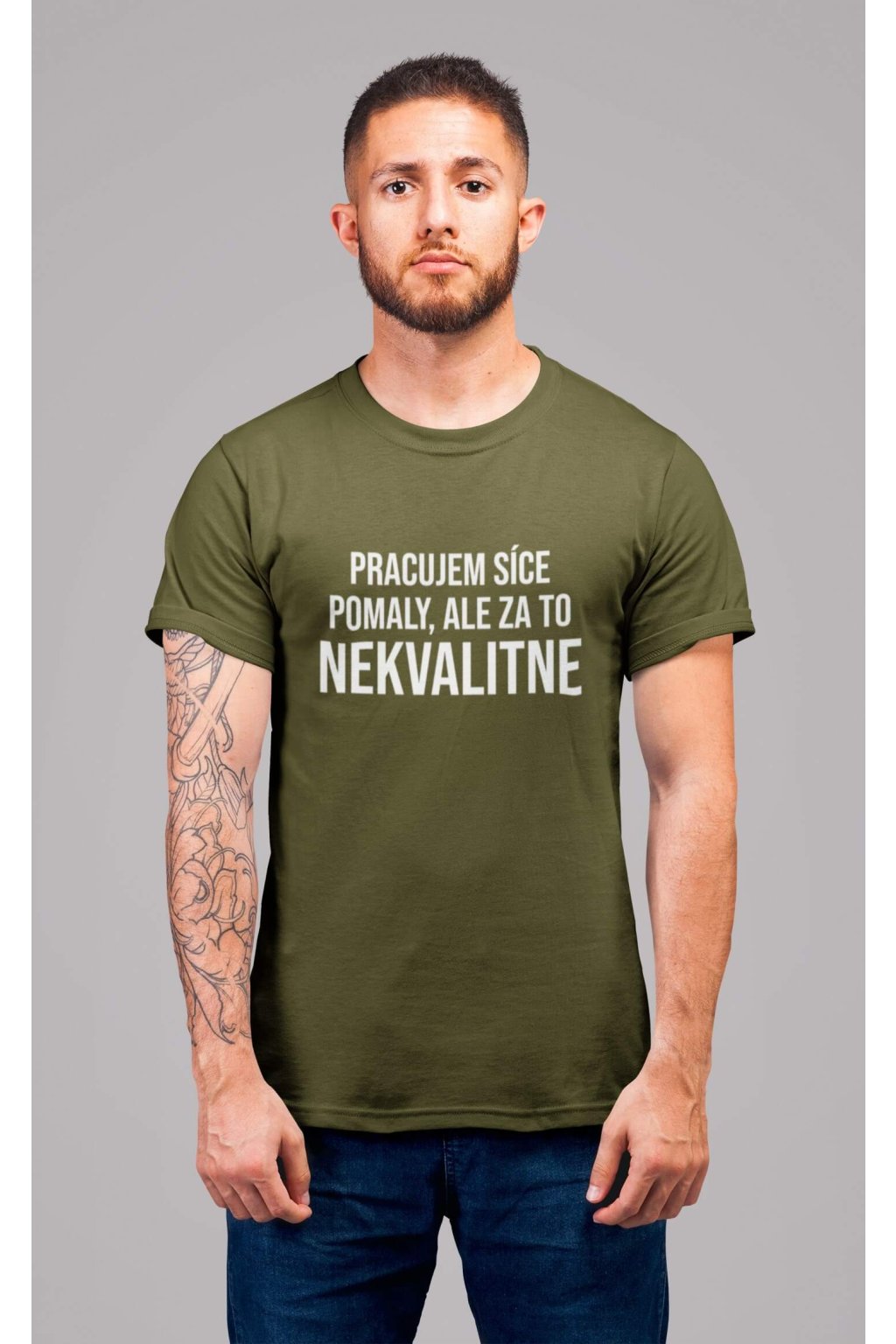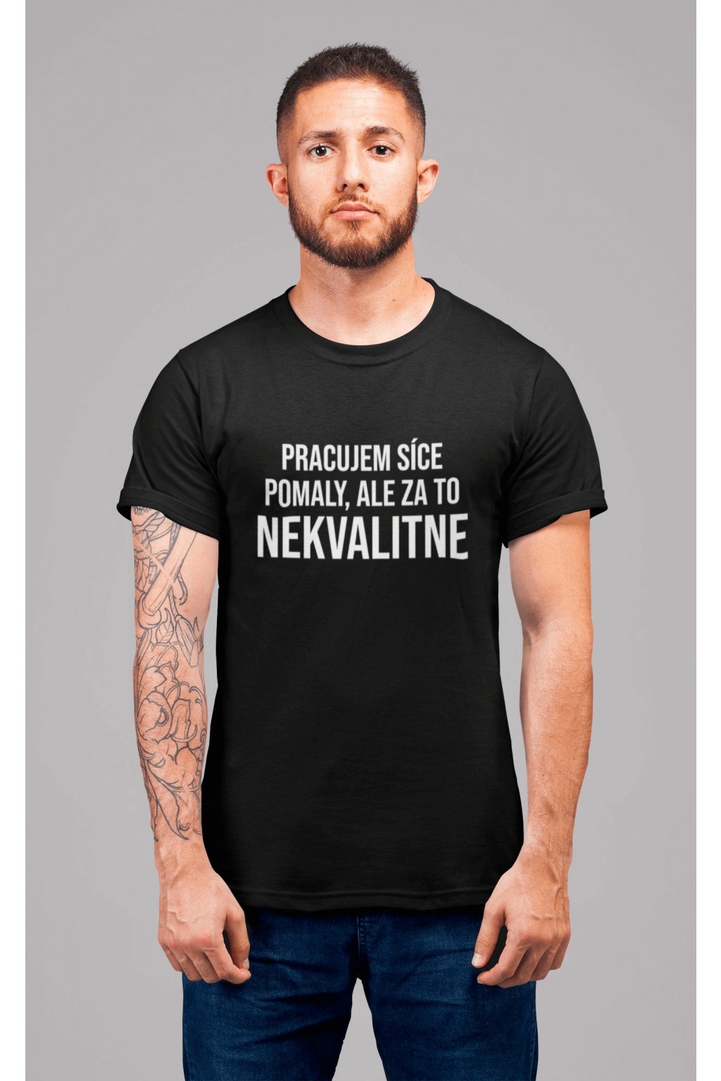 Pánske bavlnené tričko s krátkym rukávom a vtipnou potlačou. Na tričku je nápis "PRACUJEM SÍCE POMALY, ALE ZA TO NEKVALITNE."