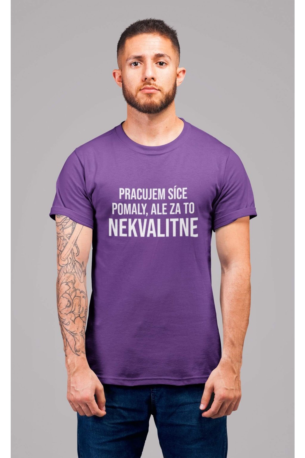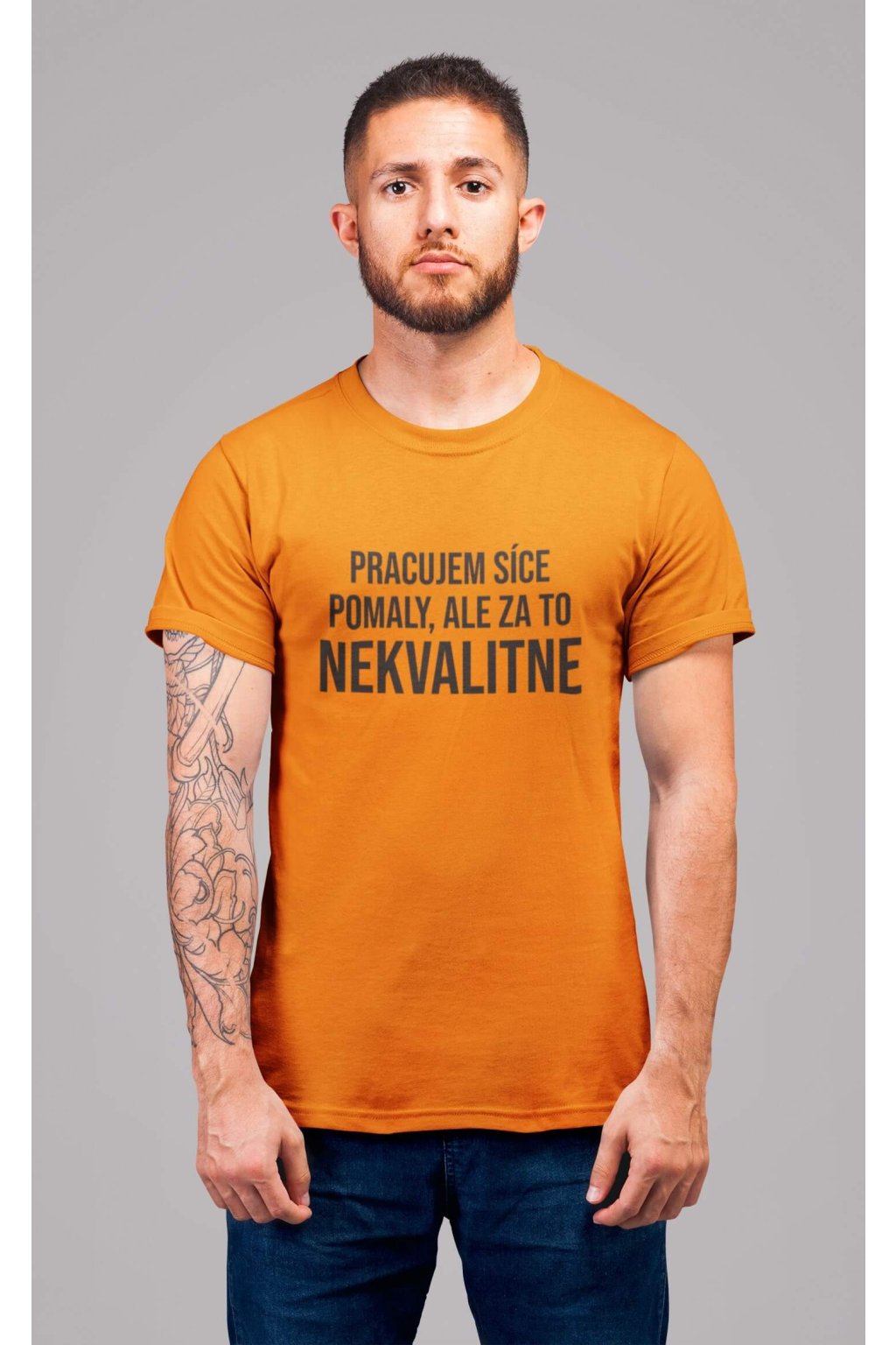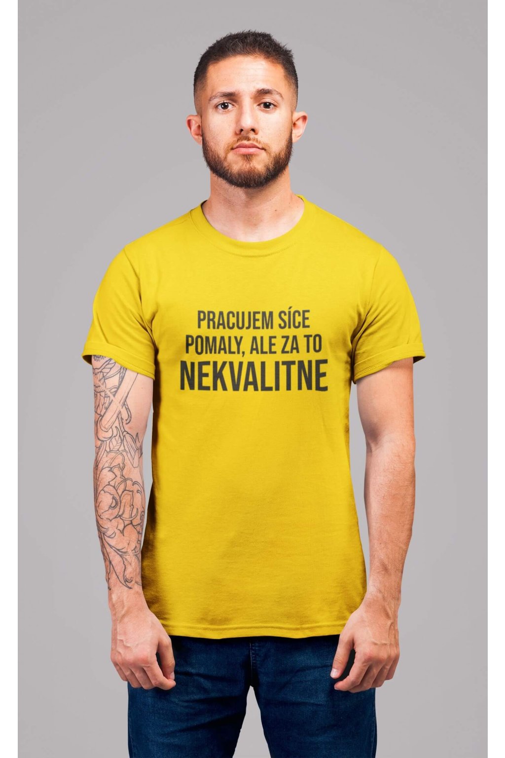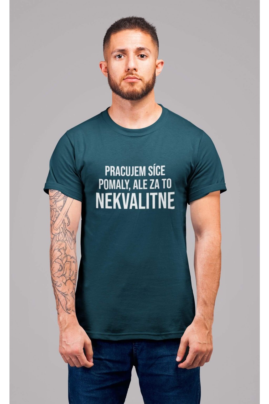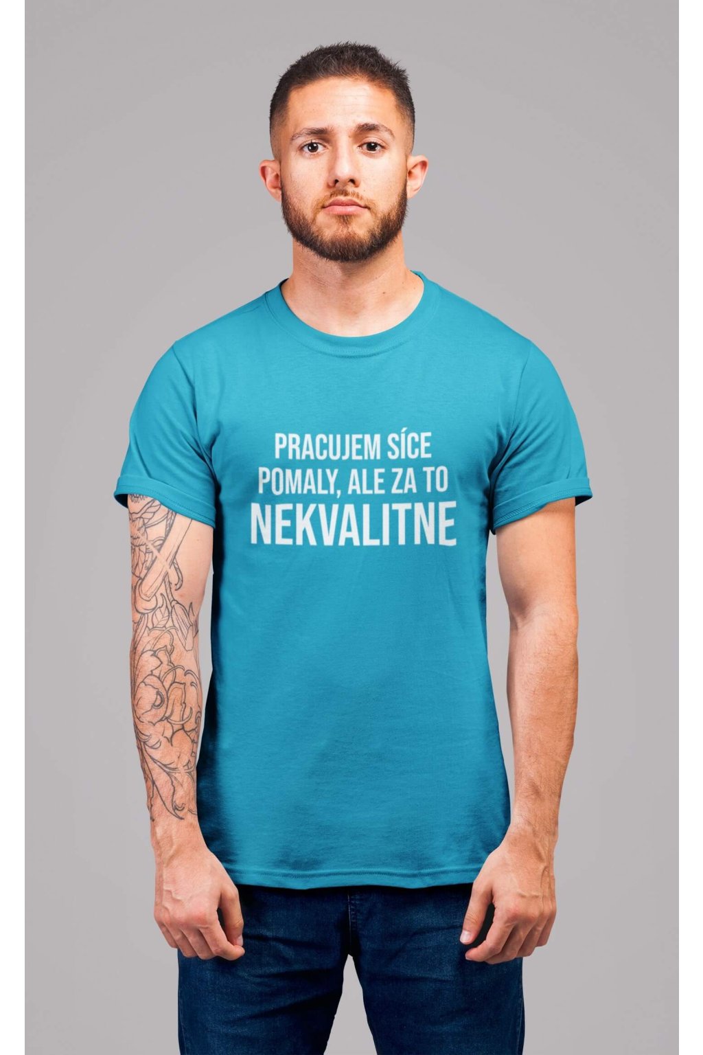 Pánske bavlnené tričko s krátkym rukávom a vtipnou potlačou. Na tričku je nápis "PRACUJEM SÍCE POMALY, ALE ZA TO NEKVALITNE."