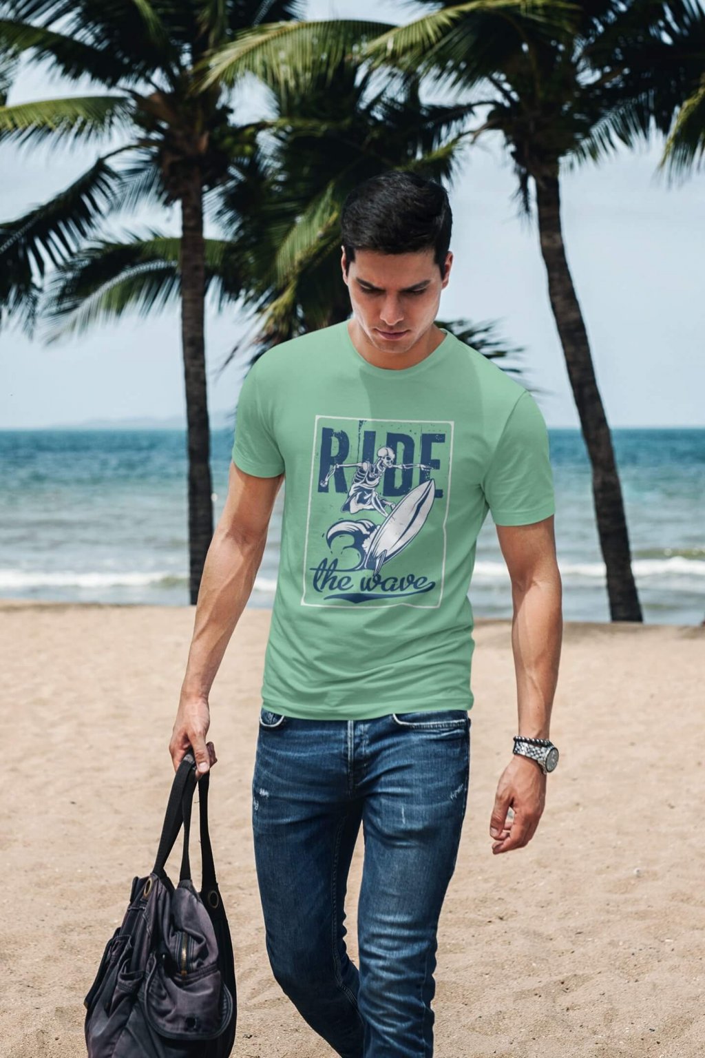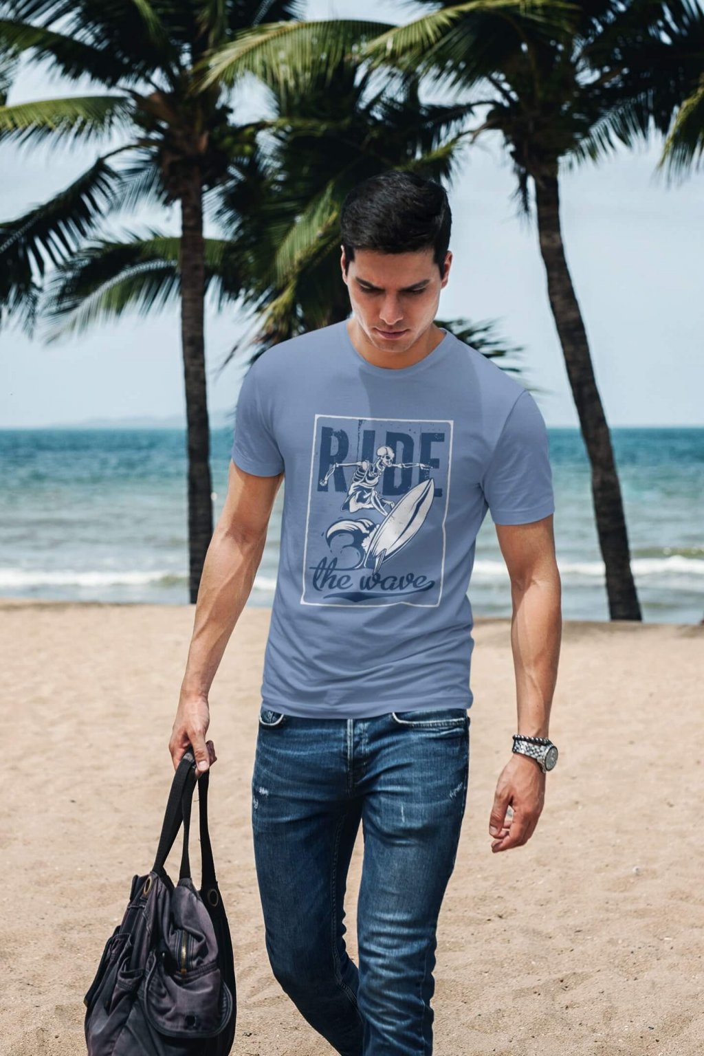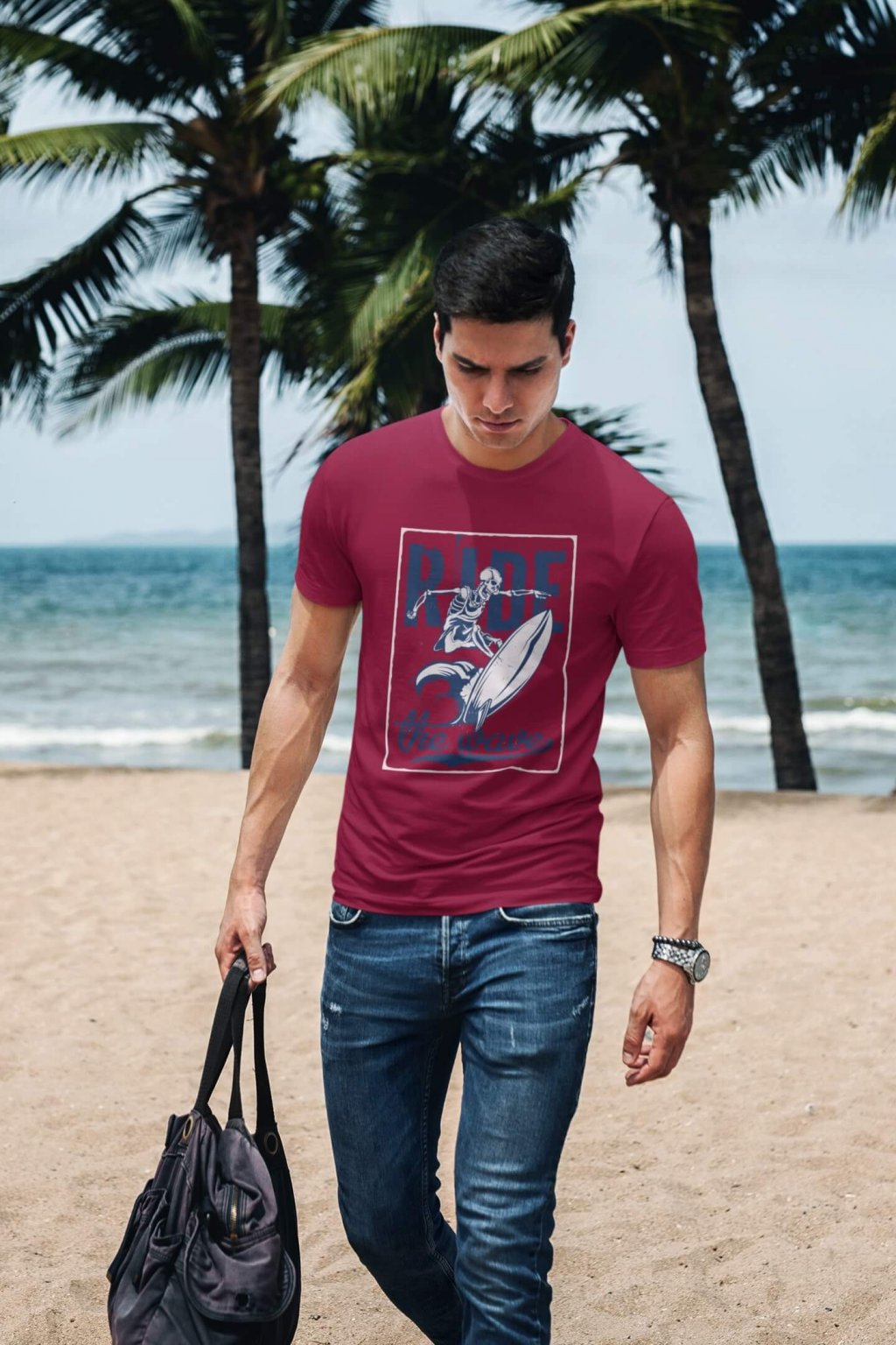 Pánske bavlnené tričko s krátkym rukávom a so štýlovou potlačou Ride the wave. Na obrázku je kostra na surfe.
