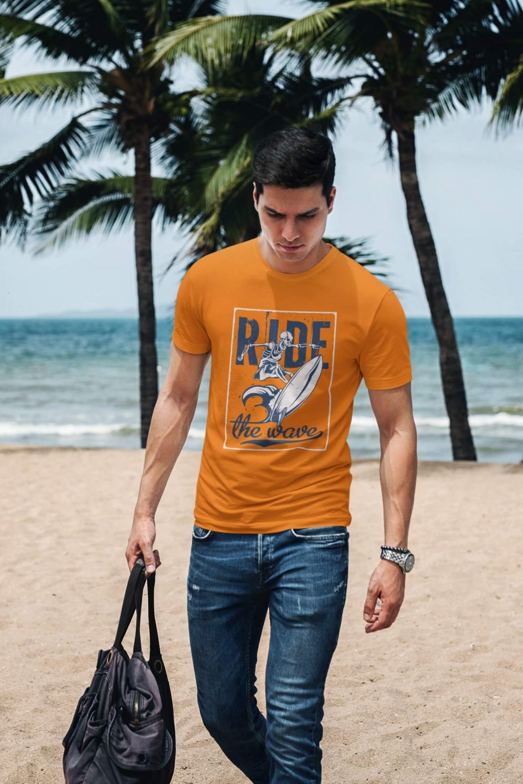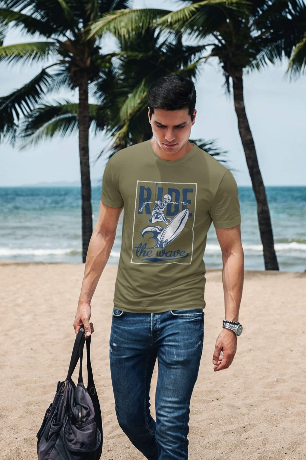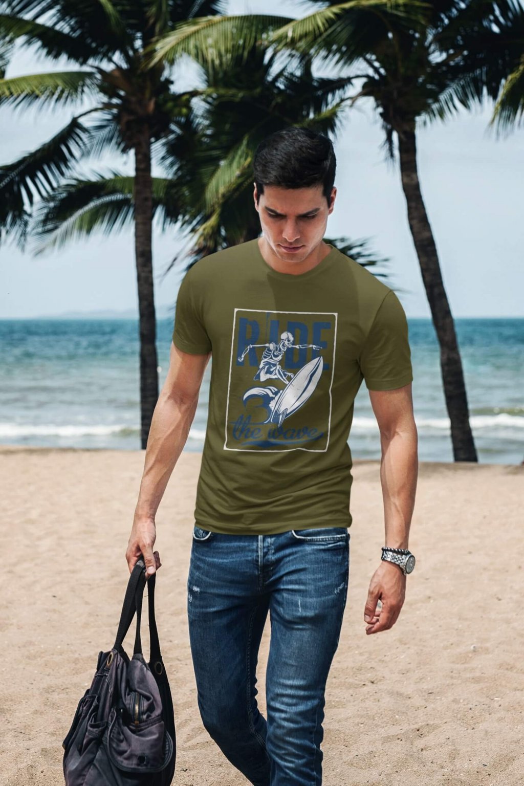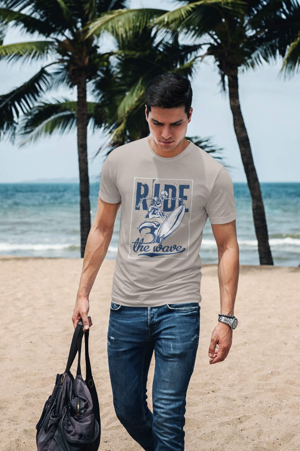 Pánske bavlnené tričko s krátkym rukávom a so štýlovou potlačou Ride the wave. Na obrázku je kostra na surfe.