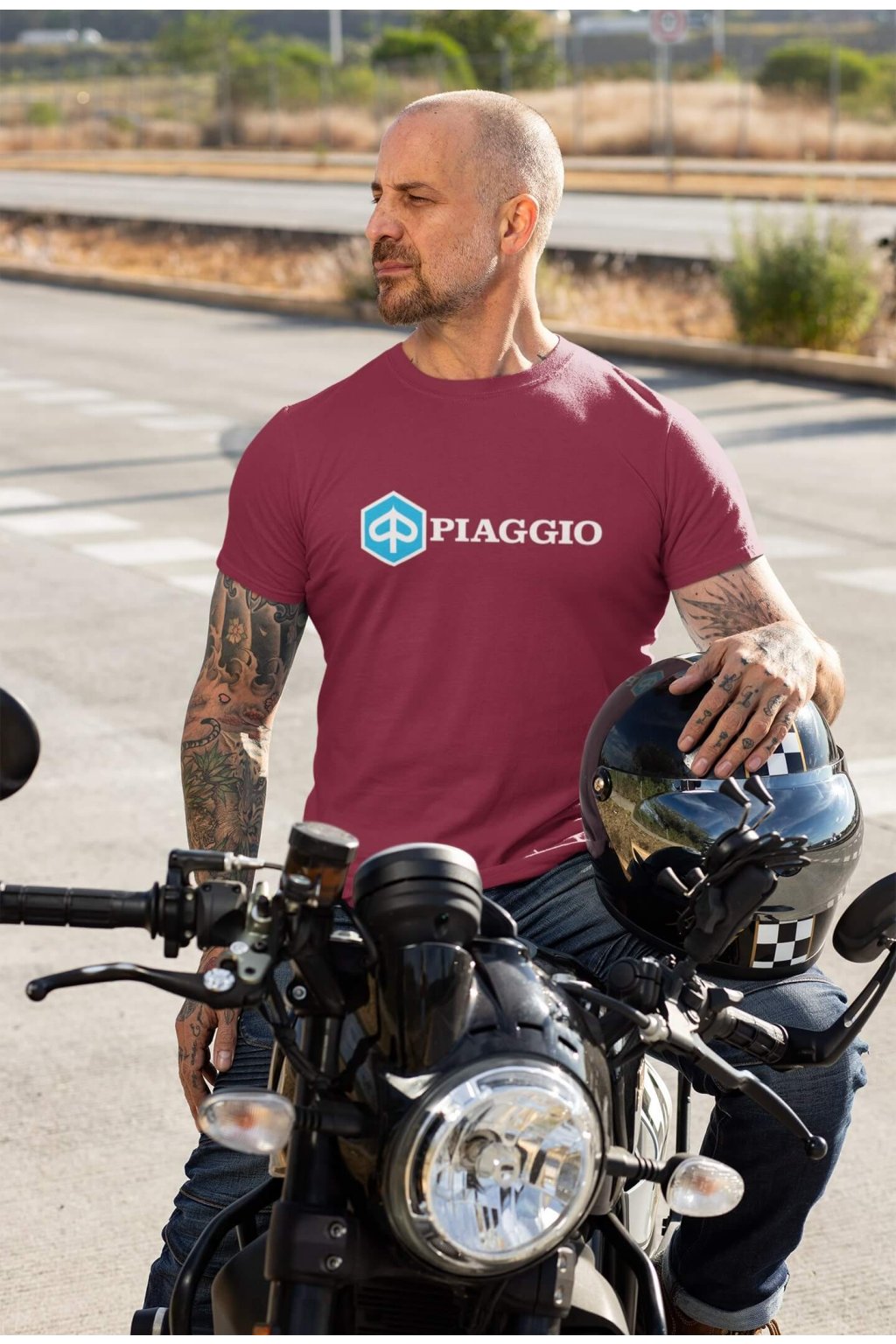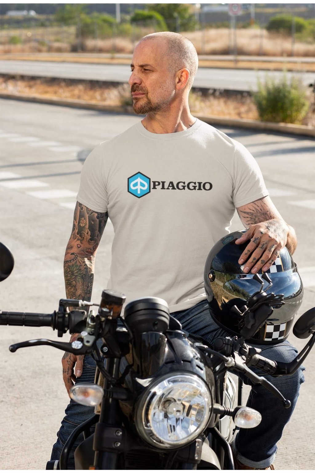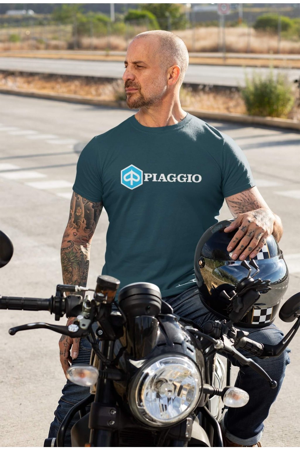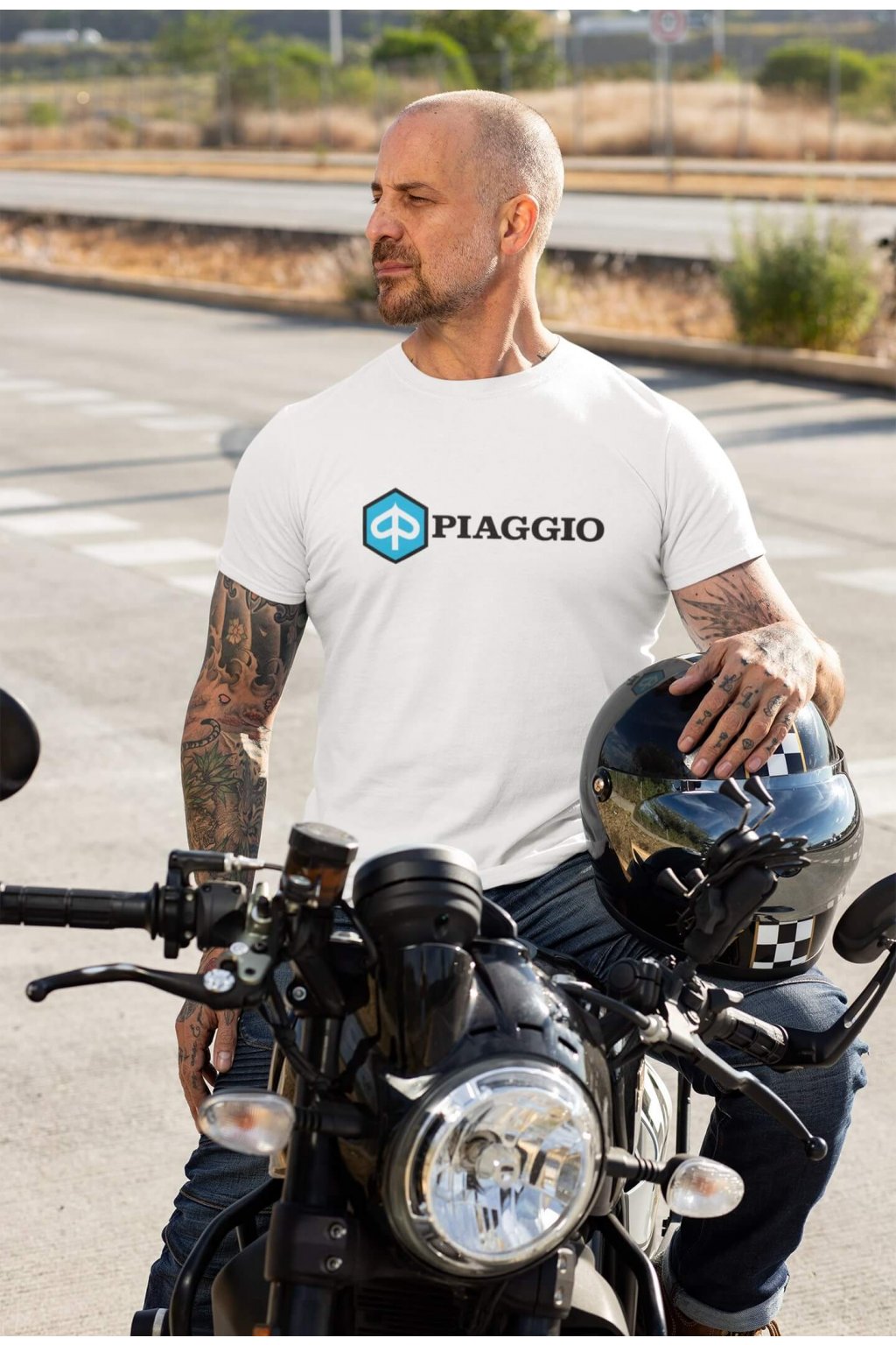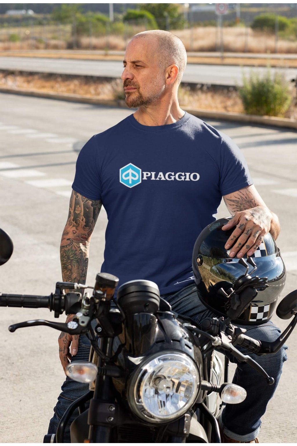 Pánske bavlnené tričko s krátkym rukávom, na ktorom je logo Piaggio. Tričko je vhodné pre milovníkov motoriek.