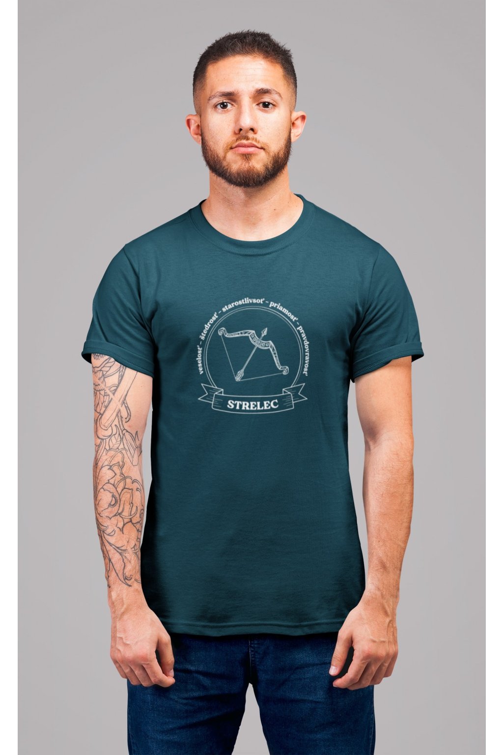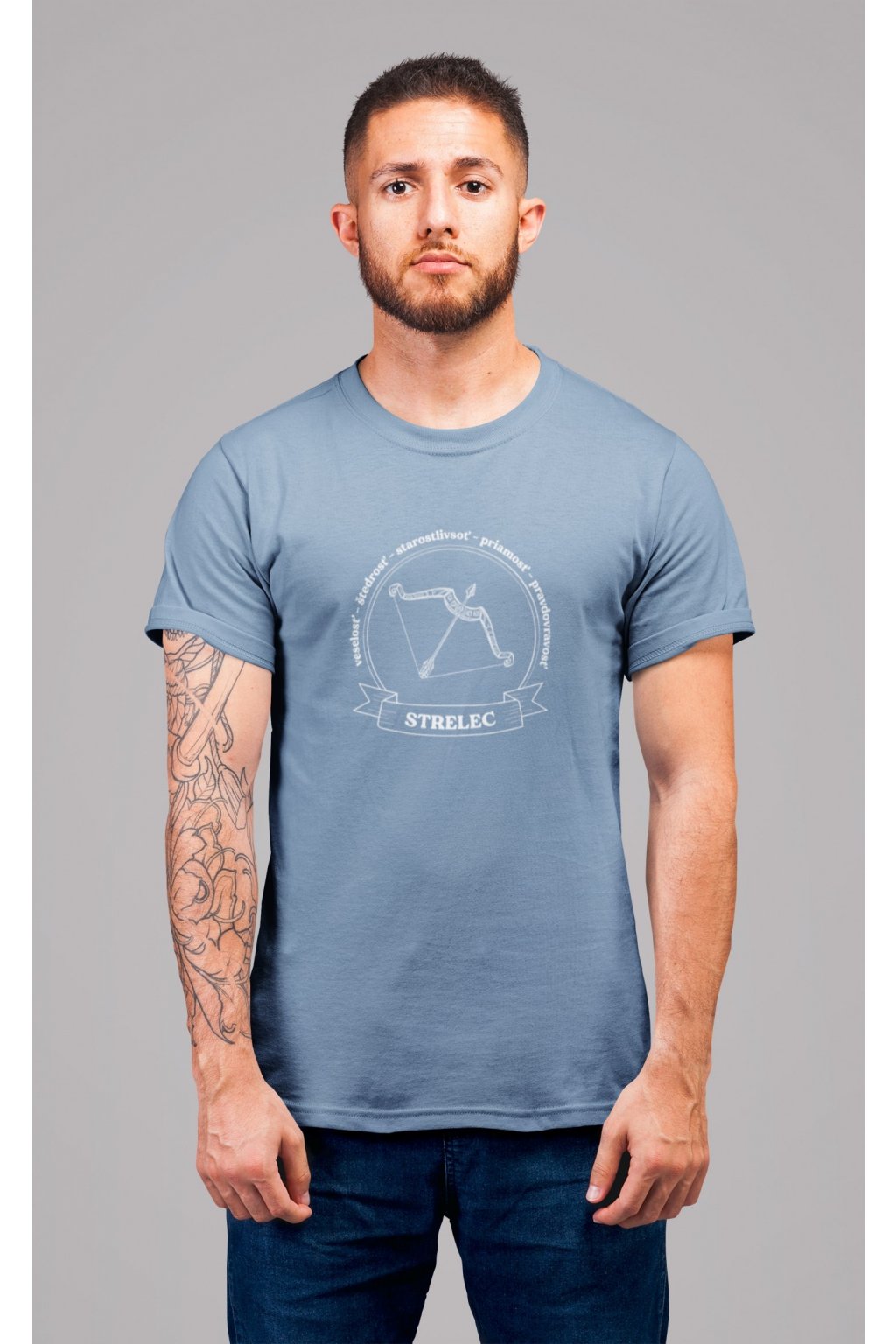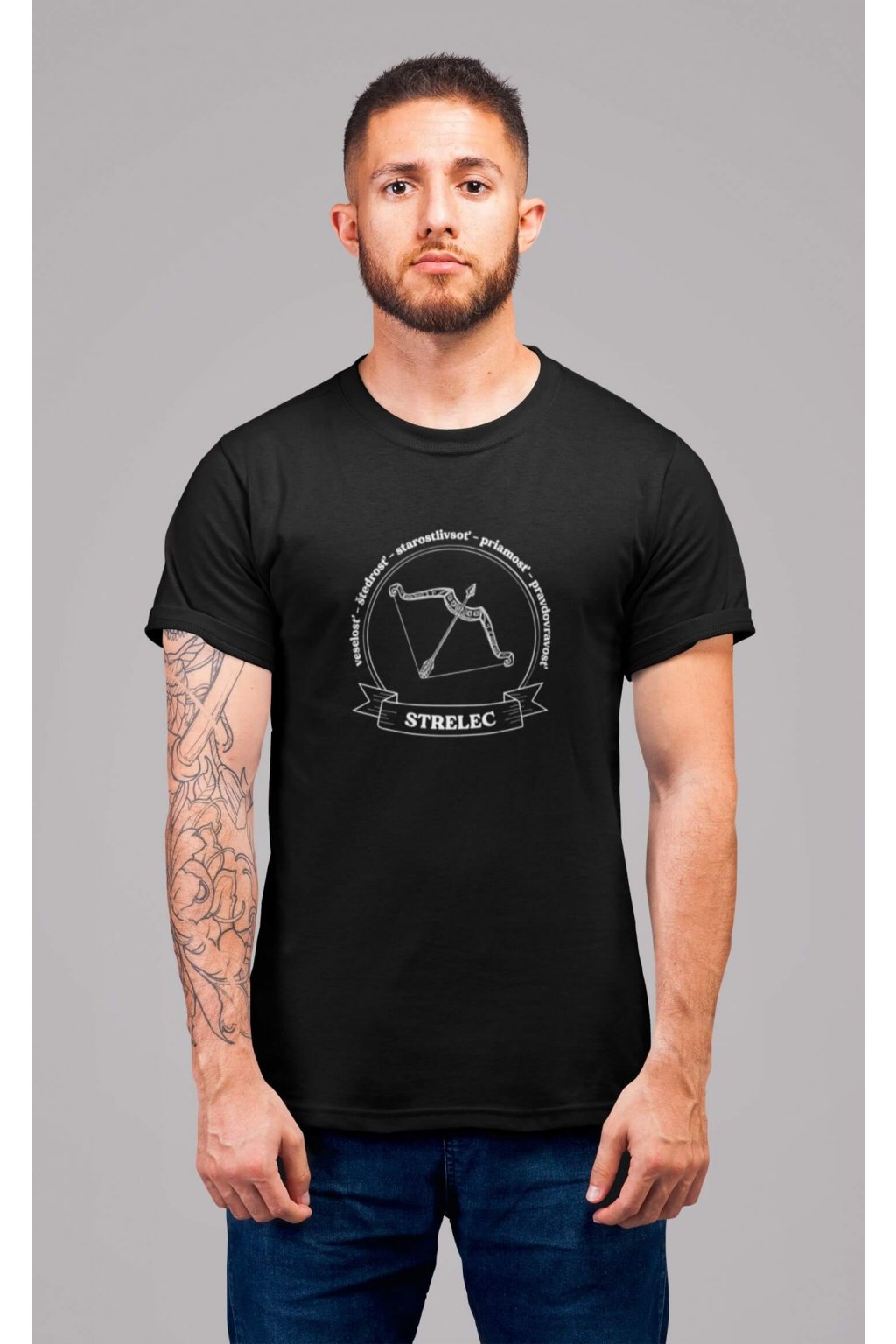 Pánske bavlnené tričko s krátkym rukávom s motívom znamenia STRELEC a opisom jeho vlastností.