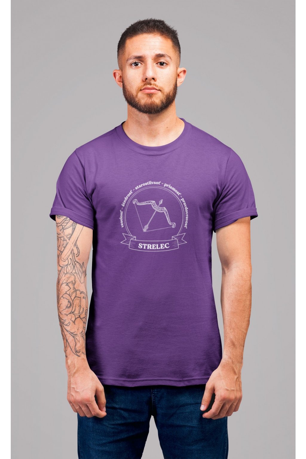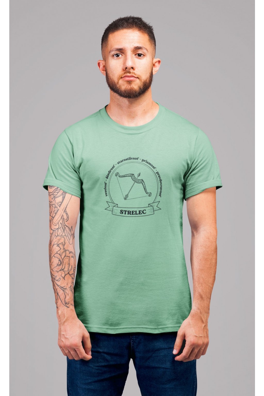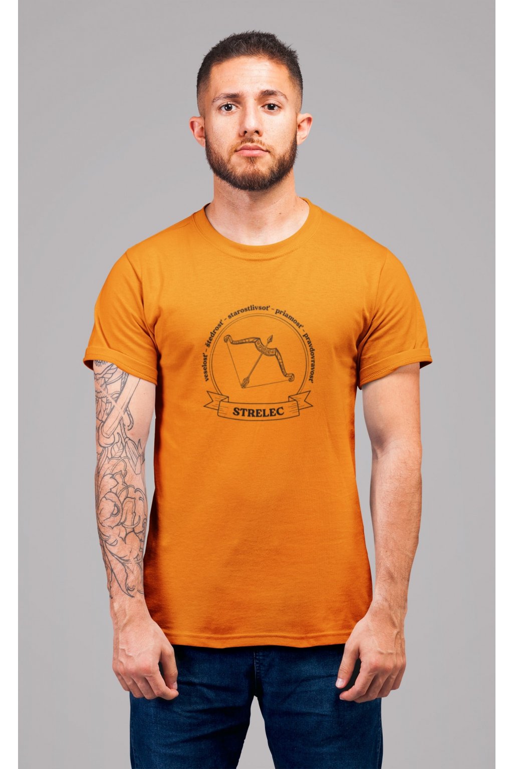 Pánske bavlnené tričko s krátkym rukávom s motívom znamenia STRELEC a opisom jeho vlastností.