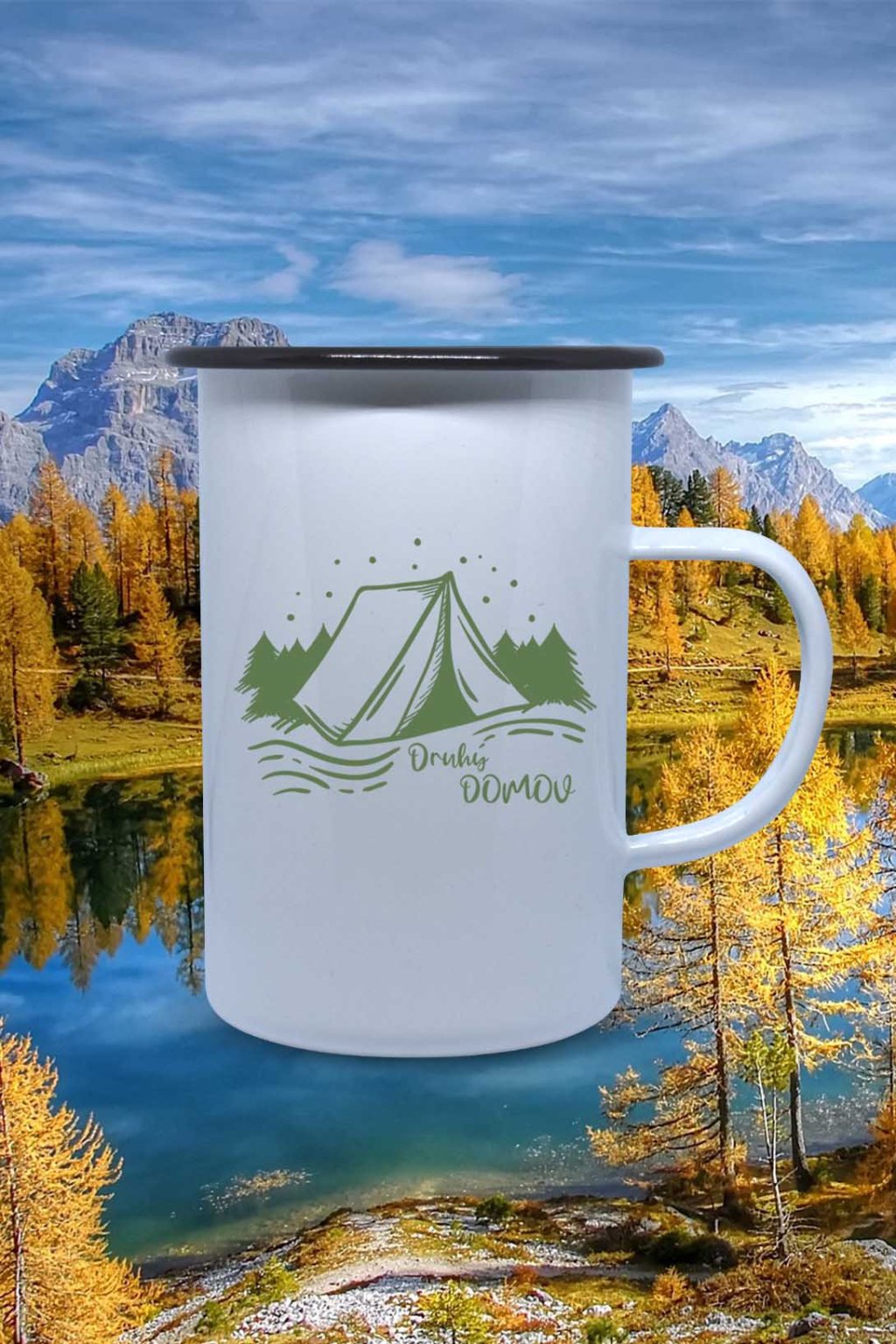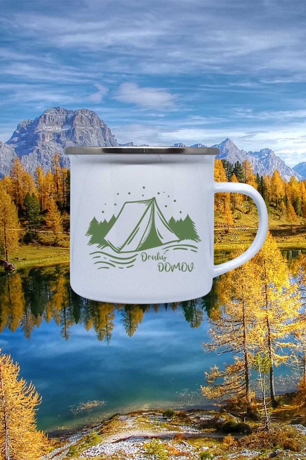 Plechový hrnček, na ktorom je obrázok s motívom prírody a stan, pod ktorým ja nápis: ,,Druhý DOMOV." Plecháčik je ako stvorený pre každého milovníka turistiky.