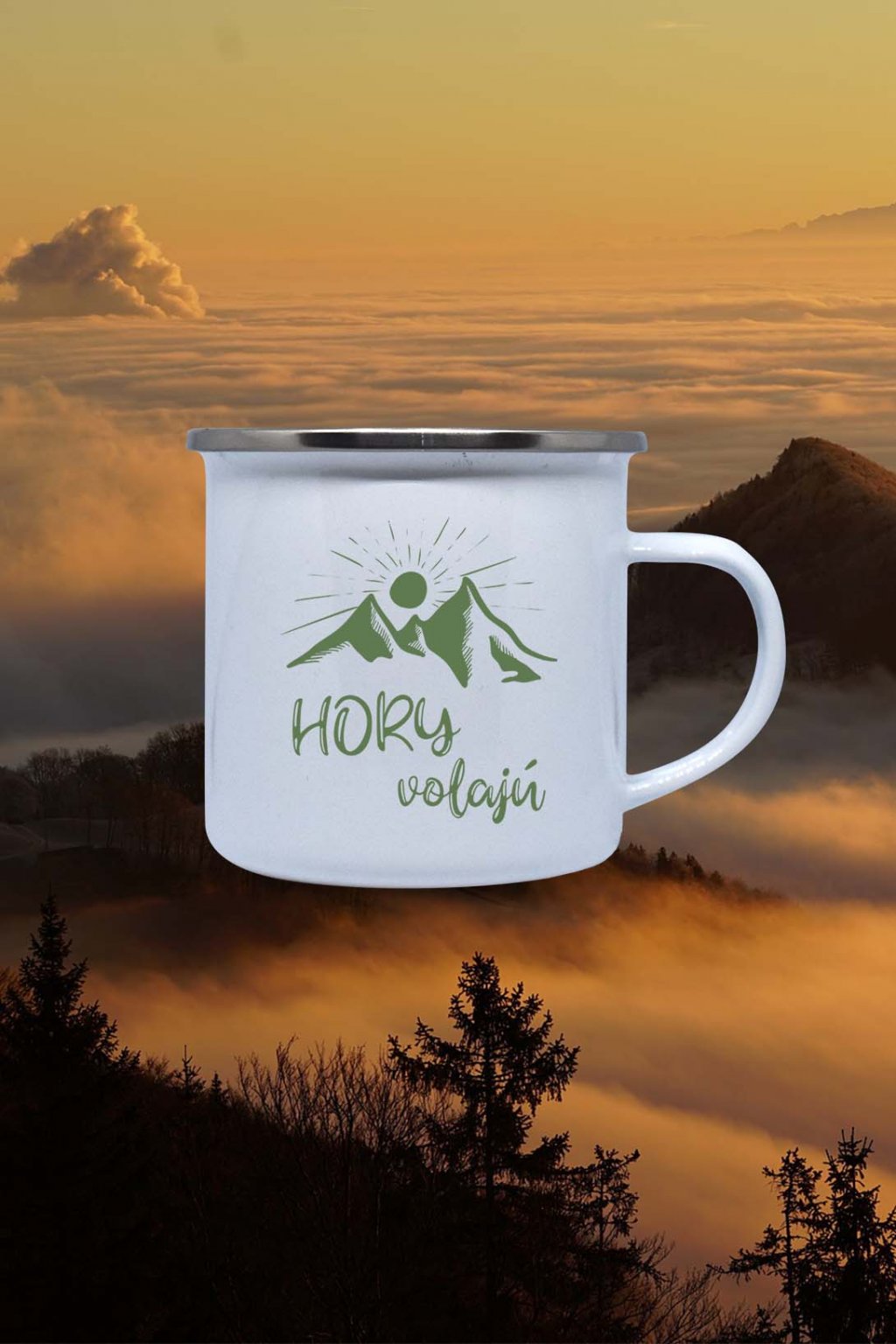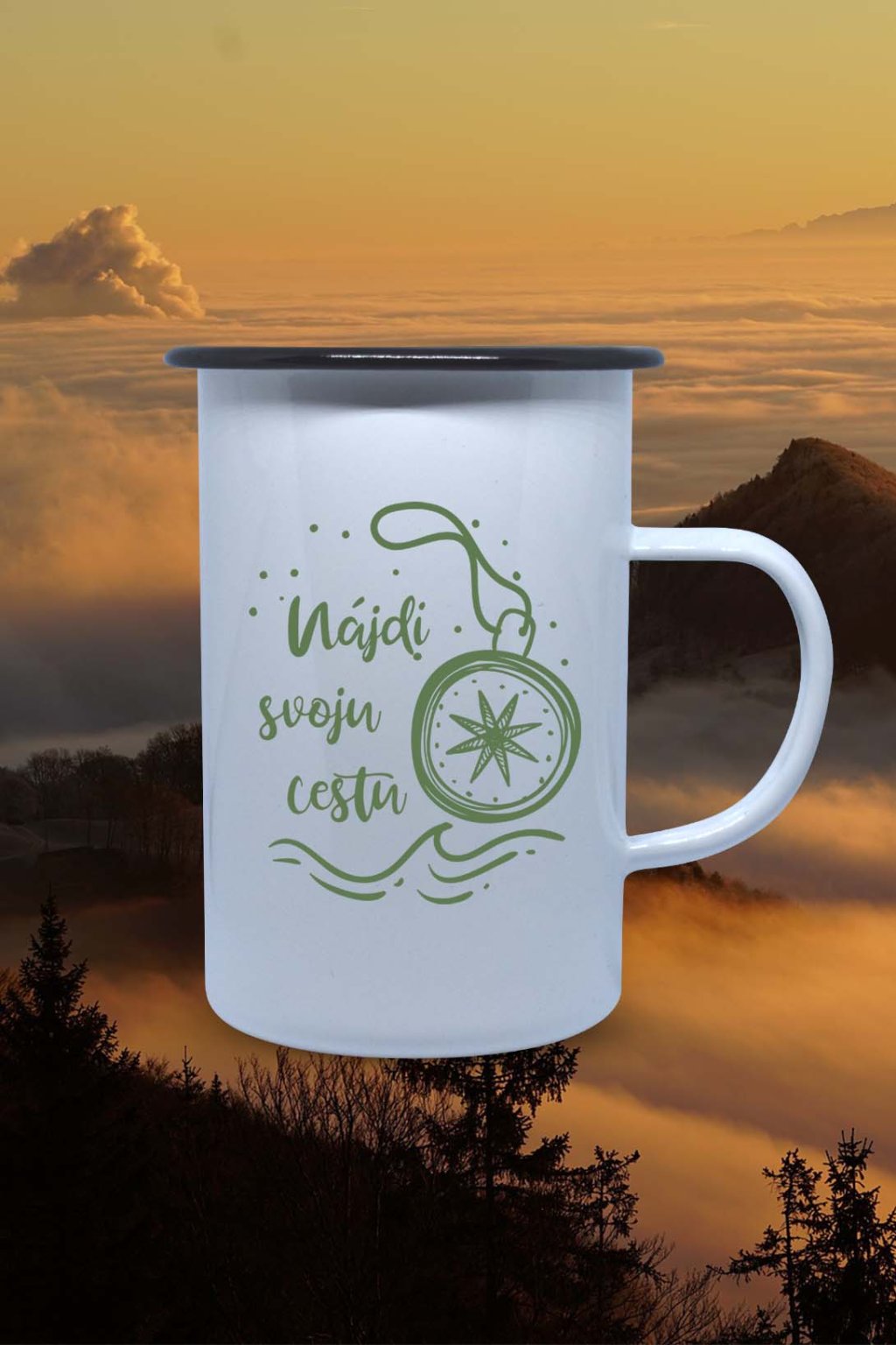 Plechový hrnček, na ktorom je obrázok s motívom prírody a kompas, vedľa ktorého ja nápis: ,,Nájdi svoju cestu." Plecháčik je ako stvorený pre každého milovníka turistiky.